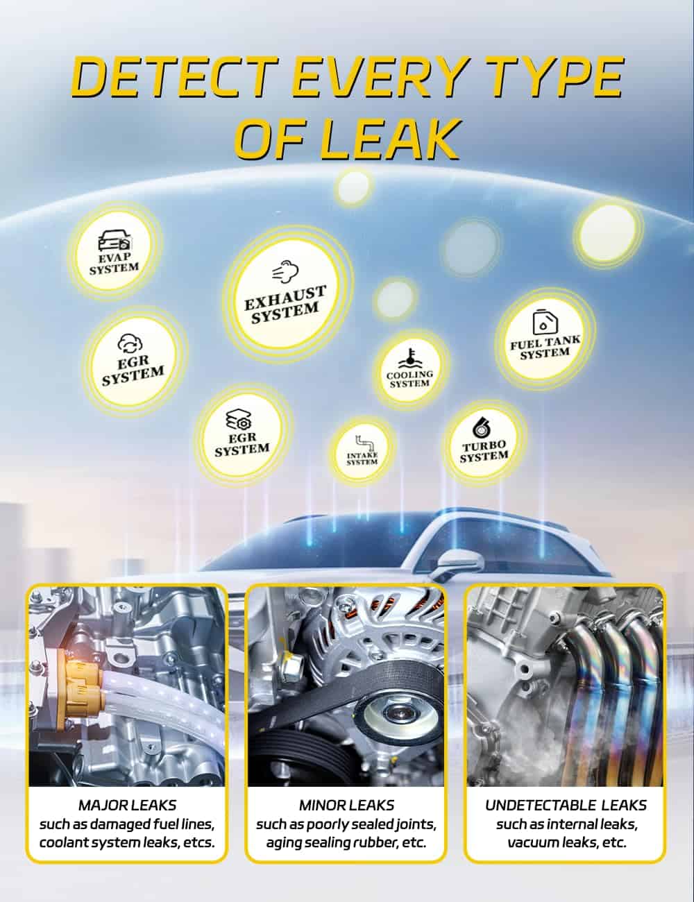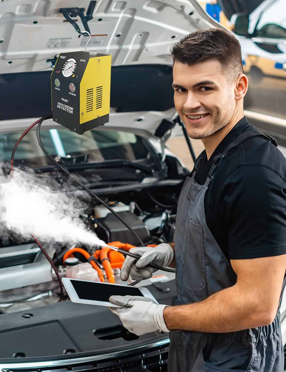 Cuando tu automóvil tiene mala hermeticidad, no puede mantener el calor, está polvoriento, no es insonorizado y no es impermeable; cuando el sistema de admisión de aire tiene fugas y causa una admisión de aire insuficiente al motor del automóvil; cuando una instalación incorrecta provoca huecos en el tanque de combustible y la tubería, y el sistema de tanque de combustible tiene fugas. ¡No te preocupes, nuestro detector de fugas de humo para autos te ayudará a encontrar problemas y resolverlos rápidamente!