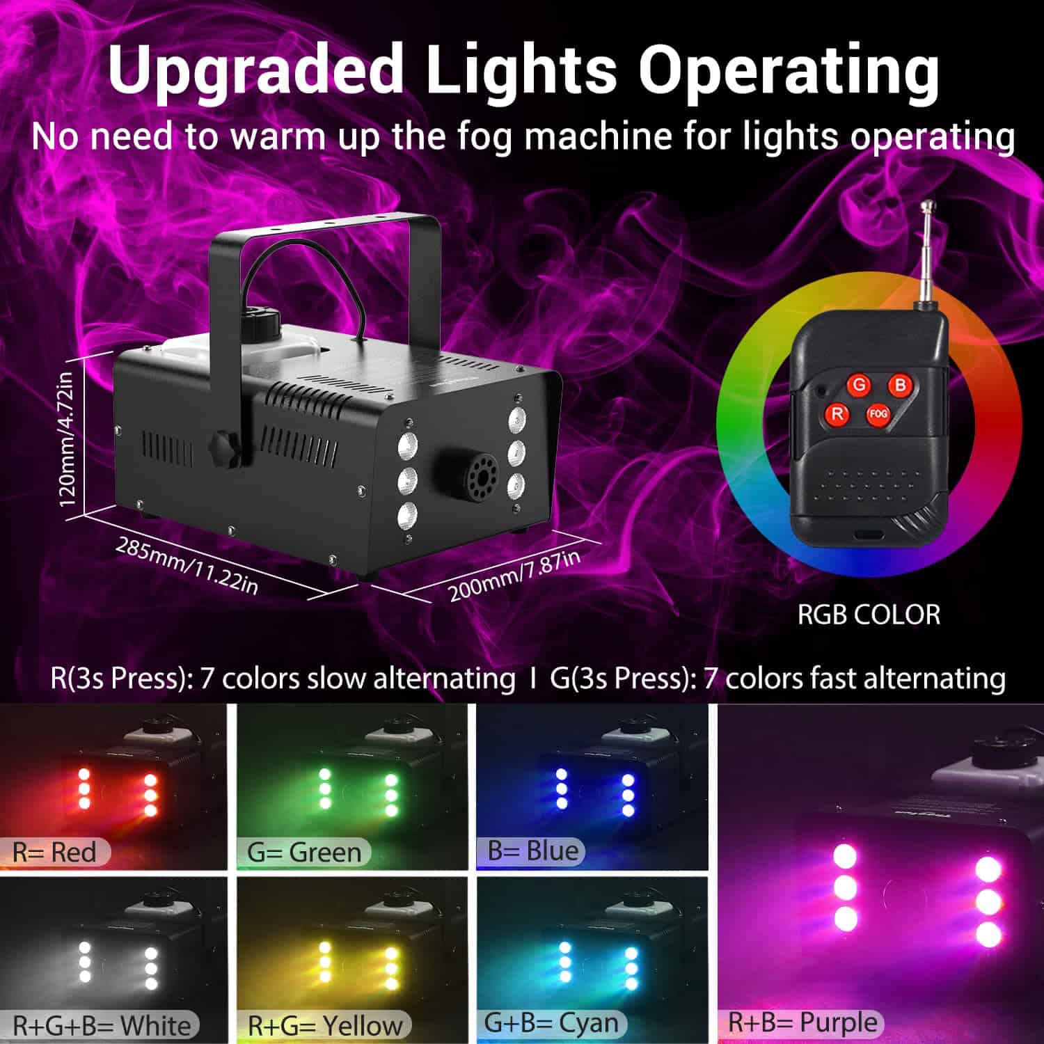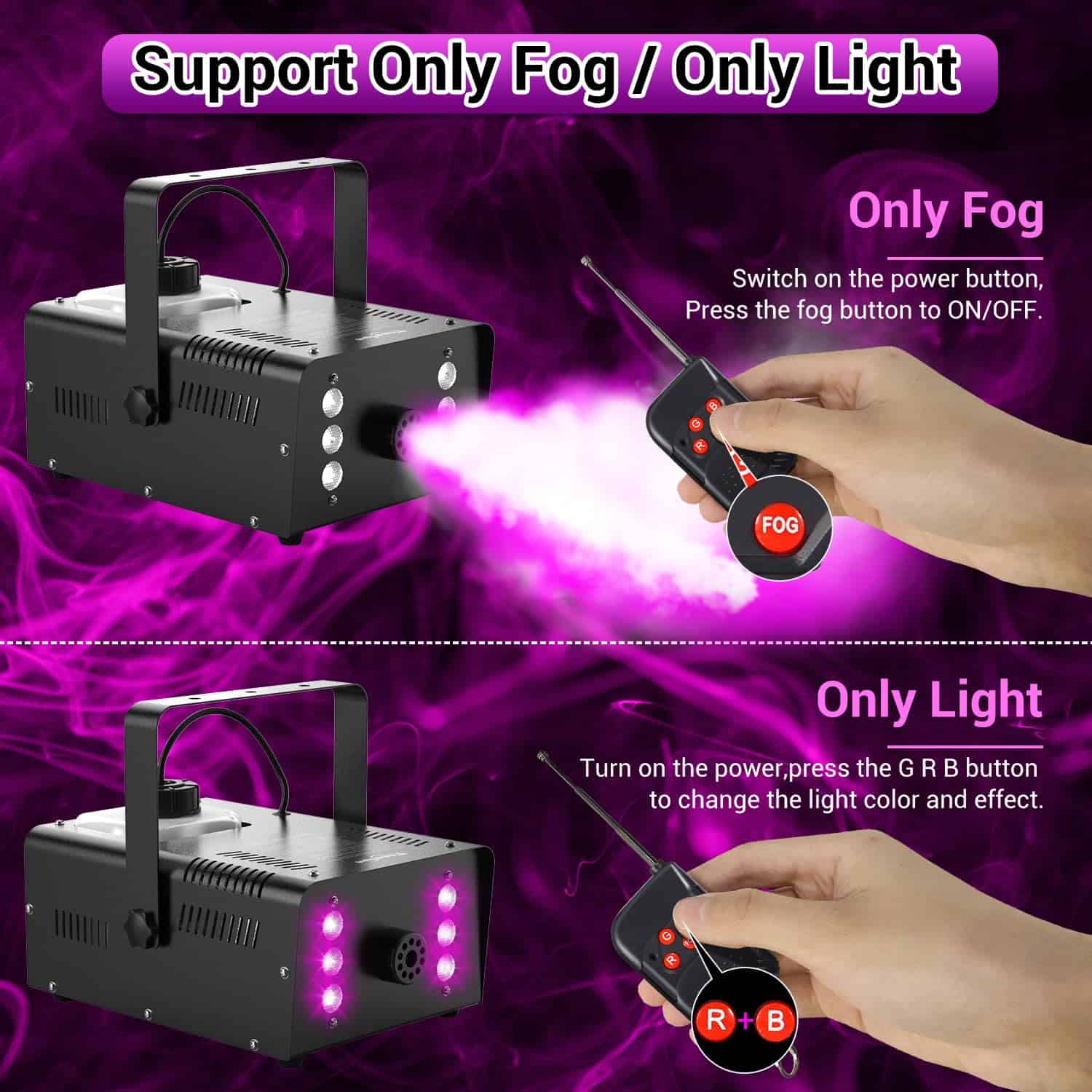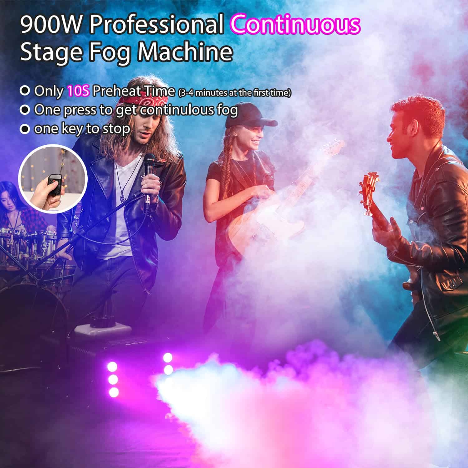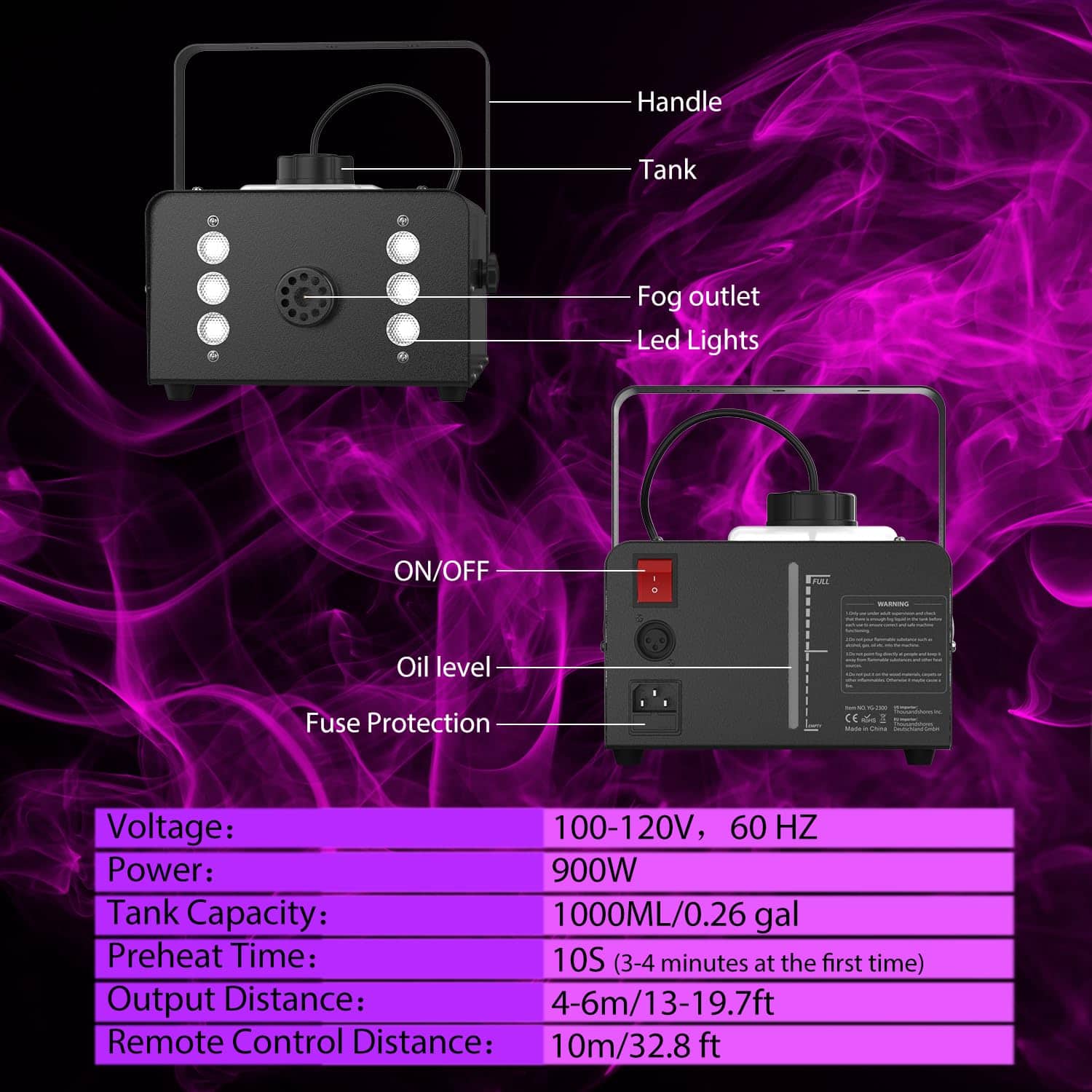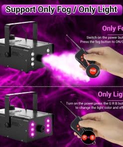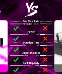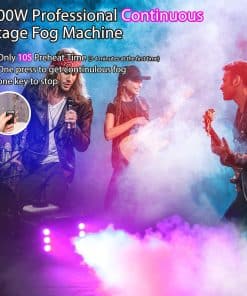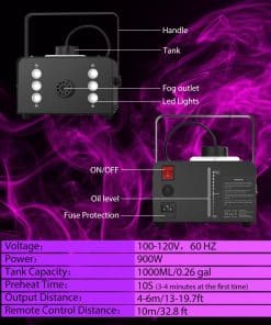 Theefun 900W máquina de humo está equipada con un chip de control de temperatura constante que garantiza que la máquina solo tome 10 segundos para precalentar y producir hasta 60 segundos de humo continuo no perfumado y puro, luego la máquina de humo se calentará automáticamente nuevamente para el siguiente ciclo de 60 segundos de rociado de humo con una salida de 4000 CFM (pies cúbicos por minuto) y una distancia de 4-6 m, lo que hace que este generador de humo Theefun se destaque entre otras máquinas de humo de baja potencia que requieren un largo tiempo de espera para precalentar antes de cada rociado. Además, la máquina viene con un tanque de 1000 ml que permite una generación de humo continua por mucho tiempo. Perfecta para fiestas, escenarios, bodas, conciertos en vivo, DJ, reuniones familiares, karaoke, etc. La máquina de humo es duradera y fácil de transportar gracias a su asa portátil y ligera de aluminio que mejora la disipación de calor para una mayor vida útil. Además, cuenta con protección doble: un sensor de control de temperatura que apaga automáticamente la máquina en caso de temperatura excesiva y protección de fusible en caso de sobrecarga de voltaje para mantener la seguridad.