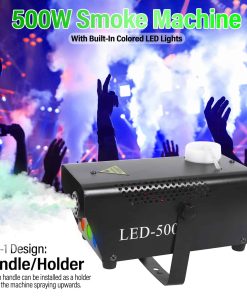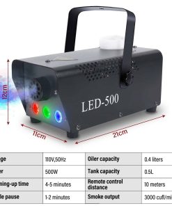 Característica: – Humo fuerte y de gran alcance con un rango de alcance lejano, pulverización de humo sostenible – Esta máquina de humo necesita aceite de humo para funcionar, el aceite de humo no está incluido. – Equipado con soporte de suspensión, fácil de instalar y usar. – Hay 3 luces LED que mejorarán tu visión de humo. – Luz LED, puede hacer que el humo se ilumine con un colorido color – Adecuado para escenario, bar de bodas, habitaciones KTV, bar diy, baile familiar, fiestas de ocio, fiestas de cumpleaños, celebración de fiestas y otros lugares. – Si llenas de aceite de humo y haces erupción en humo continuo, el humo se agotará después de una hora Instalación y uso: – Uso en interiores, de acuerdo con el voltaje nominal para usar, no sobrepasar la presión. – Retira todo el embalaje, abre la tapa y coloca el aceite de alta calidad, no una máquina vacía. – Antes de encender, es necesario calentar durante 4-5 minutos, presiona cualquier tecla para usar el control remoto – Utiliza aceite de tabaco de alta calidad, limpieza regular de la máquina, manteniendo el flujo de aceite, aumentando la vida útil de la máquina. – La boquilla de niebla tiene una temperatura muy alta, no toques, cuando esté en uso, mantén a un metro de distancia de materiales no inflamables. Nota: Un ligero olor a quemado es normal, en el medio habrá una pausa de 1-2 minutos en la unidad de calentamiento, más de 20 segundos para continuar usando. Especificaciones: Nombre del producto: Máquina de humo Color: Negro Voltaje: 110V, 50Hz Tiempo de calentamiento: 4-5 minutos Pausa intermedia: 1-2 minutos Tiempo de humo continuo: 20 segundos Potencia: 500W Capacidad del depósito de aceite: 0.4 litros Capacidad del tanque: 0.5L Salida de humo: 3000 cufl/min Distancia de salida: 2.5m Controlador: Control remoto inalámbrico a 10 metros Clase de protección: IP20 Tipo de fuente de luz: LED Incluido en el paquete: 1x Máquina de humo 1x Cable de alimentación 1x Caja de control 1x Control remoto 1x Asa 2x Tornillos de montaje 1x Manual de usuario