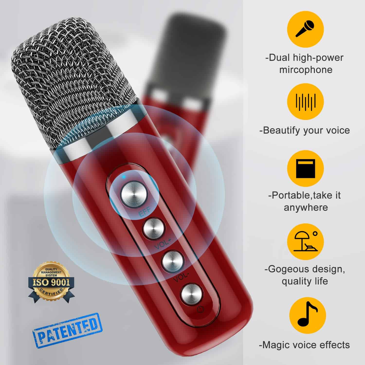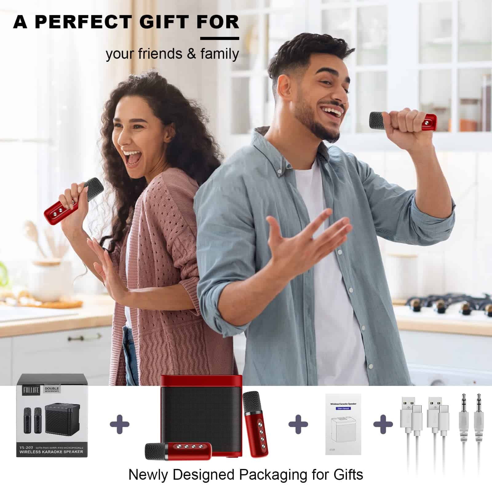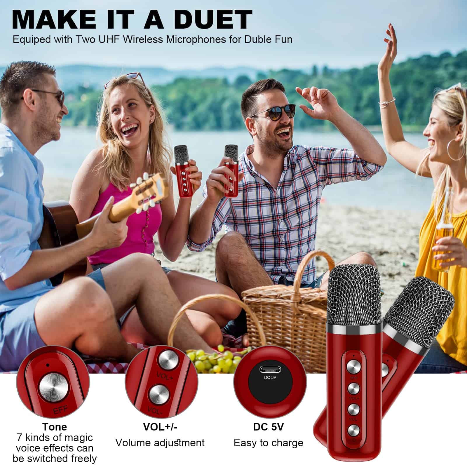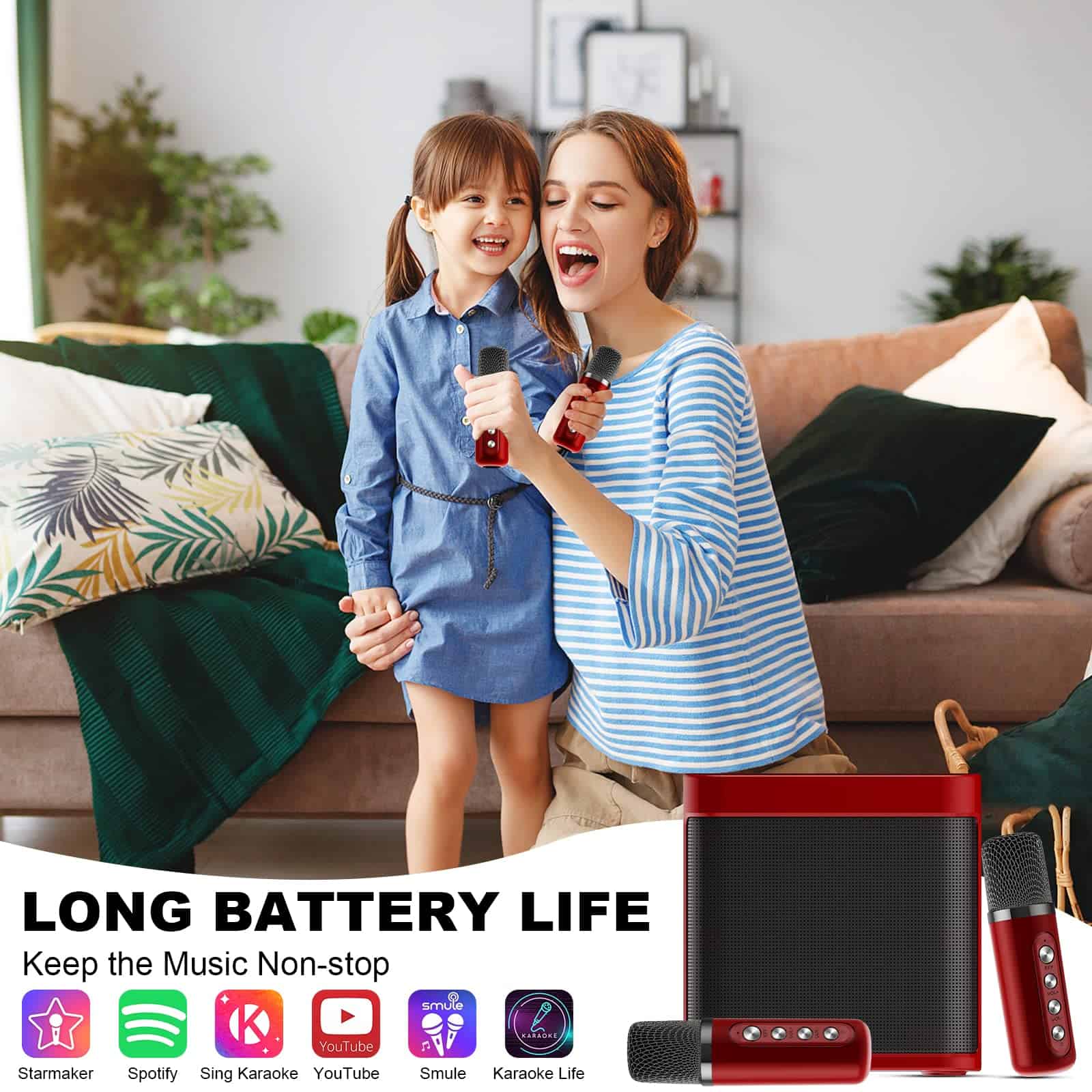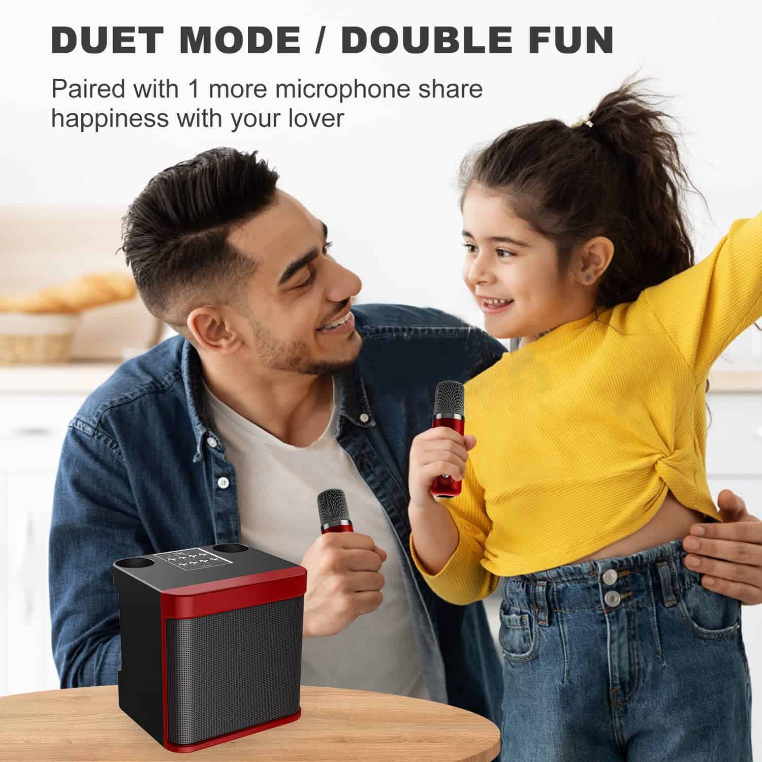 1. Tamaño pequeño con potente sistema de PA : La ÚLTIMA VERSIÓN 2024 del set de micrófono y altavoz es ligera, compacta y portátil. Con un tamaño de 6.3″ y un diseño ligero, es perfecto para personas que no quieren llenar su espacio vital. Equipado con un controlador de audio y un procesador de señal digital avanzado, el sonido es más preciso, moderado en volumen y equilibrado sin ruido. Ajuste el volumen presionando y manteniendo presionado el botón de volumen para lograr su volumen ideal. 2. Máquina de Karaoke Multi-función : Incorporada con el último chip Bluetooth 5.0 para transmisión inalámbrica, garantiza el emparejamiento instantáneo y proporciona una transmisión más estable y a una distancia más larga de hasta 49 pies. Este altavoz portátil con micrófono también admite la conectividad Micro TF card, Flash USB y AUX. Es compatible con teléfonos móviles Android, televisores, iPads, tabletas y PC. Además, el puerto USB permite la función de banco de energía para recargar su teléfono inteligente/tableta. 3. Cambie la voz de manera divertida : Dos micrófonos son esenciales para duetos y competencias de baile. Nuestra máquina de karaoke Bluetooth inalámbrica con 2 micrófonos tiene siete tipos de efectos de voz mágicos: original, monstruo, bebé, femenino, masculino y 2 mezclas, que pueden satisfacer más necesidades y brindar más diversión. El micrófono cambiador de voz es perfecto para karaoke en el automóvil, fiestas en casa, salones de clases, discursos y muchas otras ocasiones. 4. Larga duración de la batería : Este altavoz de karaoke incorpora una batería de iones de litio de alta eficiencia de 3000mAh, que garantiza música sin parar hasta 8 horas de tiempo de reproducción al 50% de volumen, y un micrófono incorpora una batería de iones de litio de alta eficiencia de 1200mAh. Además, el altavoz funciona como una estación de carga, el puerto USB permite la función de banco de energía para recargar su smartphone. Ya sea en una fiesta interior o en una reunión al aire libre, ¡puedes rockear tus melodías favoritas sin los cables restrictivos! 5. Garantía libre de preocupaciones de un año : ¡Fullife ofrece a cada cliente una garantía de un año! Si tienes algún problema durante el uso de la máquina de karaoke, no dudes en contactarnos, tenemos un servicio al cliente profesional para resolver todos los problemas por ti. Nota: Los micrófonos que estén demasiado cerca (11.8 pulgadas) harán sonidos agudos y extraños, lo que es retroalimentación de sonido relativamente común, así que intenta evitar que los micrófonos estén cerca de los altavoces.