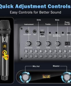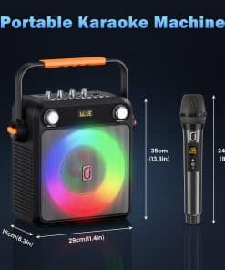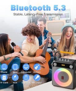 Este altavoz de karaoke Bluetooth con micrófonos inalámbricos es la elección perfecta para tus fiestas en casa, reuniones familiares, celebraciones al aire libre y mucho más. Con una excelente calidad de sonido Hi-Fi gracias a su subwoofer de 6.5 pulgadas y controlador de audio de alto rendimiento de 20W de potencia de salida, disfrutarás de un sonido más claro, potentes graves y volumen moderado que elimina todo el ruido. La tecnología Bluetooth 5.3 garantiza un emparejamiento instantáneo y una transmisión estable, permitiéndote conectar tus dispositivos con facilidad. Además, su batería recargable de 4400mAh te brinda hasta 12 horas de reproducción continua, para que puedas cantar y disfrutar de la música en cualquier lugar. Con opciones de conexión como Micro TF, USB y AUX, este altavoz es compatible con una amplia gama de dispositivos como teléfonos Android, iPhones, iPads, TV y PC. Los micrófonos inalámbricos de alta calidad incluidos tienen un rango de transmisión de señal de hasta 100 pies, perfecto para grandes reuniones. La máquina de karaoke también cuenta con un diseño portátil con asa y correa para el hombro, haciendo que sea fácil llevar la música a donde quieras. Su espectáculo de luces LED con 9 efectos sorprendentes crea una atmósfera de fiesta agradable, romántica y enérgica. Ya sea para regalar a amigos y familiares o para crear tu propio mundo musical perfecto, este altavoz de fiesta Bluetooth es la opción ideal en cualquier ocasión. ¡Disfruta cantando y divirtiéndote con este increíble altavoz de karaoke!