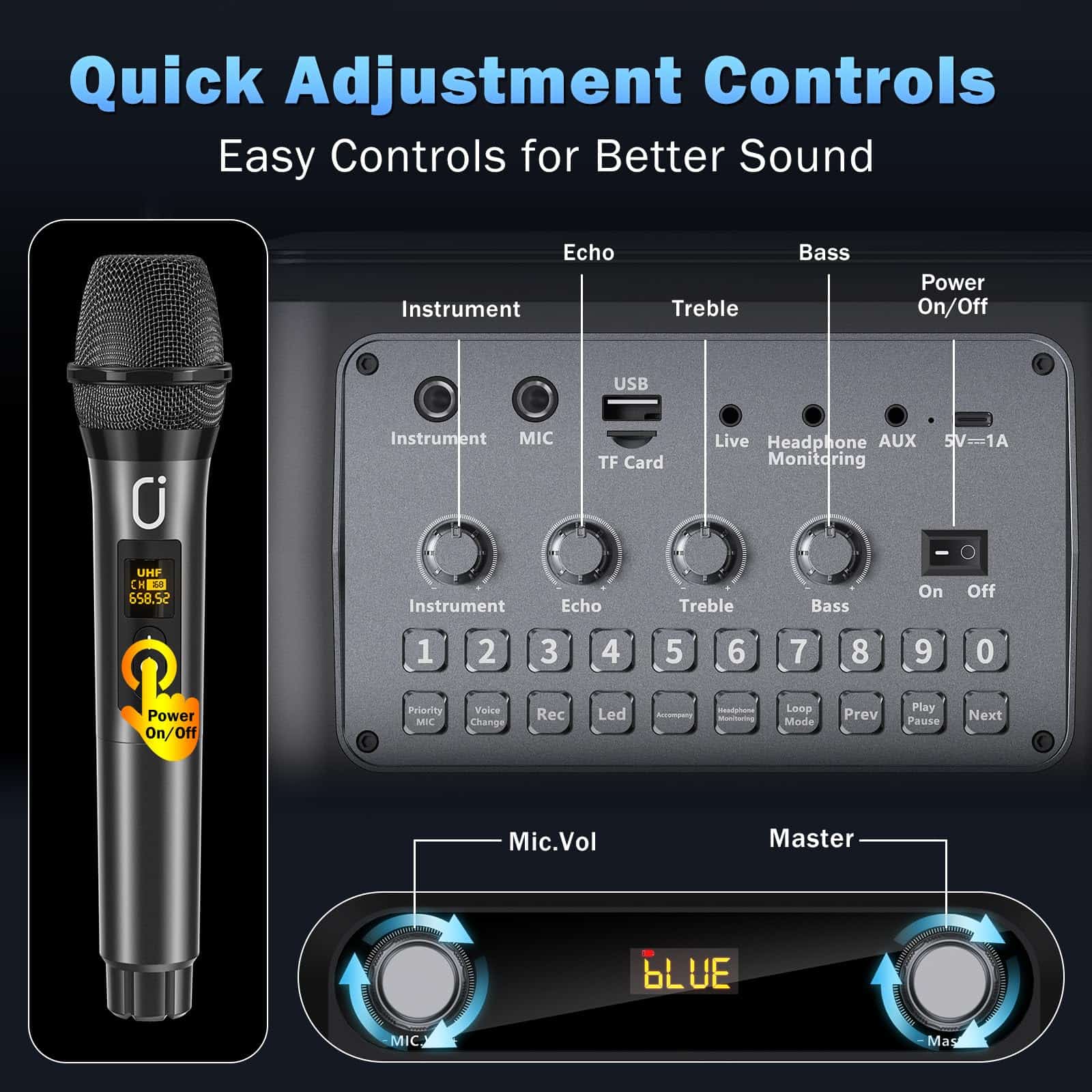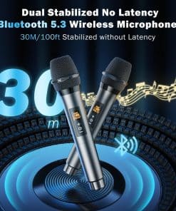 2. Máquina de Karaoke Multifunción: La máquina de karaoke para adultos y niños adopta la última tecnología Bluetooth 5.3, garantizando emparejamiento instantáneo, proporcionando una transmisión más estable y a mayor distancia. El altavoz de micrófono de karaoke también admite tarjetas Micro TF, conexiones USB y AUX, siendo compatible con teléfonos Android, iPhones, iPads, TV y PC. Los micrófonos inalámbricos de alta calidad incluidos tienen un rango de transmisión de señal de hasta 100 pies, ideal para reuniones grandes.