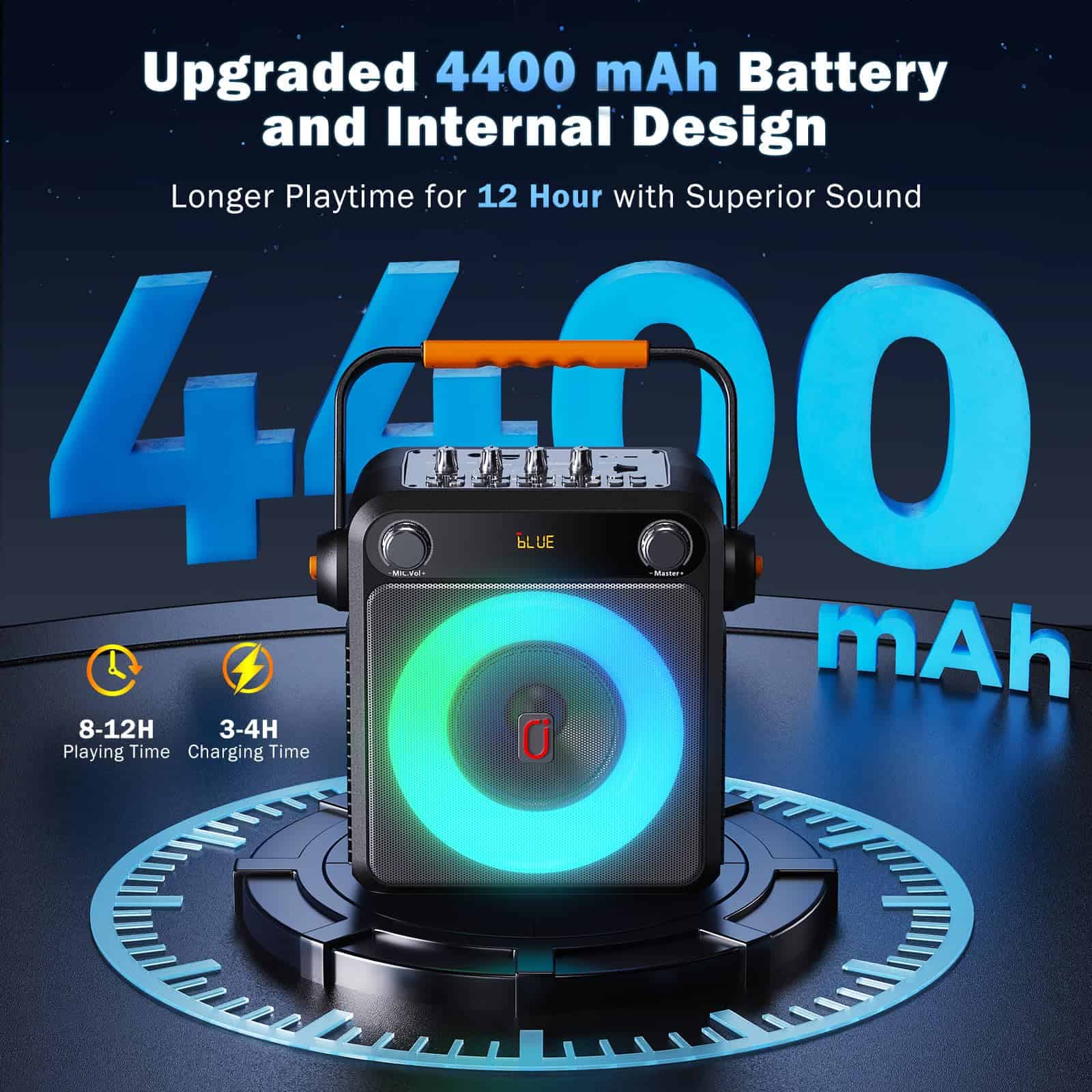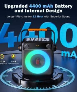 3. Batería de Ultra Larga Duración: Esta máquina de karaoke portátil cuenta con una batería recargable de 4400mAh con bajo consumo de energía. Al estar completamente cargada, garantiza 12 horas de reproducción de música continua. Puedes llevarla fácilmente a la playa, al aire libre o a cualquier otro lugar, permitiéndote cantar y disfrutar de cada momento de música en cualquier lugar y momento.
