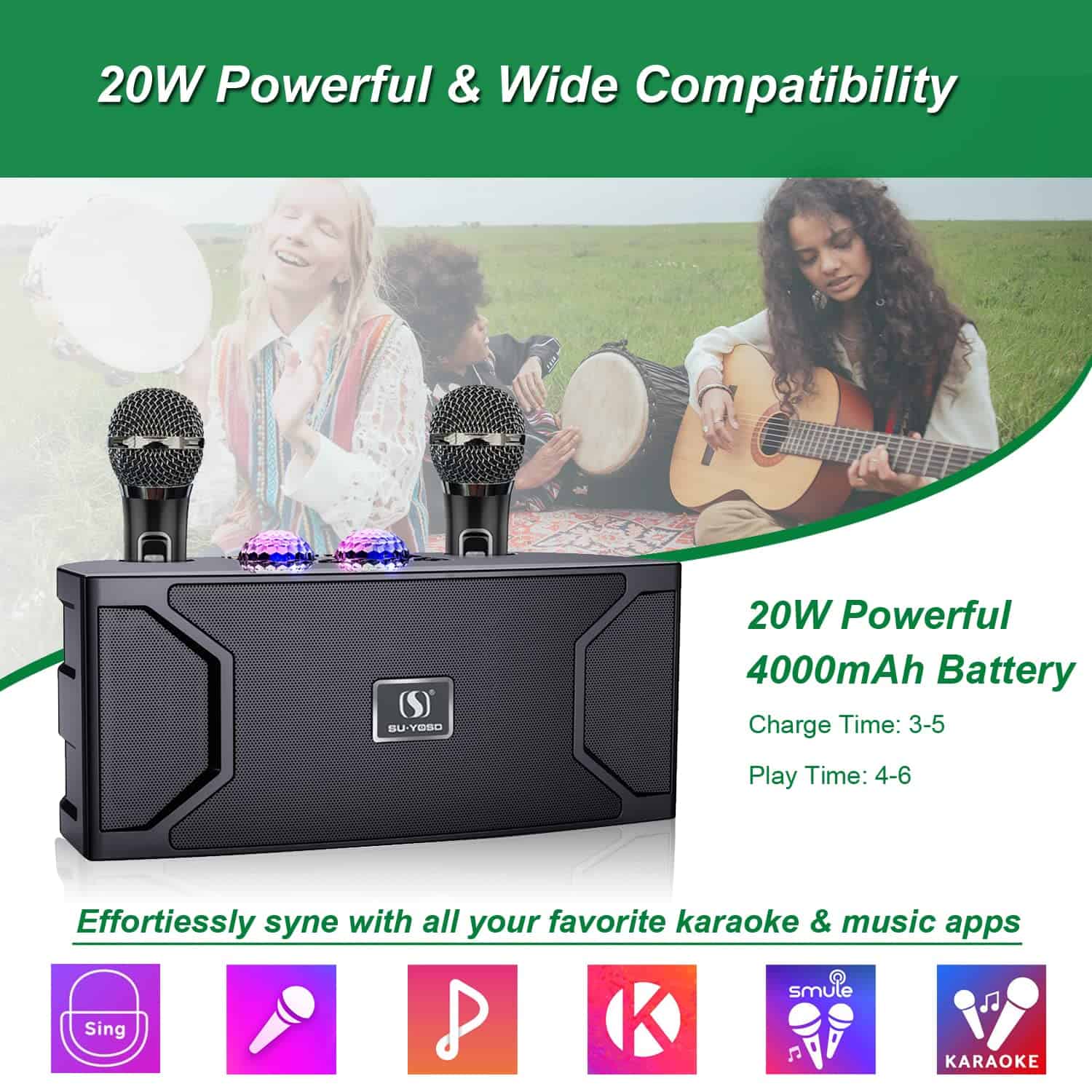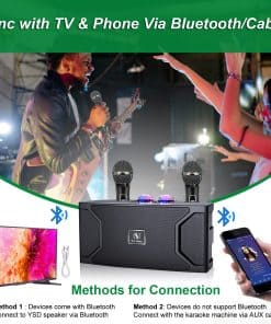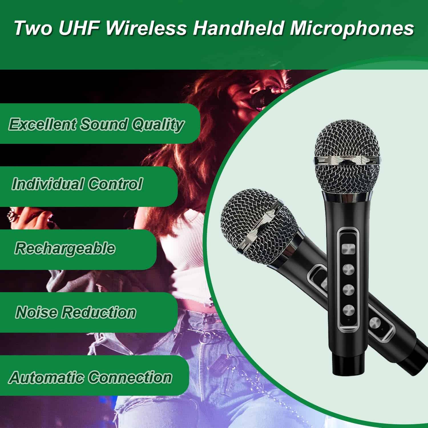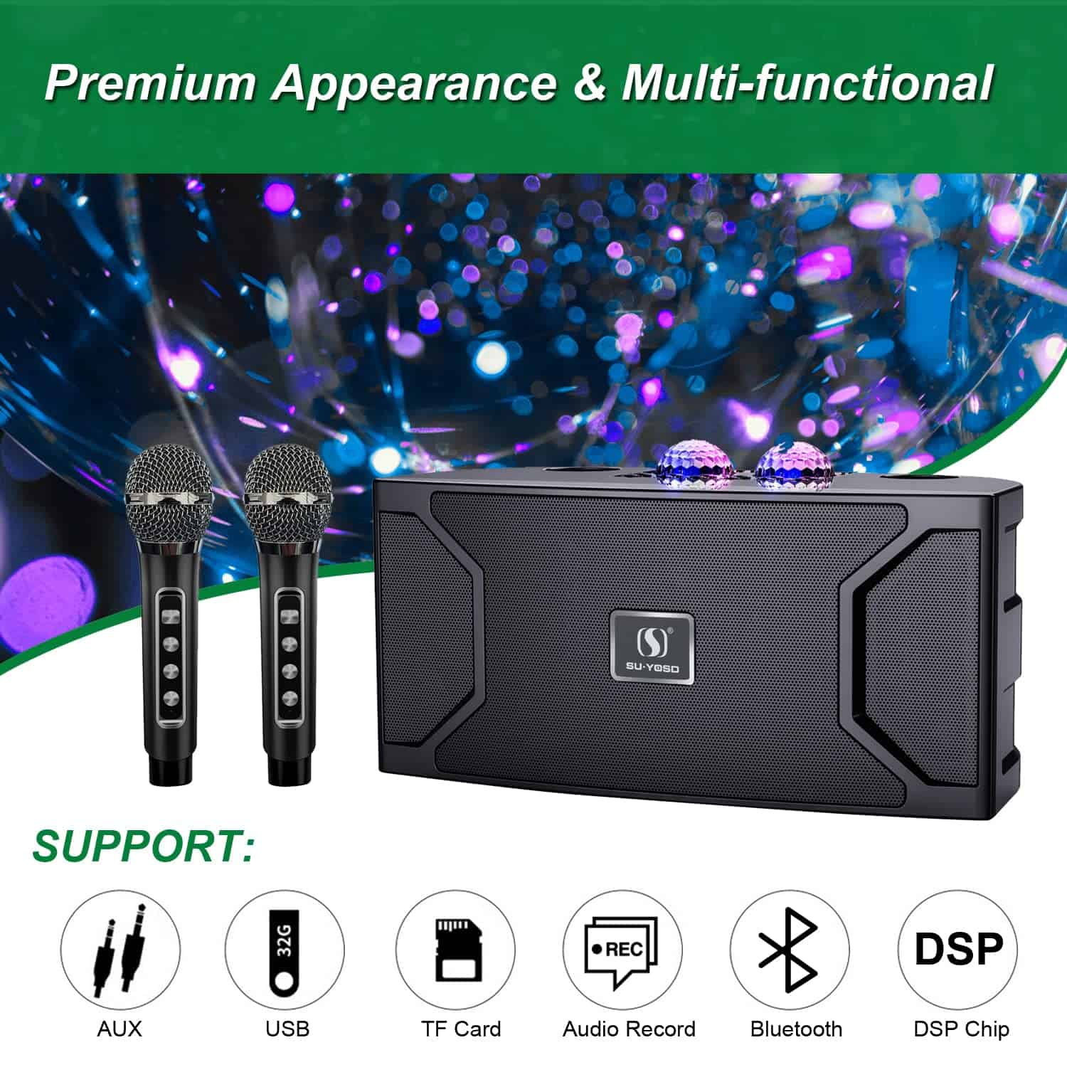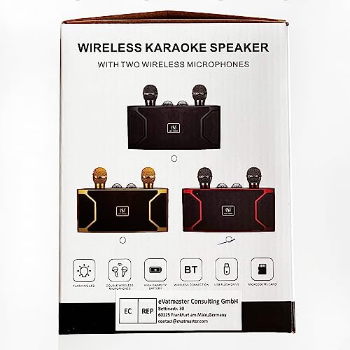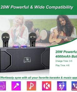 Máquina de Karaoke con Bluetooth y 2 Micrófonos Inalámbricos para Adultos y Niños, Altavoz Karaoke Portátil con Sistema de Canto PA y Luz Disco para Fiestas Navideñas, Regalos Geniales para Niños y Niñas. Este sistema de karaoke inalámbrico está diseñado con funciones multiuso para la reproducción de sonido estéreo de rango completo. Con el chip Bluetooth 5.0 DSP incorporado, la máquina de karaoke proporciona una transmisión más estable y a mayor distancia, asegurando una fiesta ininterrumpida con un rango de trabajo de hasta 33 pies. Es compatible con teléfonos móviles Android, TV, iPad, tabletas, PC, ideal para fiestas personales, escuelas, salones de clases y gimnasios. El sistema de karaoke tiene integrado Bluetooth 5.0 con un rango de trabajo de hasta 33 pies, con una señal estable y confiable durante el canto y sin preocupaciones de cortes. Viene con dos micrófonos inalámbricos UHF, diseñados con tecnología avanzada de reducción de ruido activa, un procesador de audio DSP profesional y el chip EQ para ajustar automáticamente los agudos y los graves, asegurando que cada palabra sea perfecta. La máquina de karaoke incluye una bola de luz disco colorida que añade una increíble atmósfera de fiesta, ya sea en el jardín, parque o patio trasero. Empuja toda la atmósfera de karaoke al punto más alto con efectos de iluminación LED multicolores. Además, cuenta con la función de eliminación de los vocales originales con un solo clic, permitiéndote aprender a cantar sin los vocales como respaldo y mostrando tus maravillosas canciones en el acompañamiento. Disfruta de tu música favorita en cualquier lugar con esta increíble máquina de karaoke portátil.
