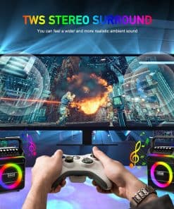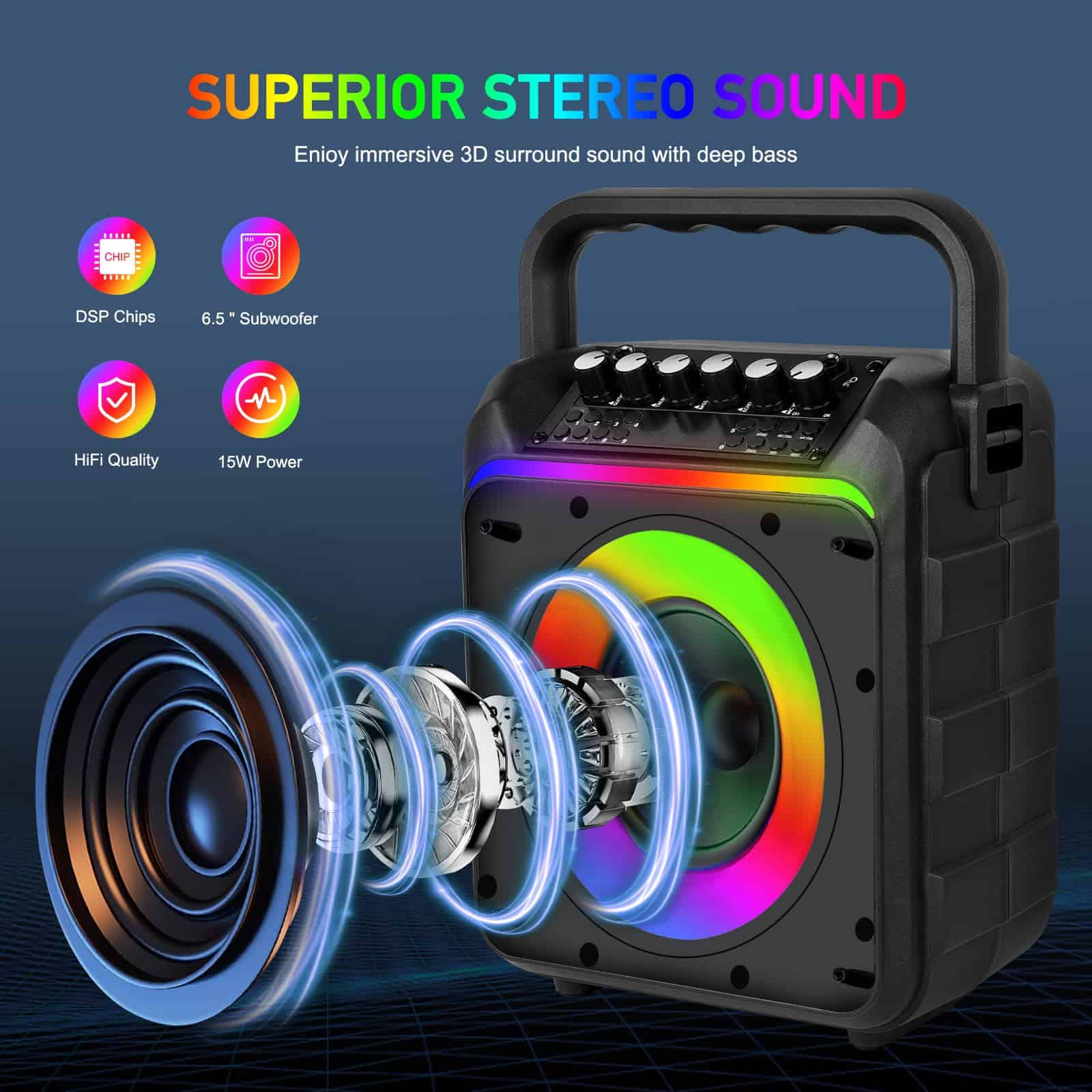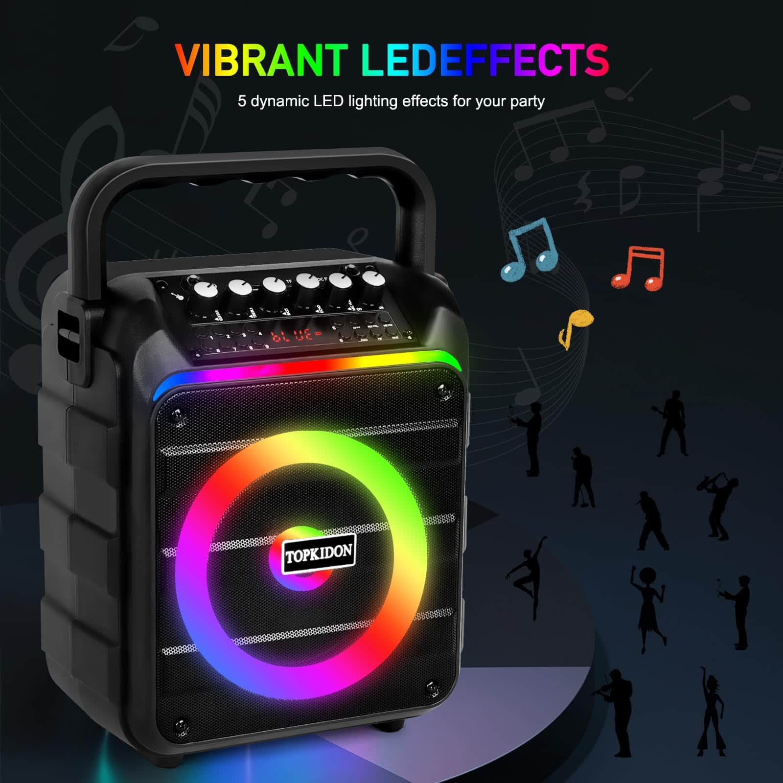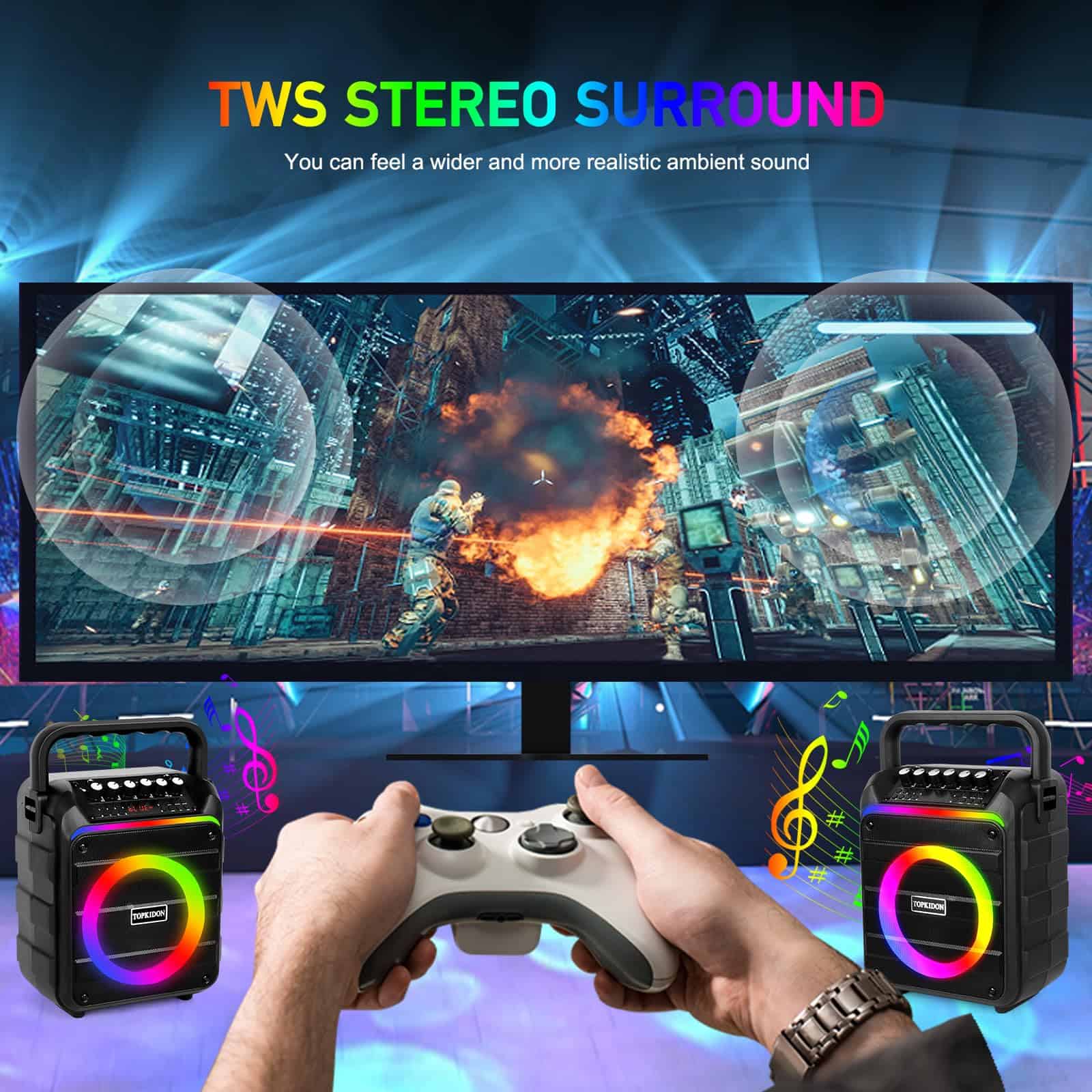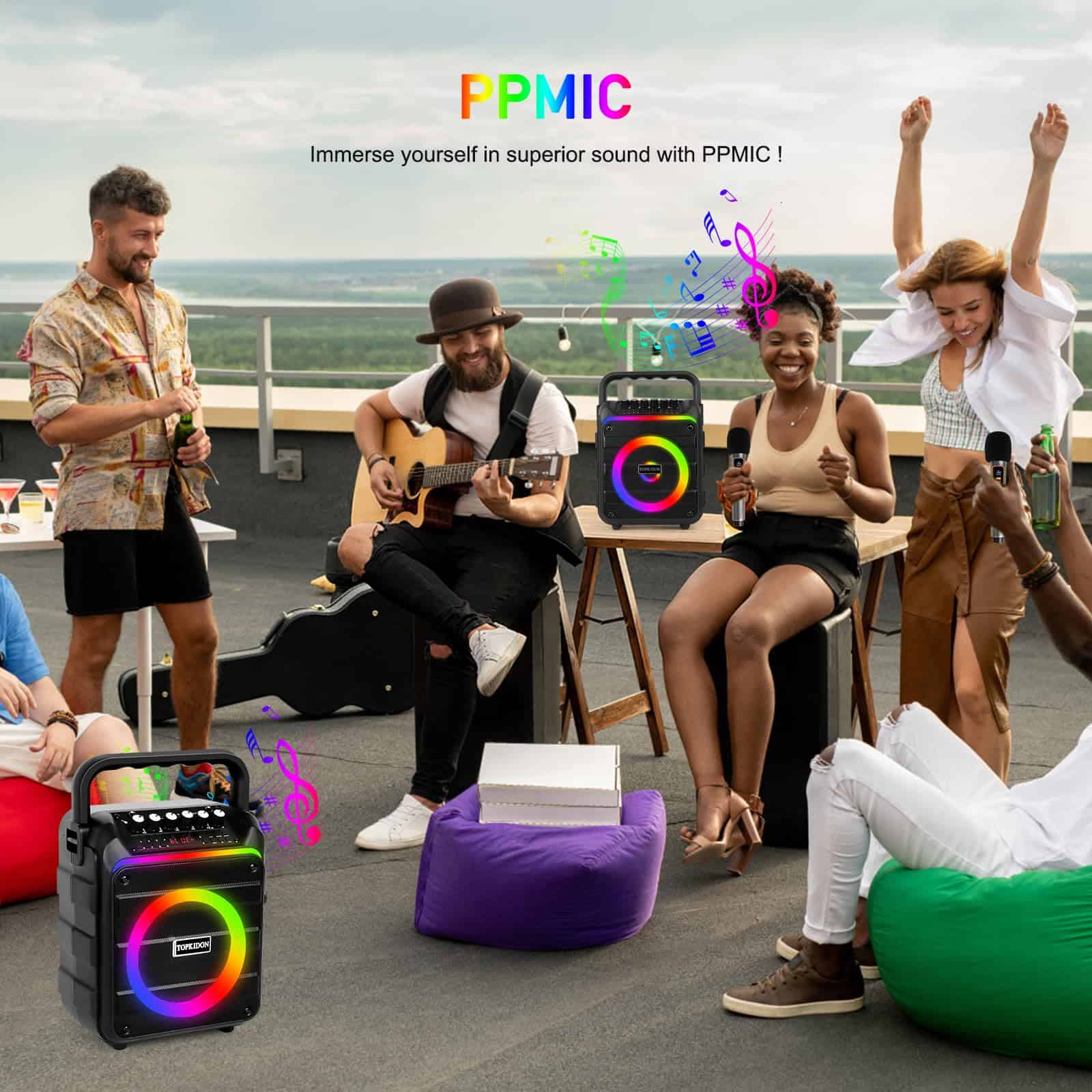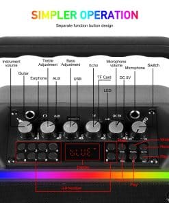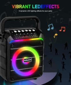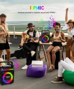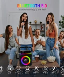 La máquina de karaoke portátil cuenta con altavoces premium de 20W y 6.5 pulgadas, conectividad Bluetooth 5.3 mejorada, 2 micrófonos inalámbricos resistentes a interferencias, botones de función separados y 3 pisos de luces dinámicas de colores vibrantes, y es compatible con tarjeta Micro TF, unidad flash USB y conectividad AUX. Con este sistema de karaoke multifuncional, puedes usar la máquina para reemplazar el altavoz Bluetooth, el micrófono, la radio, el reproductor de medios y el amplificador de guitarra, lo que la hace versátil y adecuada para diversas ocasiones. El altavoz Bluetooth portátil está equipado con un controlador de audio de alto rendimiento y un procesador de señal digital avanzado, que hacen que el sonido sea más claro, los bajos más fuertes, el volumen más moderado y eliminan todo el ruido. Al conectar dos sistemas estéreo iguales, el potente sonido estéreo se sincronizará y te rodeará con 2 canales. Ya sea agudo o grave, el altavoz de karaoke ofrece claridad y asegura que cada nota se reproduzca perfectamente. Lleva la fiesta a donde quieras con el altavoz portátil para exteriores. Equipado con control remoto, cambia con un solo clic en cualquier momento y en cualquier lugar. Con su carga completa, puedes disfrutar de 4-6 horas de canto sin parar, lo que lo hace perfecto para reuniones al aire libre, fiestas en el piso de arriba, o incluso sesiones de karaoke sobre la marcha. La máquina de karaoke multifunción está equipada con 3 capas de luces LED, cambia sin esfuerzo entre 5 efectos de luz fascinantes. Las coloridas luces LED crean un ambiente agradable y romántico de karaoke y fiesta para ti. Con esta máquina de karaoke, reúne a tus invitados y lleva tu noche de karaoke al siguiente nivel con esta experiencia visual cautivadora. La máquina de karaoke con 2 micrófonos es un regalo amigable y perfecto para niños, adultos, familiares y amigos. Ya sea un cumpleaños, Pascua, Navidad, el Día de San Valentín, Halloween, Acción de Gracias o Año Nuevo, esta máquina de karaoke brinda alegría y afecto a través de la música y la canción. (Nota: Si no estás satisfecho con este sistema de altavoces u tienes alguna otra pregunta, no dudes en contactarnos)