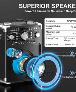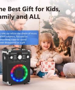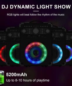 1. SUBWOOFER SUPERIOR CON BLUETOOTH 5.0: Altavoces HWWR de 5.25″ woofer + 2″ tweeter con procesador digital profesional DSP, crossover electrónico independiente y gestión dinámica de agudos y graves, transmiten fácilmente efecto estéreo rico a través de Bluetooth 5.0. 2. PORTÁTIL Y DE LARGA DURACIÓN: hasta 8 horas de reproducción. Fácil de llevar a cualquier lugar con asa portátil. 3. VERSÁTIL Y GRAN REGALO PARA TODOS: Conectividad Bluetooth para transmitir música. Regalo versátil para todas las edades. Ideal para reuniones familiares. 4. 2 MICRÓFONOS INALÁMBRICOS Y CONTROL REMOTO: 2 micrófonos inalámbricos automáticos (distancia inalámbrica: 30M). Control remoto por sensor infrarrojo. 5. SHOW DE LUCES DISCO DIRIGIDAS POR EL RITMO: Luces disco que cambian con la música. 6. SISTEMA DE SONIDO ESTÉREO TWS: Conexión inalámbrica para disfrutar de sonido envolvente 360.