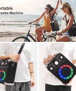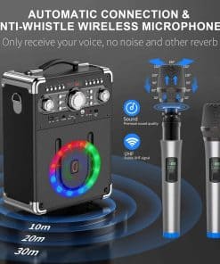 Máquina de karaoke HWWR con 2 micrófonos inalámbricos para adultos y niños, altavoz de karaoke portátil con luces DJ y altavoz Bluetooth. Características destacadas: Subwoofer superior con Bluetooth 5.0 para un efecto estéreo rico, portátil y de larga duración con hasta 8 horas de reproducción continua. Versátil y gran regalo para todas las edades, fácil de operar con conectividad Bluetooth. Incluye 2 micrófonos inalámbricos automáticos y control remoto por sensor infrarrojo. Luces de discoteca dirigidas por el ritmo de la música. Sistema de sonido estéreo TWS para conectar dos altavoces idénticos y disfrutar de sonido surround 360. Disfruta de un show de luces y sonido envolvente mientras cantas tus canciones favoritas. Perfecto para fiestas en casa, reuniones familiares y regalos especiales.