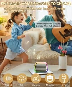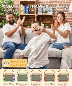 3. Luces Mágicas y Sonido Divertido: Este altavoz bluetooth inalámbrico tiene 5 modos mágicos de cambio de sonido, Sonido Original/Sonido de Bebé/Sonido de Dibujos Animados/Sonido de Monstruo/Sonido de KTV, elige tus efectos de sonido favoritos y canta con diversión efectos de sonido. Además, nuestro altavoz de karaoke portátil con Bluetooth tiene 5 modos mágicos de luz, Modo Color/Modo Monocromo/Modo de Respiración/Modo de Galope/Modo Ritmo Musical. Presiona el botón de luz para cambiar fácilmente, sincronizado con el ritmo de la música, ya sea una Fiesta de Cumpleaños, Actividades en el Aula, Reuniones Familiares, Actividades al Aire Libre, Viajes, y cualquier actividad de fiesta instantáneamente puede crear un ambiente divertido.