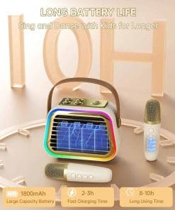 4. Tamaño Mini Pero Larga Duración de la Batería: Nuestra mini máquina de karaoke portátil es pequeña y fácil de llevar con una correa portátil resistente, mide 4.9 pulgadas x 2.4 pulgadas x 3.7 pulgadas y pesa solo 2.78 libras, el tamaño pequeño y el volumen alto hacen que cada momento sea más agradable. Este altavoz de karaoke inalámbrico portátil tiene una batería recargable de 1800mAh incorporada, que se puede cargar completamente en solo 2-3 horas mediante el puerto Tipo-C, y se puede utilizar durante 8-10 horas. ¡Esta pequeña máquina de karaoke para niños puede pasar un tiempo de música feliz sin necesidad de una carga frecuente!