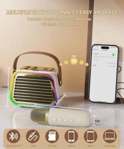 2. Micrófono Inalámbrico y Múltiples Formas de Conexión: La mini máquina de karaoke viene con 2 micrófonos inalámbricos, se conecta automáticamente a los altavoces, utilizando el puerto Tipo-C dura más de 8 horas en carga completa, y brinda hasta 20 metros de alcance de conectividad inalámbrica, mantente conectado mientras te desplazas. La Máquina de Karaoke para Niños tiene múltiples modos de conexión, incluyendo Bluetooth 5.3, tarjeta TF y entrada AUX, con una distancia de transmisión de conexión estable de 10 metros, y es compatible con iPhone, Android, iPad, Laptop, PC, Sistema de Karaoke de Coche y más.