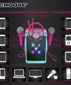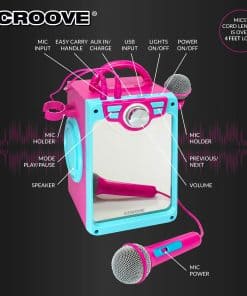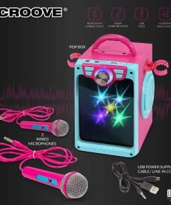 Altavoz Potente / Micrófonos Dobles / Luces de Disco Destellantes / Batería Recargable de Larga Duración / Conectividad USB/AUX/Bluetooth / ¡Desata tu Superestrella Interior! Packed with features, el mezclador de karaoke Croove POP BOX te da la oportunidad de cantar junto a tus pistas favoritas y organizar conciertos divertidos con familiares y amigos! Micrófonos Dobles: ¡Sé solista o disfruta de un dúo con alguien especial! Los soportes de micrófono mantienen los micrófonos en su lugar cuando no se utilizan. Altavoz Potente: ¡Obtén audio de alta calidad directamente en tu sala de estar! El volumen ajustable te permite mantener el sonido a un nivel que te guste. Fácil de Transmitir: ¡Ofrece una conectividad rápida de música a través de puerto USB, AUX in (se incluye el cable) o Bluetooth. Luces de Disco en Órbita: ¡Siéntete como una verdadera estrella de rock con brillantes y destellantes luces de disco que acompañan tu actuación! Batería Recargable de Potencia: ¡Obtén hasta 4 horas de tiempo de reproducción con una sola carga! Diseño Compacto y Portátil: Es fácil llevar este altavoz de karaoke lleno de acción con la resistente asa adjunta. Garantía de Satisfacción: Croove se compromete a hacer productos de audio de alta calidad que superen tus expectativas en cuanto a calidad y diversión. Por favor, contáctanos en caso de problemas relacionados con el pedido. ¡Prometemos solucionarlo o devolverte tu dinero!