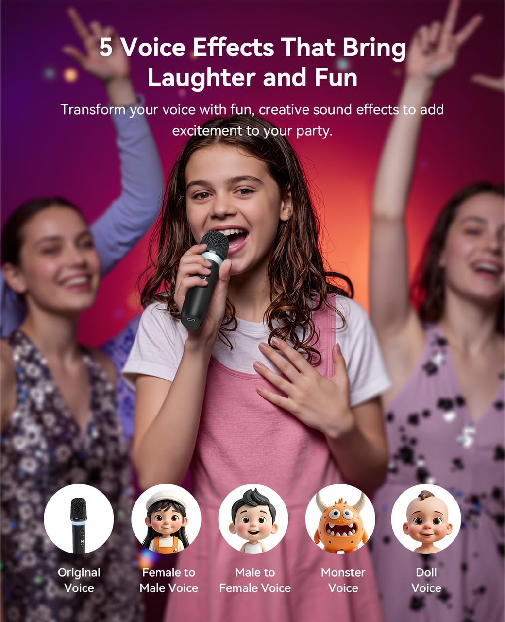 2. Máquina de Karaoke Portátil: Disfruta de la diversión del karaoke en cualquier momento y lugar con esta máquina de karaoke compacta para niños. Viene con 2 micrófonos inalámbricos con 5 divertidos efectos de voz (masculino, femenino, infantil, monstruo y original), ¡lo que lo hace perfecto tanto para adultos como para niños!