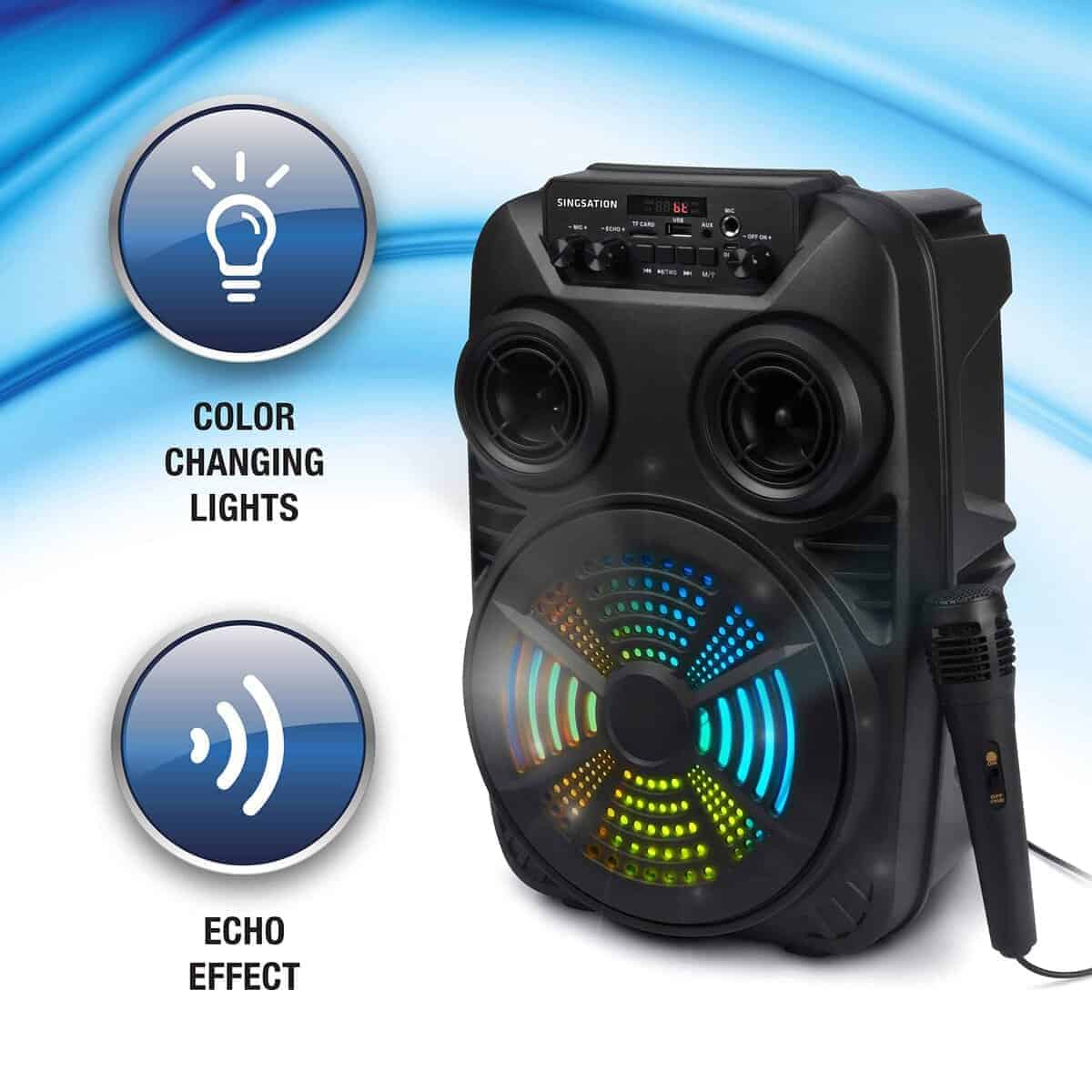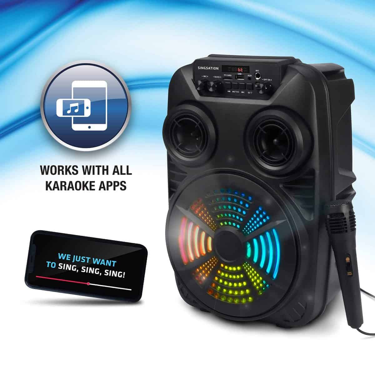 Impresiona a tus amigos y familiares con el Sistema de Fiesta de Karaoke Todo en Uno Recargable Rhapsody de Singsation. Conecta tu teléfono inteligente o tableta a través de Bluetooth 5.0 para miles de canciones/videos de karaoke de YouTube y todas tus aplicaciones de karaoke favoritas. Incluye lector de archivos de música USB y Micro SD, AUX, y radio FM para aún más opciones musicales. El soporte integrado para teléfono/tableta facilita cantar junto a las canciones. Un gran altavoz de 8″ con luces LED multicolores proporciona un sonido dinámico para hasta 4 horas de reproducción por carga. Ajusta fácilmente el volumen de la música y del micrófono, salta, reproduce o pausa la música mientras actúas, utilizando el control remoto incluido. El Rhapsody es compacto y ligero, lo que lo hace fácil de llevar a cualquier lugar. Su asa incorporada también sirve como soporte de dispositivo, y con la batería recargable, puedes llevar la fiesta contigo. Con Singsation, ¡todos pueden ser una estrella!