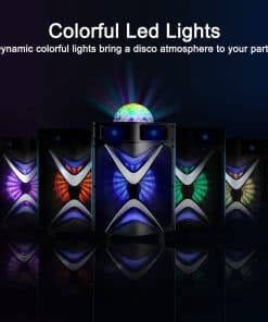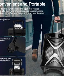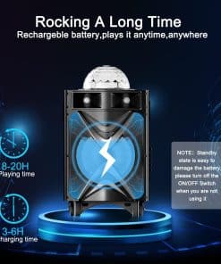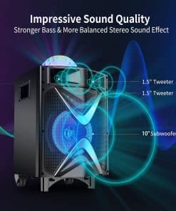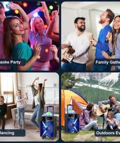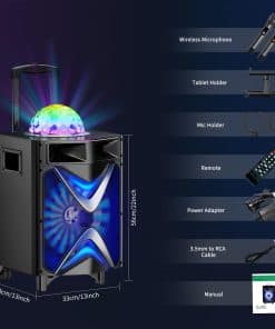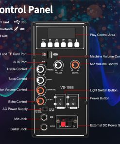 ¿Estás listo para el karaoke Esta máquina está diseñada para aquellos que les gustaría cantar o bailar en cualquier momento y lugar. No tienes que gastar más dinero y tiempo en un lugar de karaoke fuera. Vamos y invita a tus amigos o familiares a unirse a ti. Vamos a tener una fiesta con la máquina de karaoke VS-1088 ahora. Especificaciones Modelo No.: VS-1088 Potencia de Salida Nominal: 200 W Potencia de Salida Máxima: 300 W Sensibilidad: 500±30mV Relación S/A: 75dB Respuesta de Frecuencia: 50Hz-20kHz Entrada de Alimentación: DC 15V Adaptador: 15V/2.4A, AC110~240 Micrófono: Se necesitan 2 pilas AA (no incluidas) Altavoz: Subwoofer de 10» y Dual Tweeters de 3» Consejos Cómo usar Bluetooth: Presiona el botón ‘MODE’ en el panel para cambiar entre LINE, BLUETOOTH y FM. Después de cambiar correctamente a Bluetooth, la pantalla LCD muestra «BLUE». Conecta Bluetooth llamado «VS-1088» con tu teléfono móvil, luego puedes disfrutar de Bluetooth libremente. Presiona el botón ‘MIC PRIORITY’ si te gustaría cantar junto con la música; de lo contrario, la música se detiene cuando usas el micrófono.