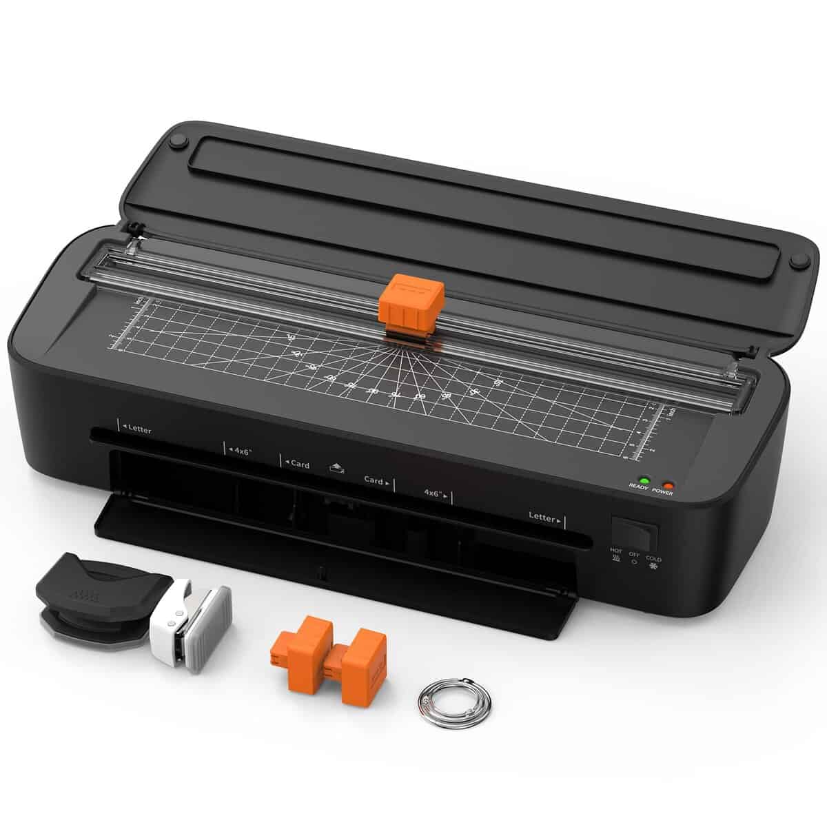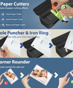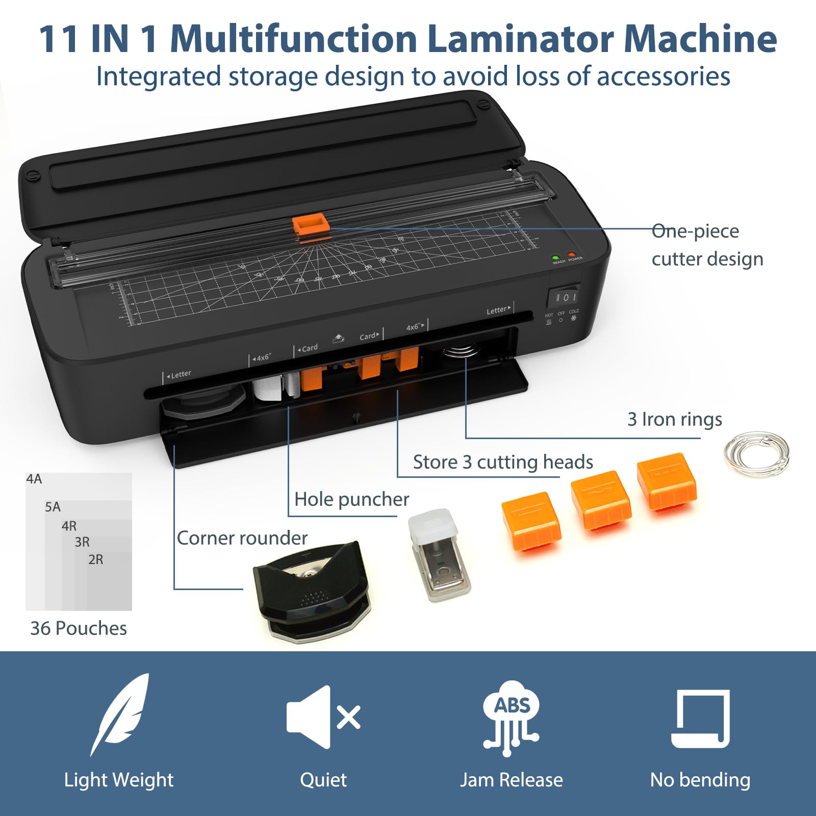 4. Laminador versátil 11 en 1: Explora posibilidades infinitas con nuestra máquina de laminado integral, que ofrece un cortador incorporado, redondeador de esquinas, perforadora de agujeros, 3 cabezales de corte de papel, 3 anillos de hierro y un conjunto de 36 bolsas de laminado (4 tamaños A4, 8 tamaños A5, 8 tamaños 4R, 8 tamaños 3R, 8 tamaños 2R). Los tres cabezales de corte ofrecen versatilidad: cortador de papel lineal, cortador de papel discontinuo y cortador de papel con línea ondulada, permitiendo formas y efectos únicos (acceso a componentes adicionales desde el espacio de almacenamiento dentro del laminador).