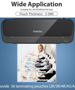 5. Amplias aplicaciones: Nuestro laminador maneja documentos de tamaño carta y funciona sin problemas con bolsas de laminación de 3/5 milésimas de pulgada. Ofrecemos tamaños de bolsas que incluyen 2R/3R/4R/A5/A4 para adaptarse a diversas necesidades, desde documentos y materiales de capacitación hasta menús, carteles, dibujos, fotos, marcadores y etiquetas. La flexibilidad de los modos de laminado en caliente y en frío amplía las posibilidades de uso. El laminado en caliente es adecuado para la mayoría de los documentos, el modo en frío es ideal para tintas sensibles o materiales de impresión (no incluye película fría).
