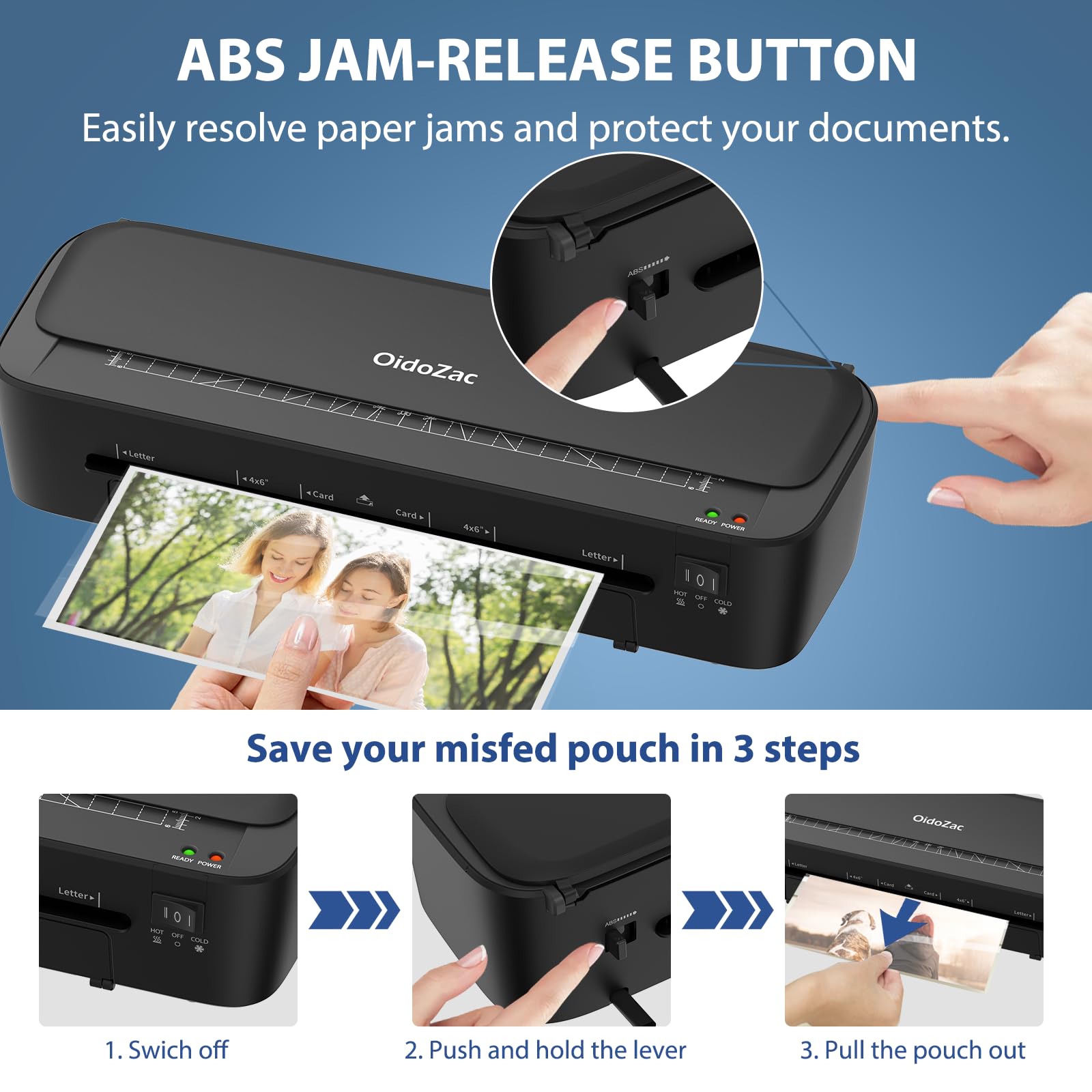 2. Calentamiento uniforme y máquina sin atascos: Destácate de los calentamientos tradicionales de tubo de vidrio con nuestra tecnología segura de lámina de mica, garantizando una distribución de calor constante para un laminado superior. El botón ABS proporciona una solución sin problemas para los atascos de papel. Apaga la energía, presiona el botón ABS y elimina sin esfuerzo los atascos de papel para proteger tus documentos importantes.
