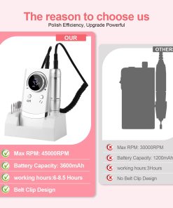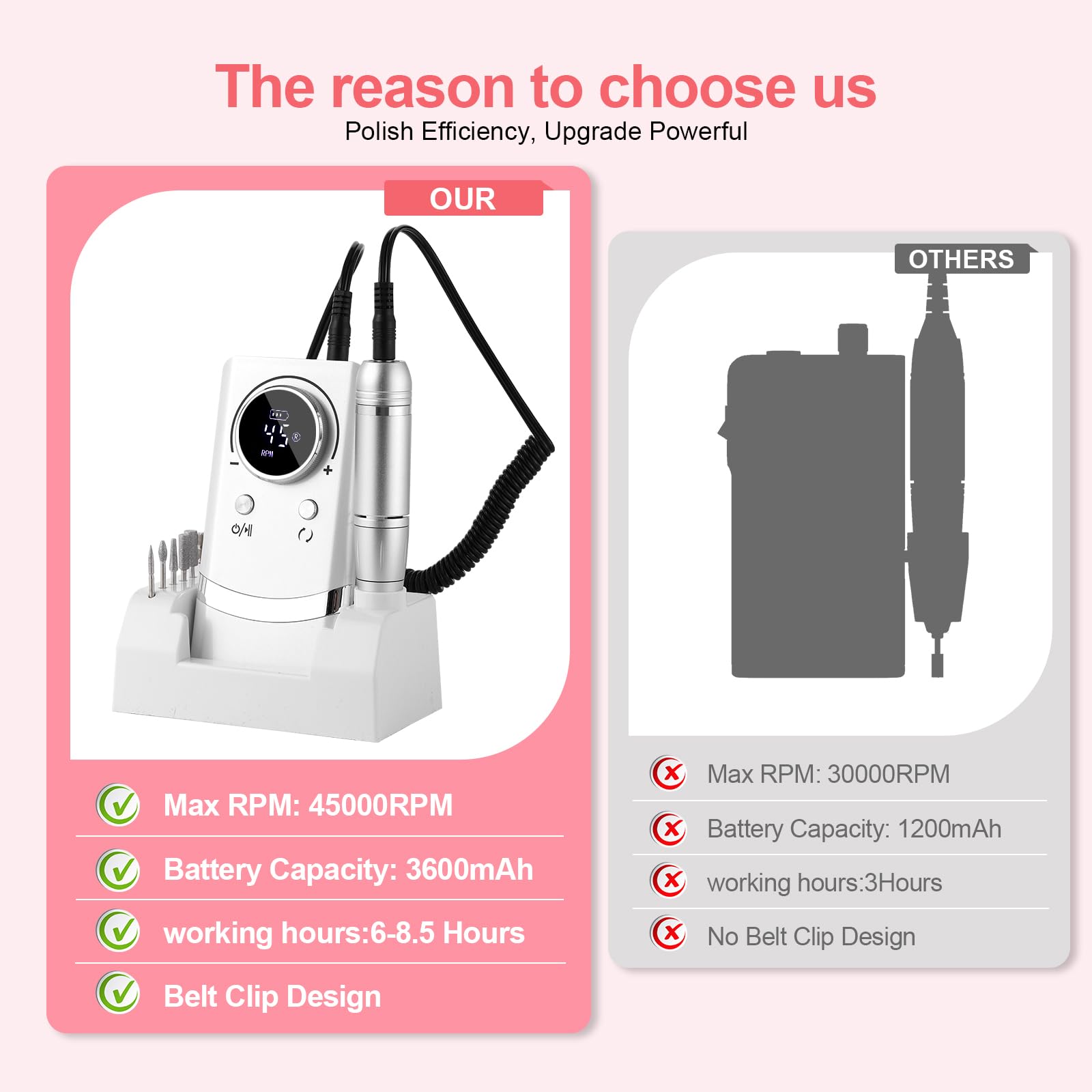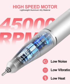 1. Velocidad ajustable para uso múltiple: 0-15000RPM es adecuado para pulir uñas, cortar, dar forma y quitar la piel muerta. 15000-25000 RPM es adecuado para quitar el esmalte de uñas de gel. 25000-45000RPM es para uñas acrílicas y otras manicuras profesionales en un salón de uñas.