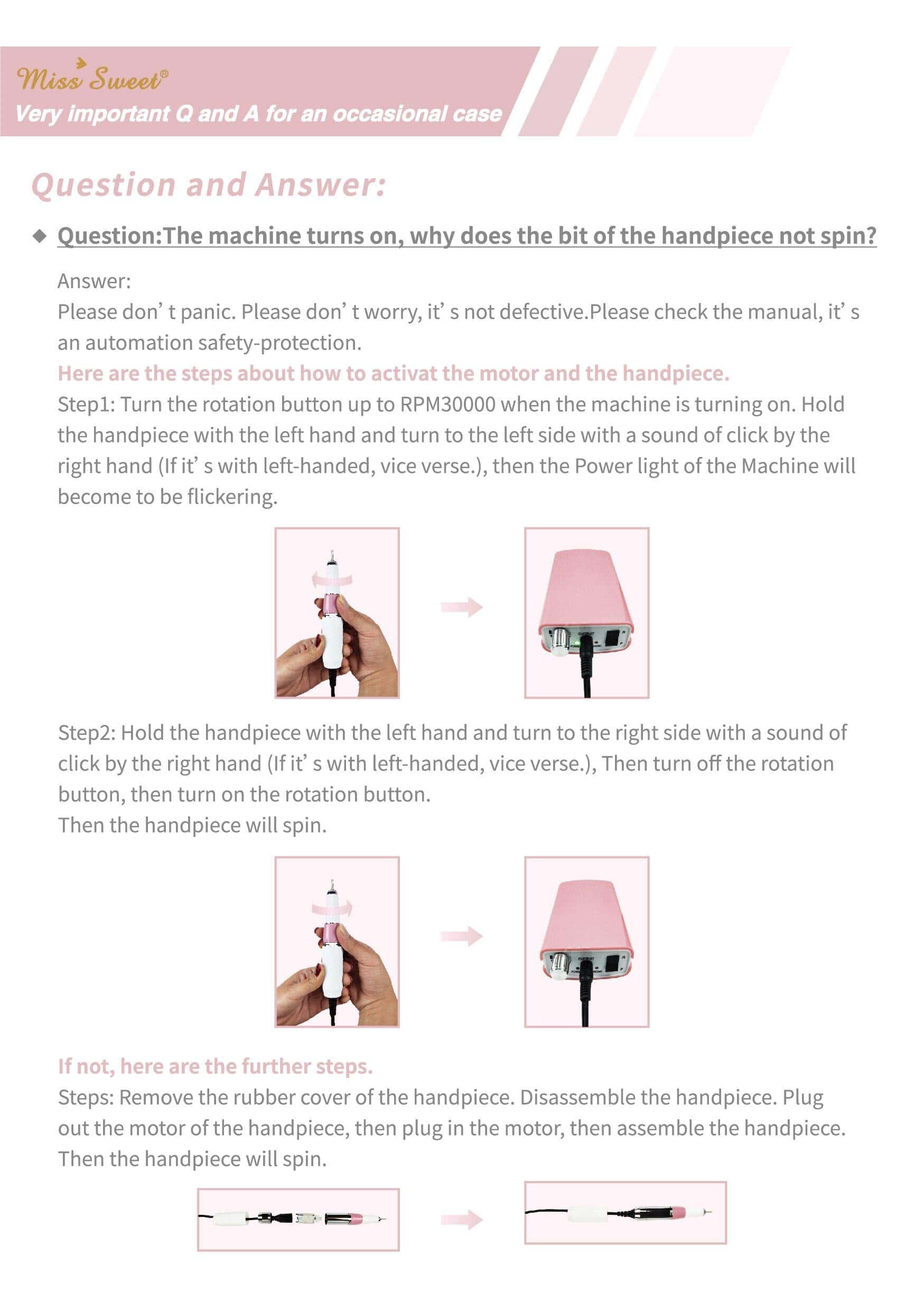 El taladro de uñas profesional Miss Sweet posee el Certificado FCC y CE. Este taladro de uñas es para uso personal en casa o uso profesional. Taladro eléctrico/enchufable en 110-120V. Potente: Velocidad de rotación de hasta 30000RPM. El mango es de tipo deslizable fácil de insertar/sacar.