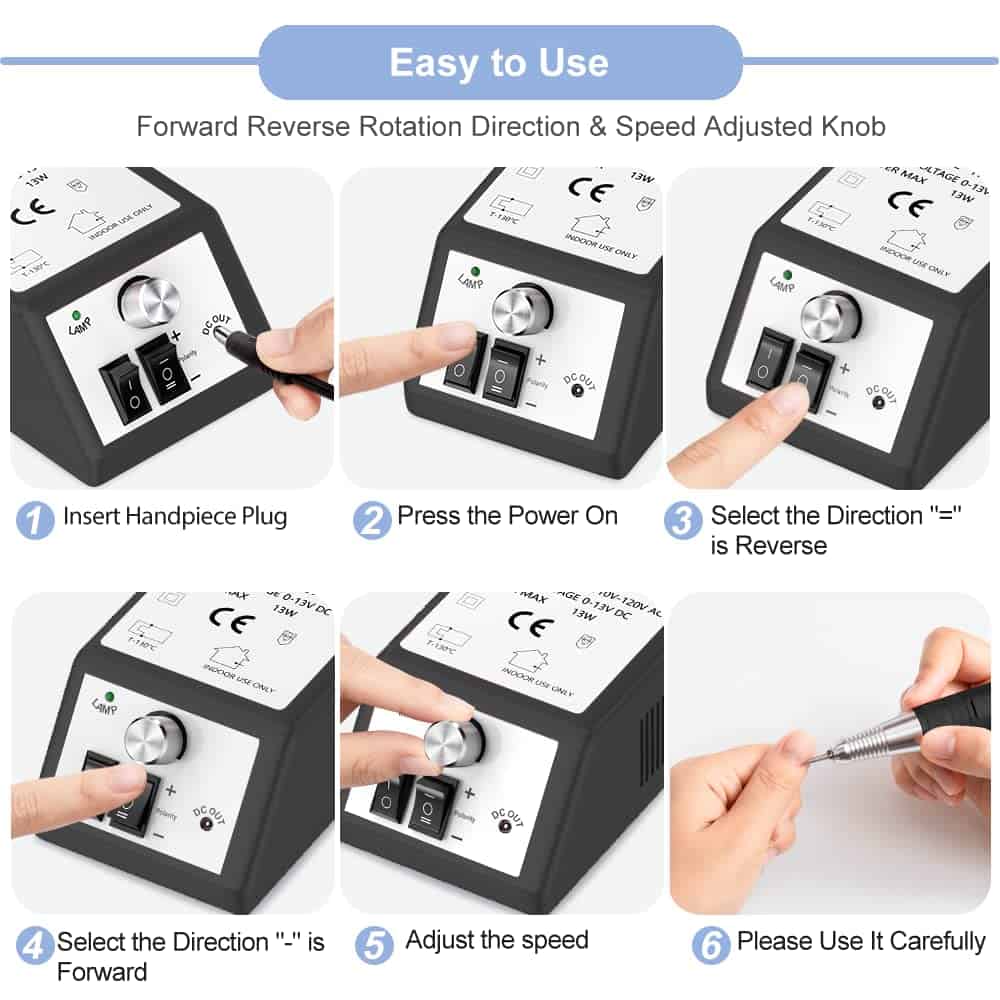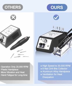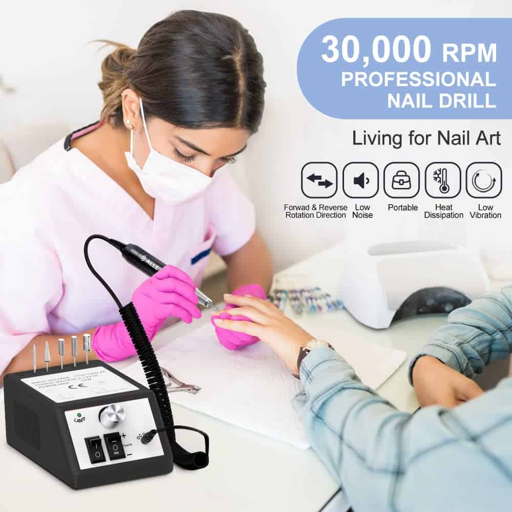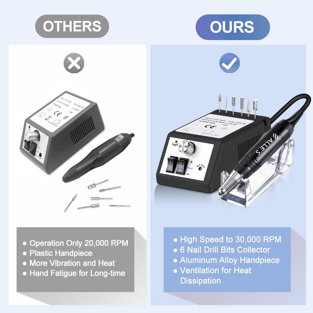 MÁQUINA DE TALADRO DE UÑAS PROFESIONAL Y FUNCIONAL – La máquina de taladro de uñas Alles está diseñada con 6 piezas de 3/32 brocas de uñas reemplazables y 106 piezas de bandas de lijado para pulir, moler, afilar, lijar, pulir las uñas de acrílico y gel, recortar las uñas de los pies gruesas naturales y eliminar los geles de extensión, cutícula y piel muerta, lo cual satisface todas las necesidades de belleza de las uñas. FÁCIL DE USAR – Puede utilizar el sistema de bloqueo de broca de torsión para cambiar las brocas fácilmente y sujetaría la broca firmemente. La máquina de taladro de uñas eléctrico tiene direcciones de rotación hacia adelante y hacia atrás, es fácil de usar tanto con la mano izquierda como con la derecha. Puede hacer sus uñas fácilmente en casa o en un viaje. Y la velocidad con un control deslizante preciso se ajusta hasta 30000 rpm. Se sugiere comenzar con baja velocidad. La operación de la máquina de taladro de uñas es amigable para un principiante.