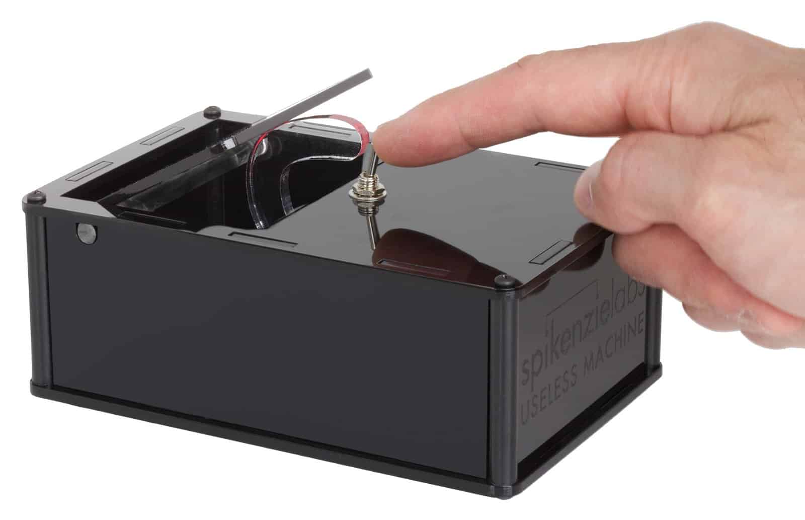 La Máquina Inútil es un artilugio que se apaga automáticamente cuando lo enciendes. Pero ¿cómo Es ¿Hay una pequeña persona terca en la caja jugándote una broma ¿Es magia No, ¡son unos interruptores con un pequeño motor y tú puedes armarlo! ¡Al construir el kit tu mismo, solo tú conocerás el secreto de cómo funciona! Cuando la muestres a tus amigos y compañeros de trabajo, mantenlos adivinando, después de todo, tú la construiste, ¡es tu secreto!