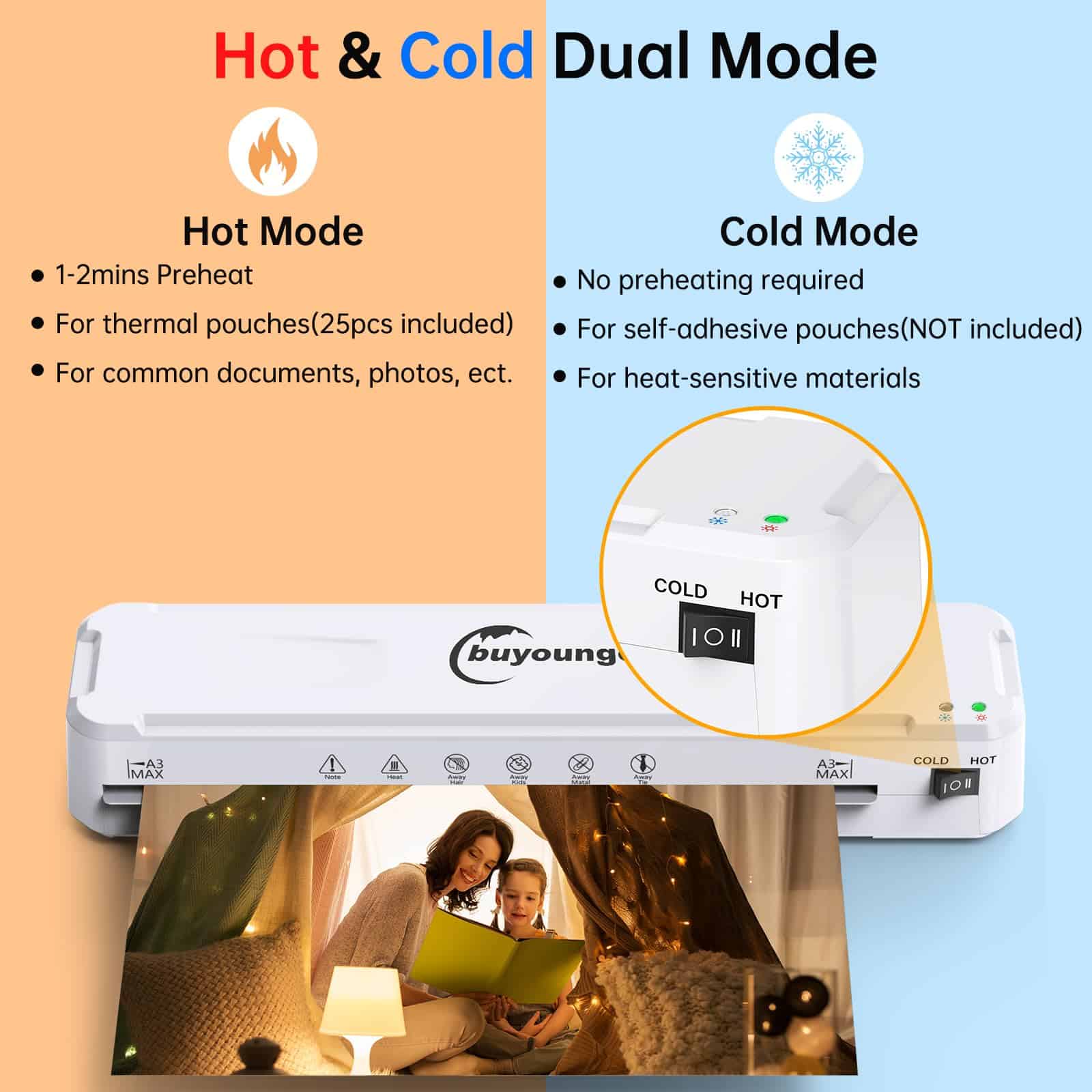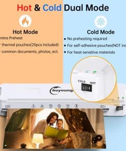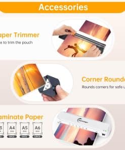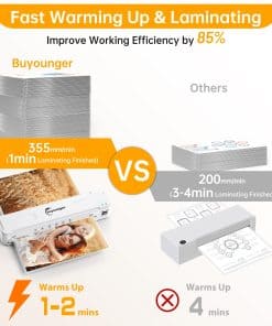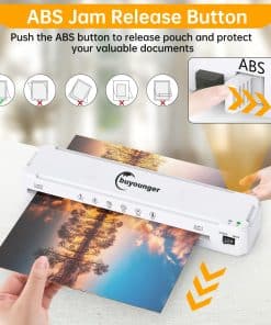 Buyounger acaba de lanzar al mercado esta máquina laminadora A3 con un diseño compacto que incluye todo lo que necesitas para comenzar a laminar tus documentos. Incluye un cortador de papel, un redondeador de esquinas y 30 bolsas de laminado en diferentes tamaños para adaptarse a tus necesidades diarias. Puede laminar hasta 13 pulgadas de ancho (330mm/11×17 pulgadas), cubriendo tus necesidades de laminado diarias en la oficina, en casa o en la escuela. Su tiempo de calentamiento de 60-90 segundos y su alta eficiencia gracias a la velocidad de 60Hz 355mm/min mejorarán considerablemente tu productividad. Cuenta con un sistema de 2 rodillos, un modo caliente y un modo frío, siendo compatible con láminas de 3-5 mil. El modo caliente es ideal para documentos comunes, mientras que el modo frío se recomienda para documentos con tintas o impresión sensible a altas temperaturas. También cuenta con la función ABS anti-atascos, que te permite liberar fácil y rápidamente los documentos atascados para garantizar la seguridad de tus archivos y extender la vida útil de la máquina. La fácil operación y su tamaño compacto hacen que esta laminadora A3 sea una excelente elección para individuos, profesores y personal de oficina, permitiéndoles preservar documentos importantes y fotos preciosas en su estado original. Ampliamente utilizado en la oficina, en casa y en la escuela, ¡es una de las mejores opciones para familias, maestros y colegas!