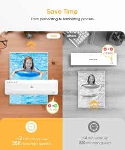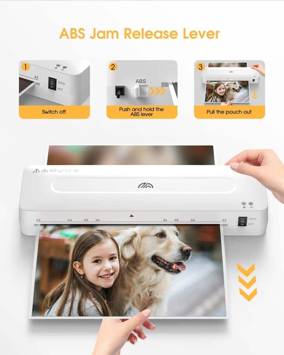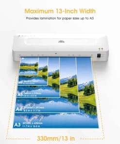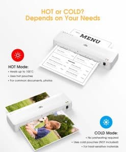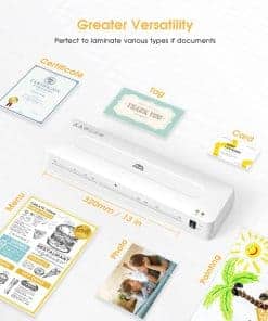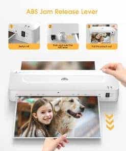 La máquina laminadora Crenova no solo cuenta con un calentamiento rápido de aproximadamente 2 minutos, sino que también presenta una velocidad de 350mm/min. Aumenta drásticamente la eficiencia de tu trabajo. Los modos de laminado en caliente y frío manejan de manera experta diferentes materiales de papel. El modo CALIENTE es ideal para documentos comunes, mientras que el modo FRÍO es adecuado para elementos sensibles al calor. Cuando se atasca el papel, presiona el botón ABS y luego saca el papel. El botón ABS resuelve el problema de atasco de papel de manera eficaz y conveniente. La laminadora de 13 pulgadas cuenta con una entrada de 330 mm / 13 pulgadas, que es suficiente para laminar papeles de hasta A3 de ancho.
