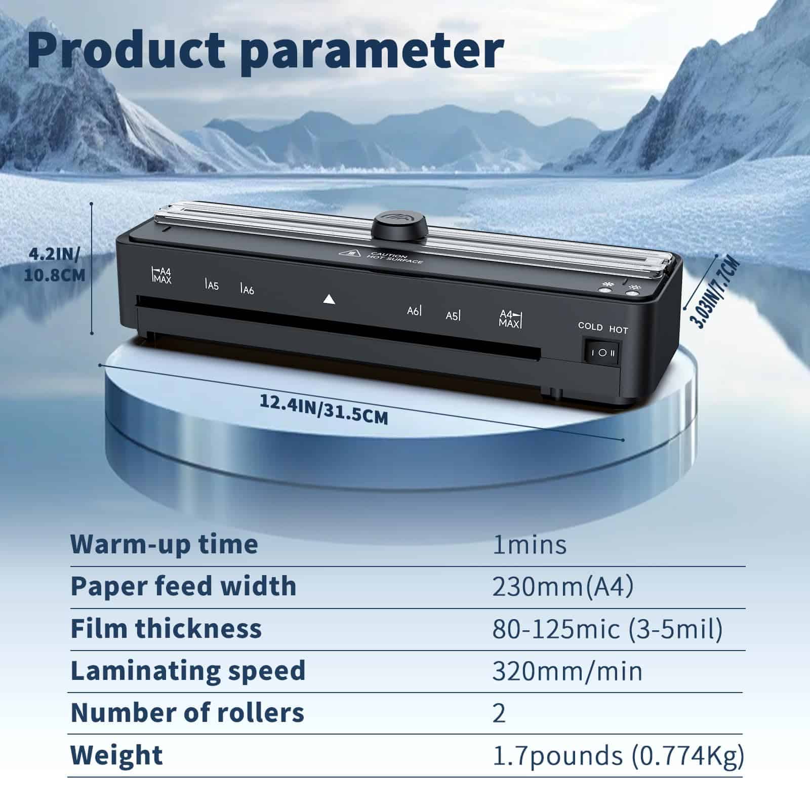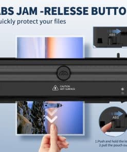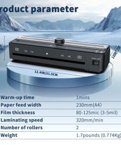 4. Laminadora de escritorio pequeña de 9 pulgadas: La laminadora A4 es un dispositivo elegante de 9″ que ofrece conveniencia y adaptabilidad. Es ligera y portátil, perfecta para individuos, educadores y negocios ocupados. Nuestras laminadoras protegen tus materiales de formación, documentos importantes, carteles, fotos, menús, postales, marcadores, etiquetas y más.