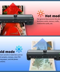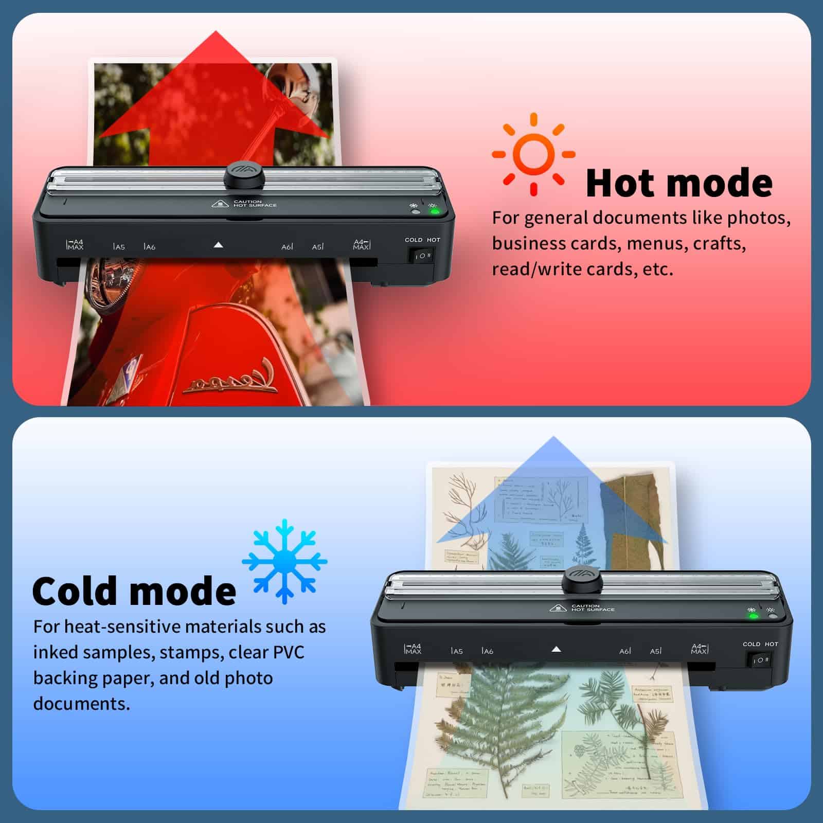 2. Laminadora con función dual caliente y fría: Esta laminadora cuenta con dos ajustes de calor. El rodillo caliente calienta las bolsas de laminado, uniendo la impresión al material. El sistema frío es ideal para artículos sensibles al calor. Para laminación en frío, utiliza bolsas autoadhesivas de sellado en frío.