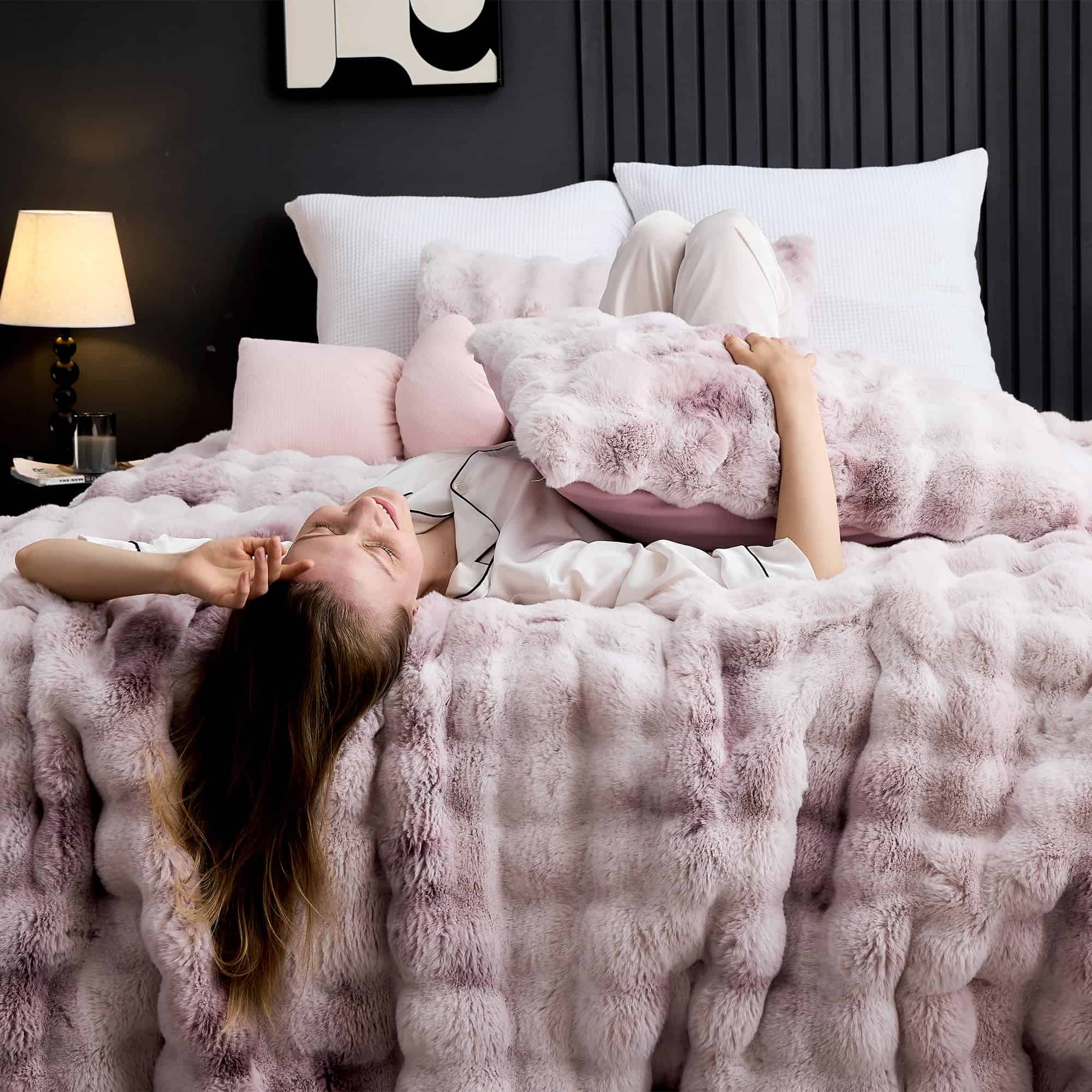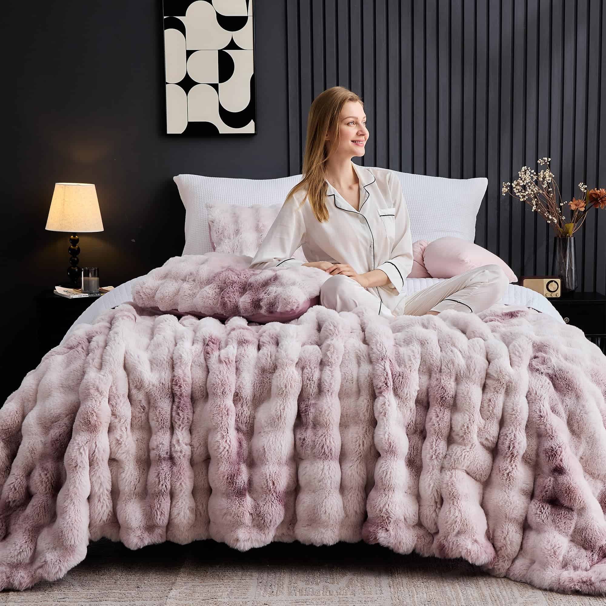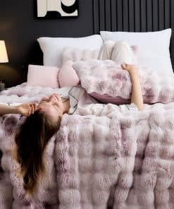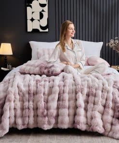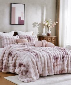 Maravilloso Juego de Edredón de Burbujas de Piel de Conejo Falso Esponjoso de 3 Piezas tamaño Queen, Tinte de Lazo Rosa Morado Juego de Ropa de Cama Peluda de Peluche, Cálido y Suave Juego de Edredón de Burbujas para Invierno. Nuestro juego de edredón de piel de conejo falso está hecho de 100% suave peluche mullido, y la parte trasera es de tela cepillada súper suave, ultra suave y cálido para ti y tu familia en el invierno. A diferencia de las mantas de peluche de color sólido regular, nuestras mantas de peluche cuentan con tecnología de tinte de lazo en la parte delantera, con diferentes niveles de color para hacer que tu habitación se vea más dinámica y dinámica, tanto hermosa como cómoda. Nuestro diseño de doble cara de piel artificial hace que el producto sea más lujoso y cómodo y te brinda la sensación más cómoda cuando te quedas dormido. El diseño en forma de burbuja, combinado con una tela de gamuza lavada en la parte trasera, presenta lados ultra suaves y cómodos con acolchado en el medio, proporcionando una sensación y calidez como de nube que envuelve toda la noche. Asegurando comodidad incluso después de varios lavados. La ropa de cama de la colección incluye 1 edredón con 2 fundas de almohada. Queen: 1 x edredón 90″ x 90″, 2 x fundas de almohada 20″ x 26″. King: 1 x edredón 104″ x 90″, 2 x fundas de almohada 20″x 36″. Lavable a máquina, lavar a máquina a temperatura ambiente, secar al sol o secar en secadora. No usar lejía ni planchar. Nuestro edredón se entrega en un paquete sellado al vacío. Golpee suavemente el edredón y déjelo reposar hasta 48 horas para restaurar su máxima esponjosidad. O puede secarlo en secadora a baja temperatura.