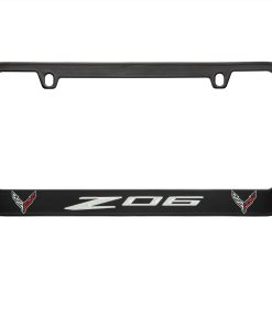 Marco de placa de licencia negro con 2 logotipos de Corvette C8 Z06. Incluye pestañas para asegurar la placa de licencia y eliminar vibraciones. Grabado CNC profundo y pintado a mano con pintura epoxi resistente a los rayos UV. No es una pegatina o gráfico impreso, fácil de limpiar y mantener. Tapas de tornillos a juego incluidas con tornillos de tamaño correcto. Pedido incluye un marco de licencia, tornillos y tapas de tornillos.