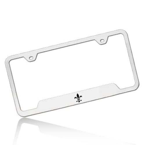 Marco de placa de matrícula Fleur-De-Lis grabado con láser. Fabricado en acero inoxidable. Nunca se oxidará ni corroerá. Pintado a mano con resinas permanentes clasificadas UV. Pestañas en la parte posterior para asegurar su placa de matrícula. Viene con hardware y tapas de hardware antirrobo a juego SnapCaps.