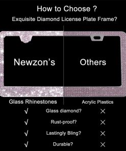 1. Diferencia de Newzon Rhinestone – El Marco de Placa de Matrícula Rosa Brillante de Newzon Utiliza Más de 1000 Piedras de Estrás de Vidrio Super SS16. La ventaja de las piedras de estrás: Las piedras acrílicas se desvanecen en poco tiempo, las piedras de estrás de Newzon nunca se desvanecen y ¡Siempre permanecerán permanentemente brillantes! La mayoría de los marcos acrílicos de placas de matrícula usan etiquetas de diamantes, una vez que la piedra comienza a caerse, será una gran área. Newzon aplicará al menos 3 capas de pegamento fuerte al marco de la placa al colocar las piedras de estrás, y pegará las piedras de estrás ordenadamente al marco de la placa una por una antes de que se seque el pegamento. Las piedras de estrás son muy fuertes en el marco de la placa.