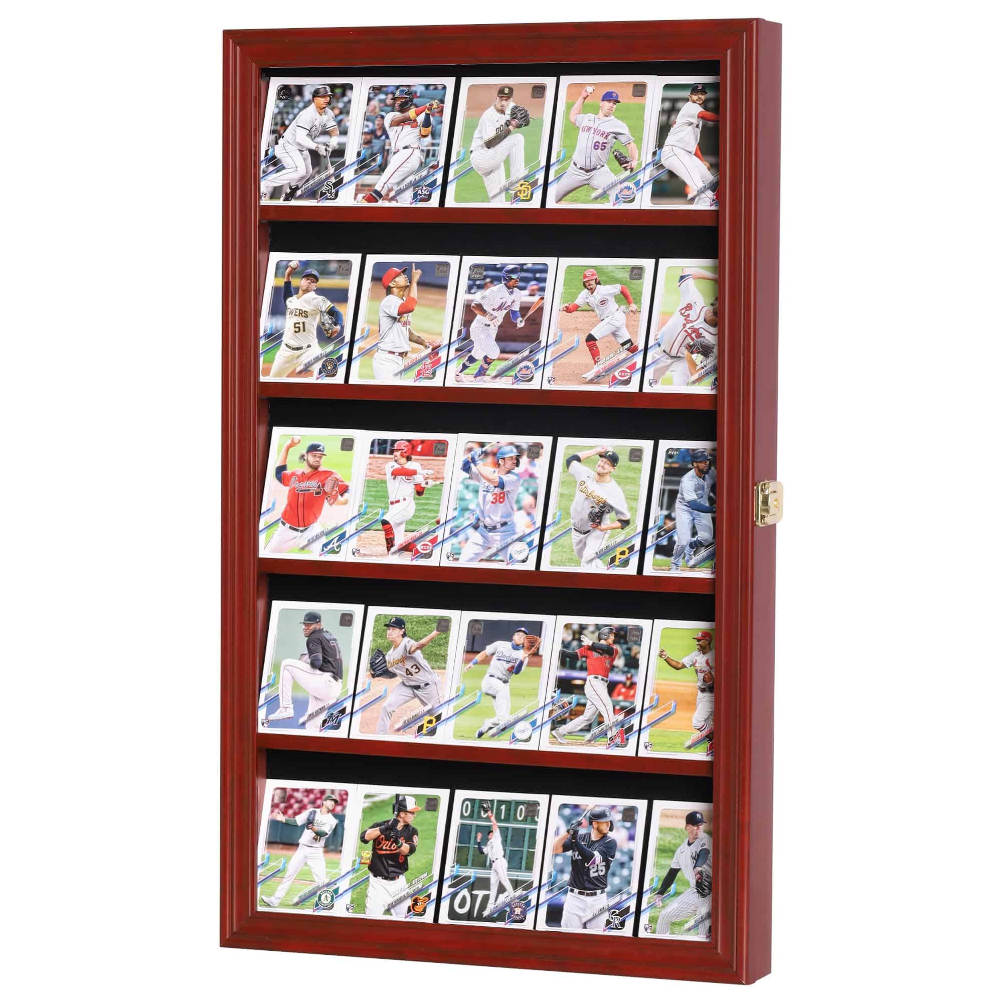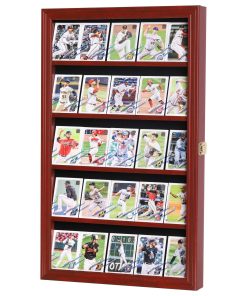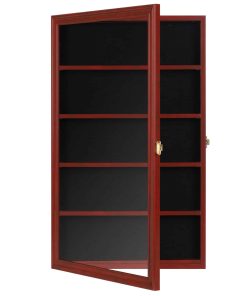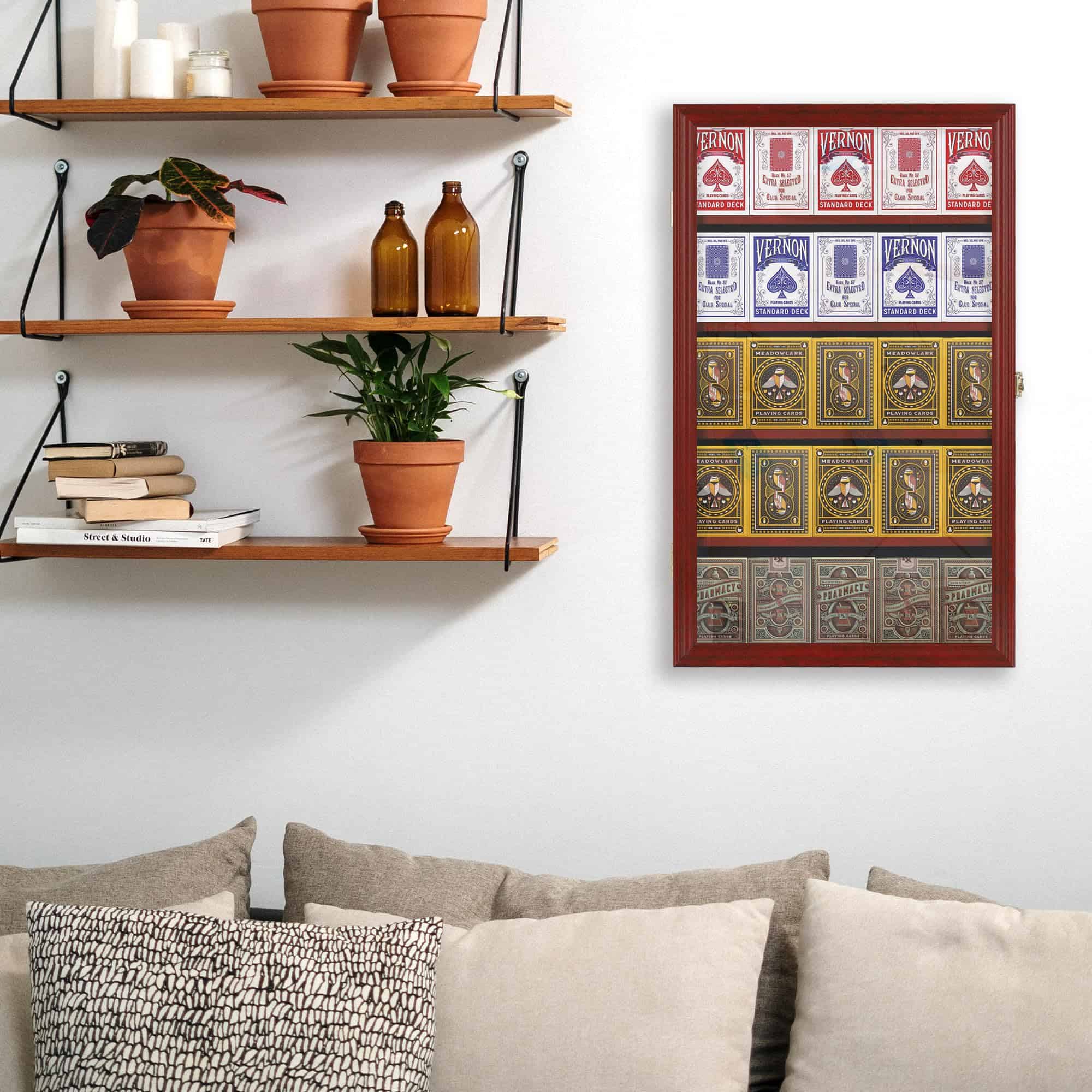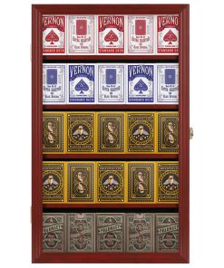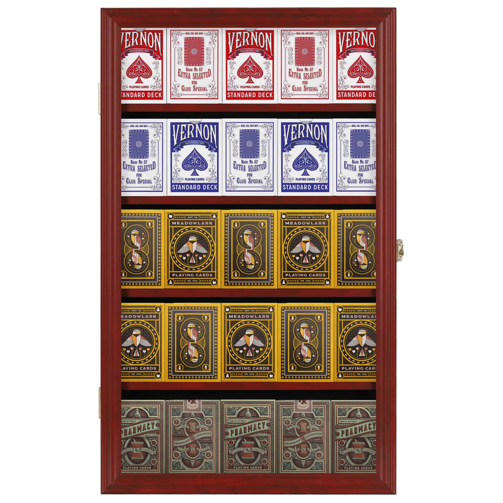 Estuche de exhibición para contener 25 barajas de cartas de tamaño regular. Apariencia elegante y suave. Cubierta de puerta de vidrio para proteger del polvo y daños. Bisagras de latón, cierres de puerta y soportes de pared para colgar (montaje en la pared). No se requiere ensamblaje.