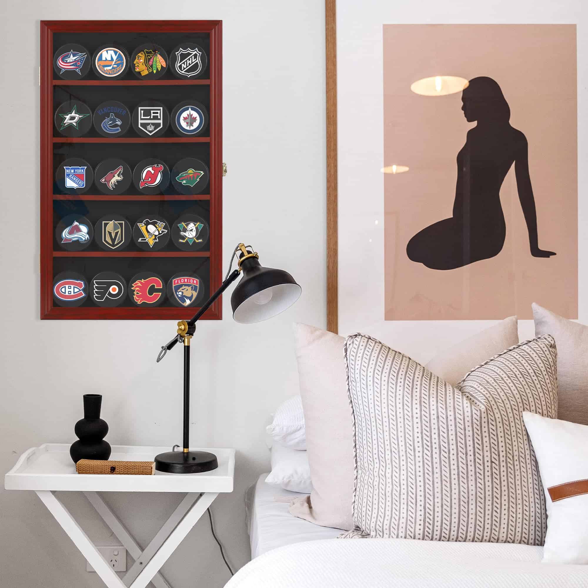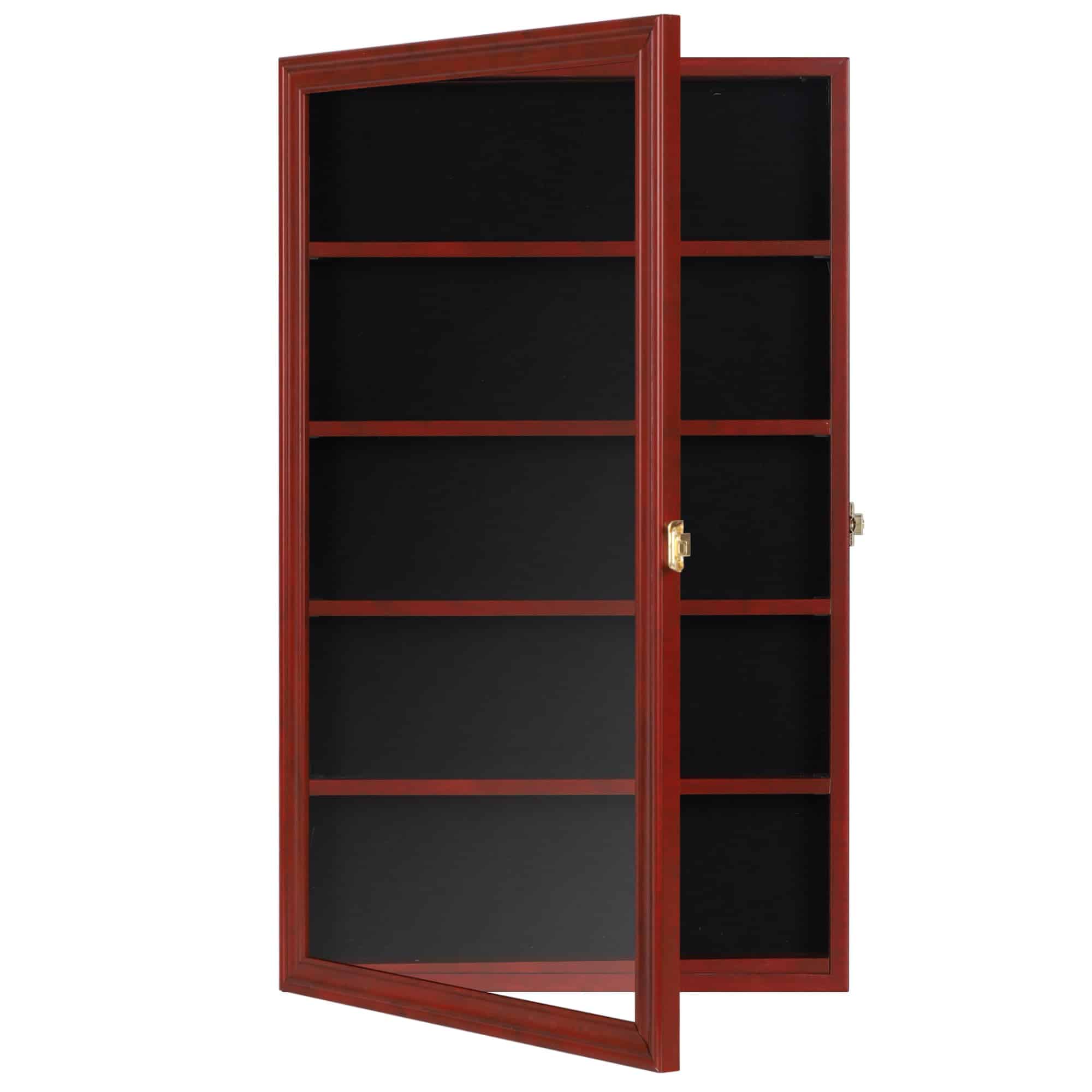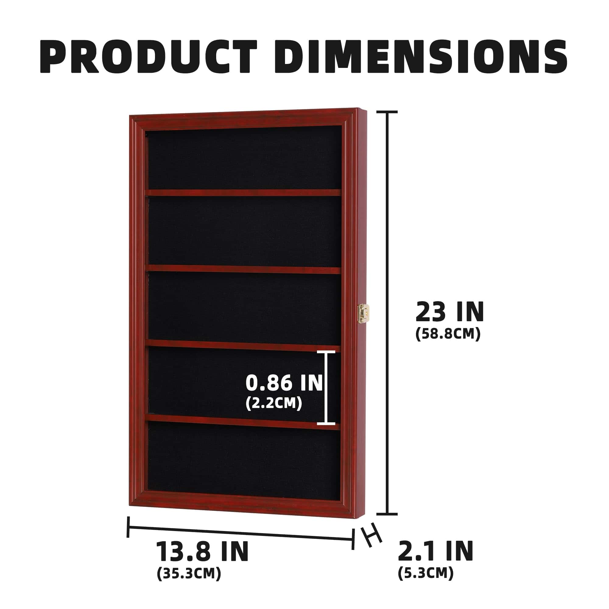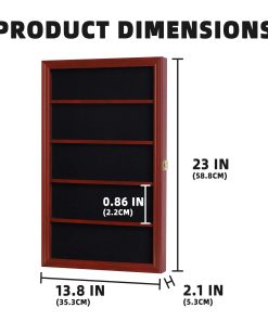 Estuche de exhibición para contener 25 barajas de cartas de tamaño regular. Apariencia elegante y suave. Cubierta de puerta de vidrio para proteger del polvo y daños. Bisagras de latón, cierres de puerta y soportes de pared para colgar (montaje en la pared). No se requiere ensamblaje.