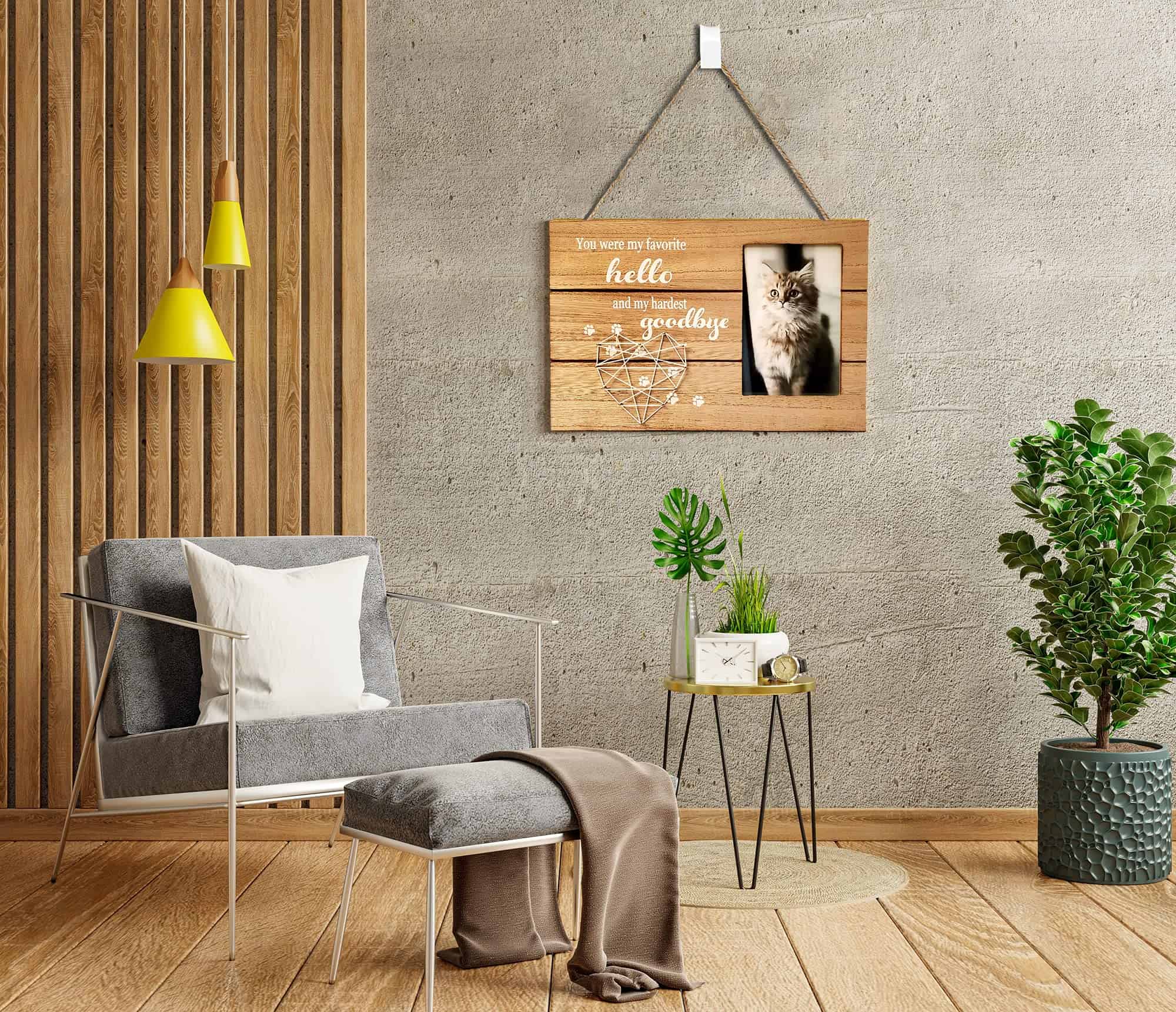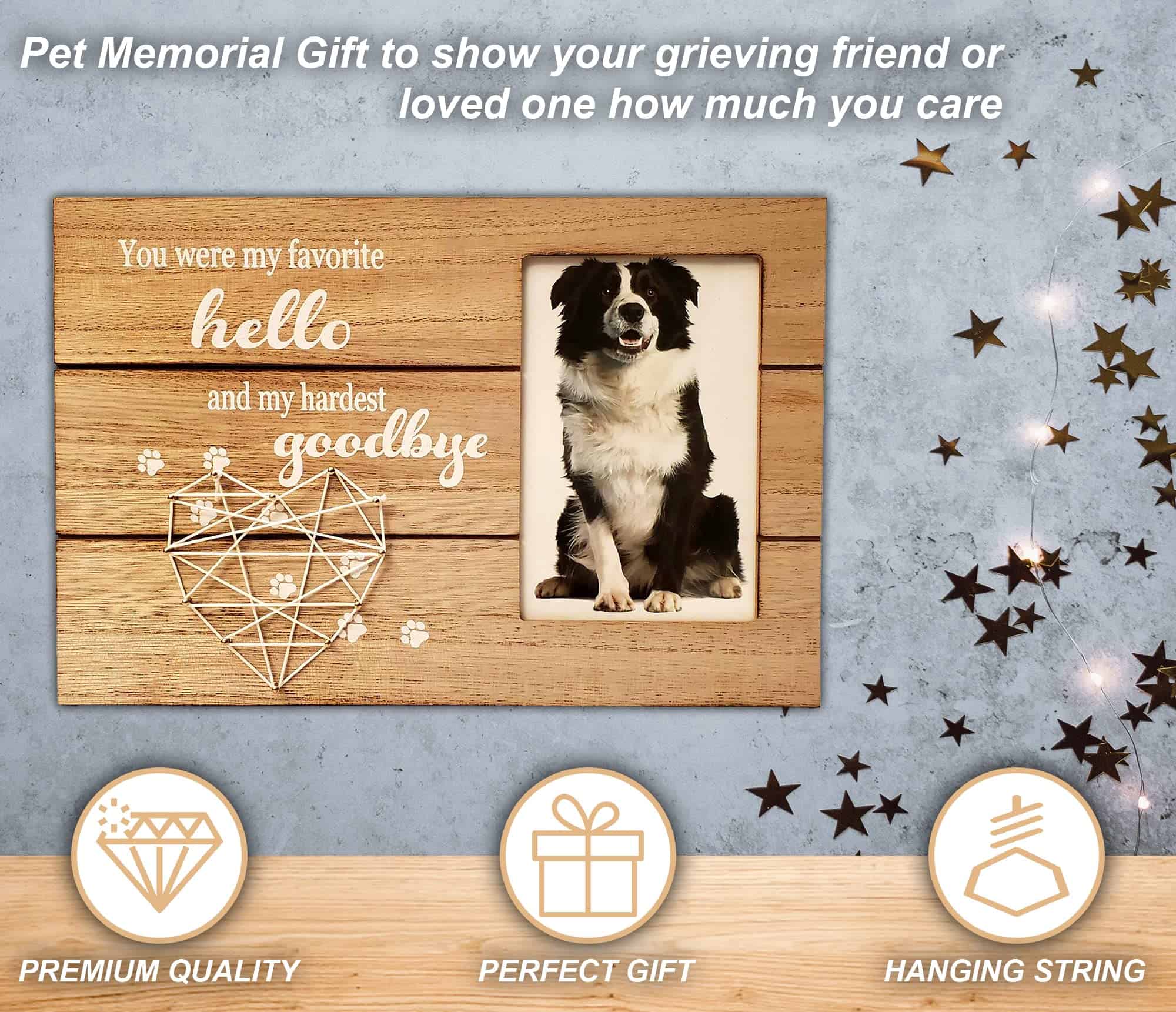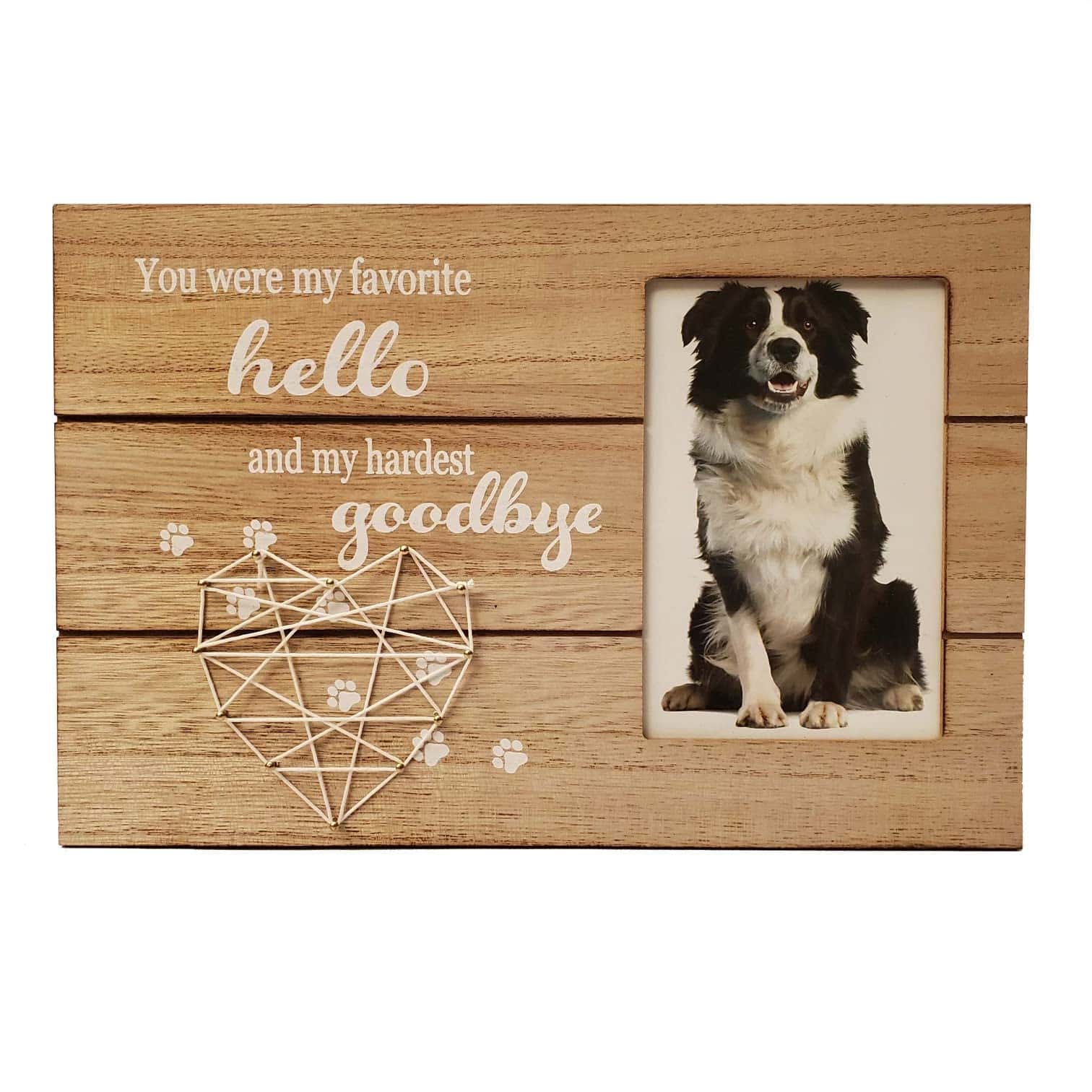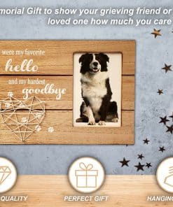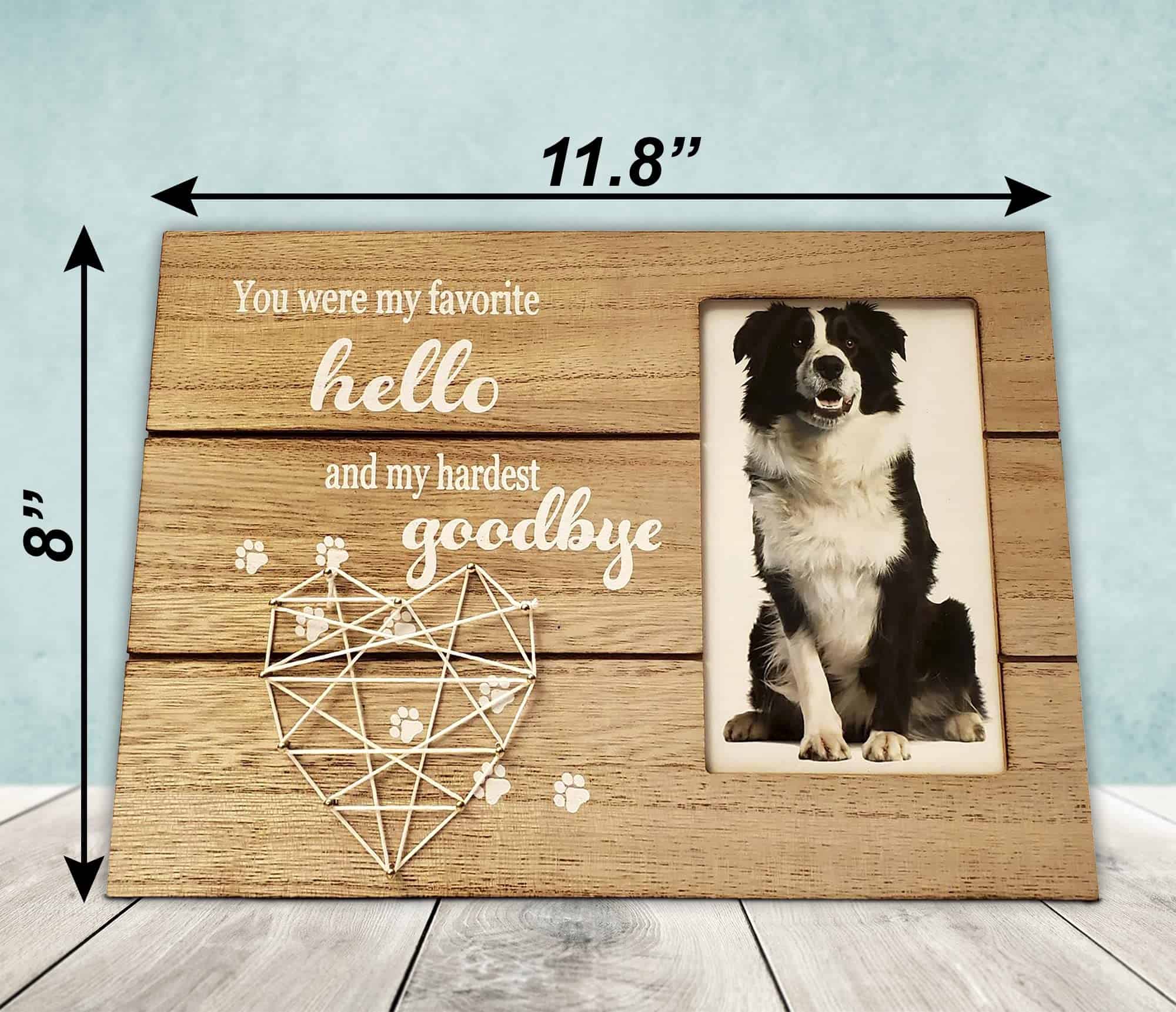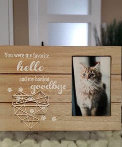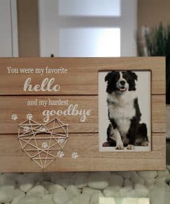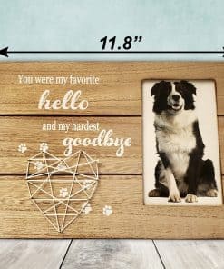 El marco puede ser utilizado para la pérdida de un preciado Gato o Perro. Por qué elegir este marco de fotos conmemorativo Listo para exhibir, ya sea colgado o en pie: Colóquelo en una mesa o cuélguelo en una pared usando la cuerda y los ganchos incluidos. Una forma de rendir homenaje a un miembro de cuatro patas de la familia. Recuerda a tu querida mascota para siempre con este marco conmemorativo. Un gran regalo para simpatía, consuelo, curación y recuerdo. Fabricado con materiales de alta calidad, el marco está hecho para durar. Características de este marco de fotos conmemorativo: Viene con un corazón de arte de cuerda hecho a mano único. Dimensiones del marco: 11.8» x 8» Sostiene una foto de 4» x 6» Marco de madera MDF Premium duradero Empaquetado en una caja que se puede envolver fácilmente y está listo para regalar. Incluye una hermosa cita: »Fuiste Mi Favorito Hola y Mi Difícil Adiós»