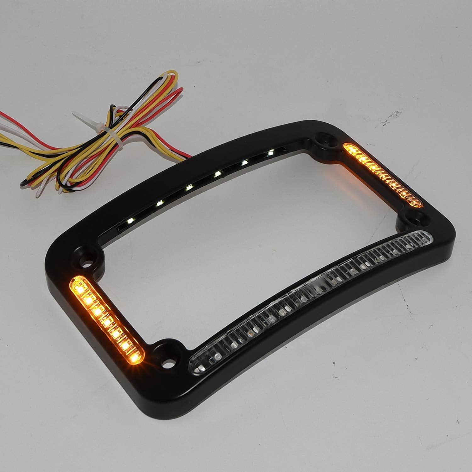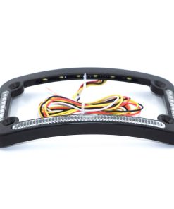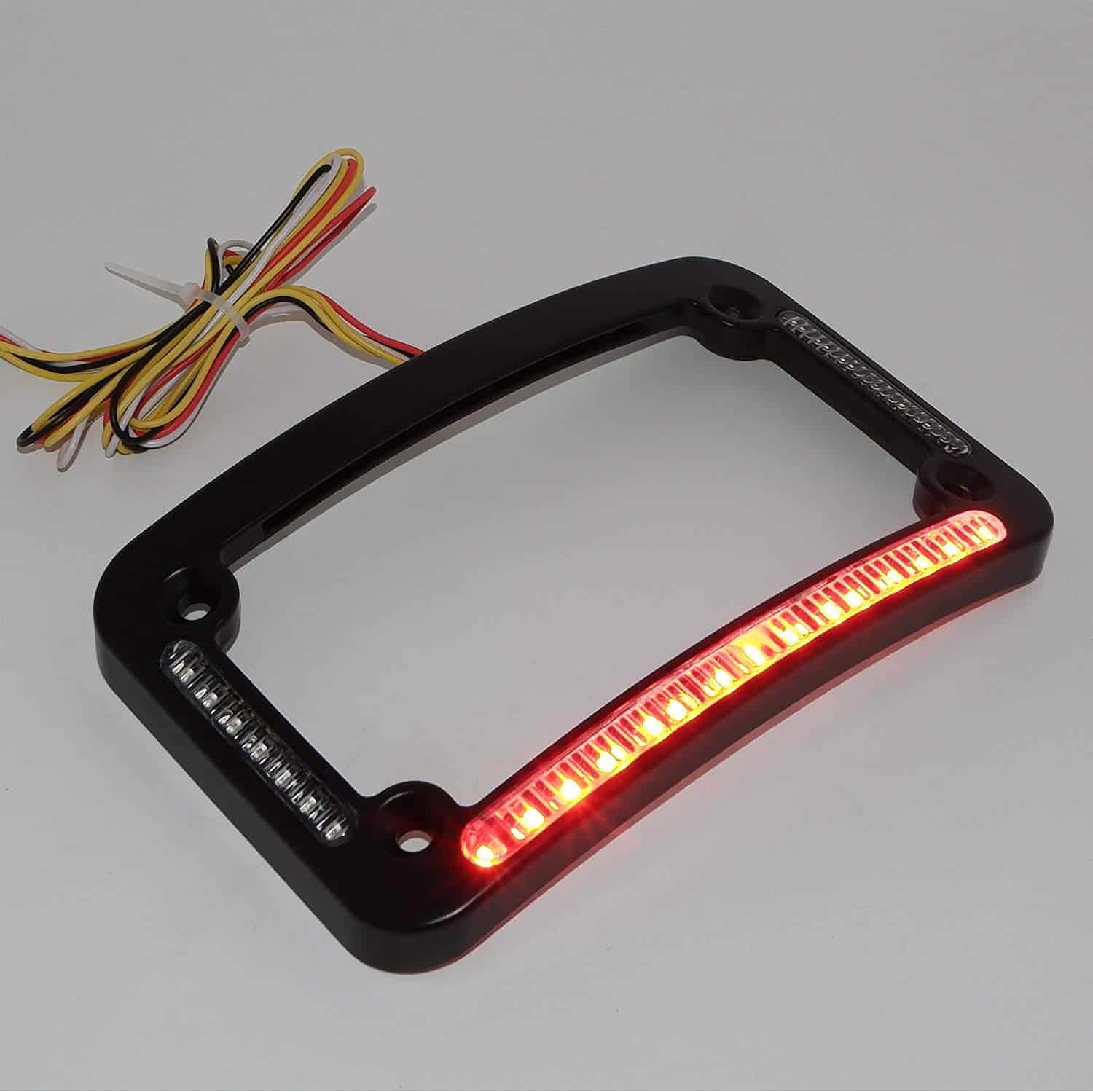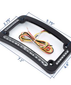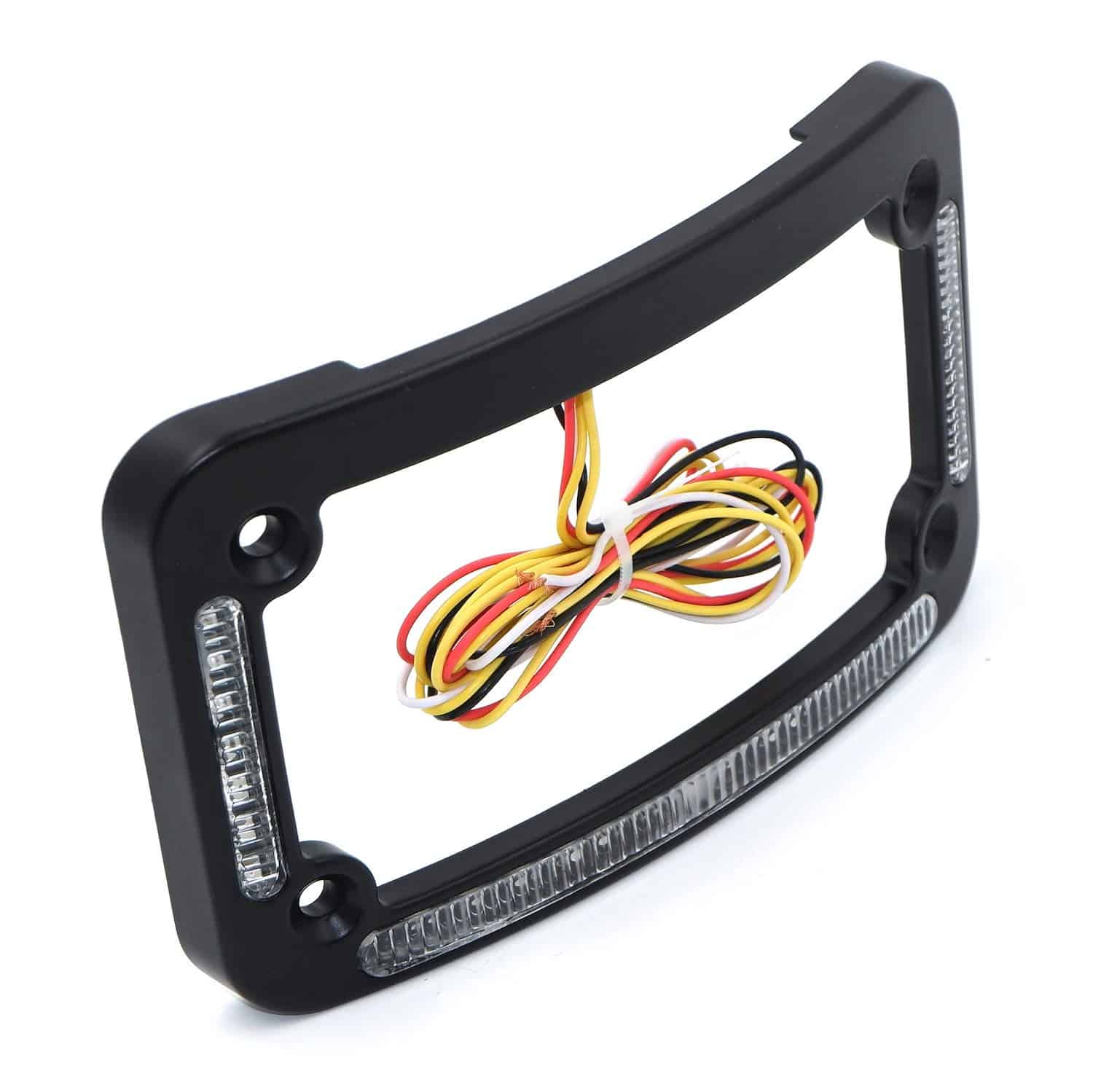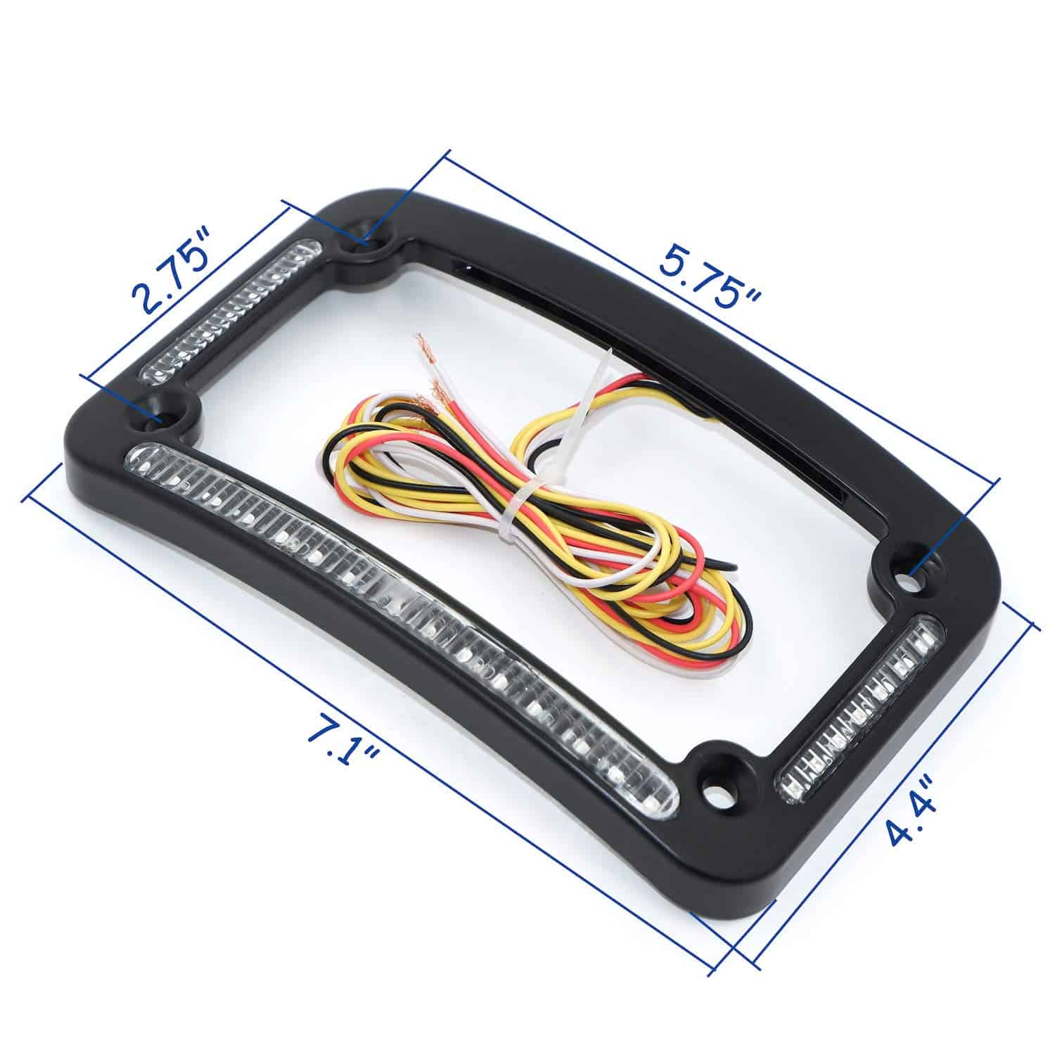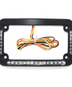 Características: Marcos de Placa de Licencia LED ‘Todo en Uno’ Curva de 12 grados para que coincida con la mayoría de los guardabarros 14 LED ámbar súper brillantes + 15 LED rojos súper brillantes para funcionar como luces de marcha, freno y giro. Incluye 6 LED blancos para iluminar la placa Requisitos de baja potencia – 12V DC, 1/4 Amperio Tamaño total del marco: 7-1/4′ x 4-1/4′ La medida de centro de agujero a centro de agujero: 5-3/4′ x 2-13/16′ Compatibilidad: Ajuste Universal: Harley/ / Kawasaki/ Suzuki/ / Springer/ Chopper/ MiniChopper/ Custom o Mini Bike