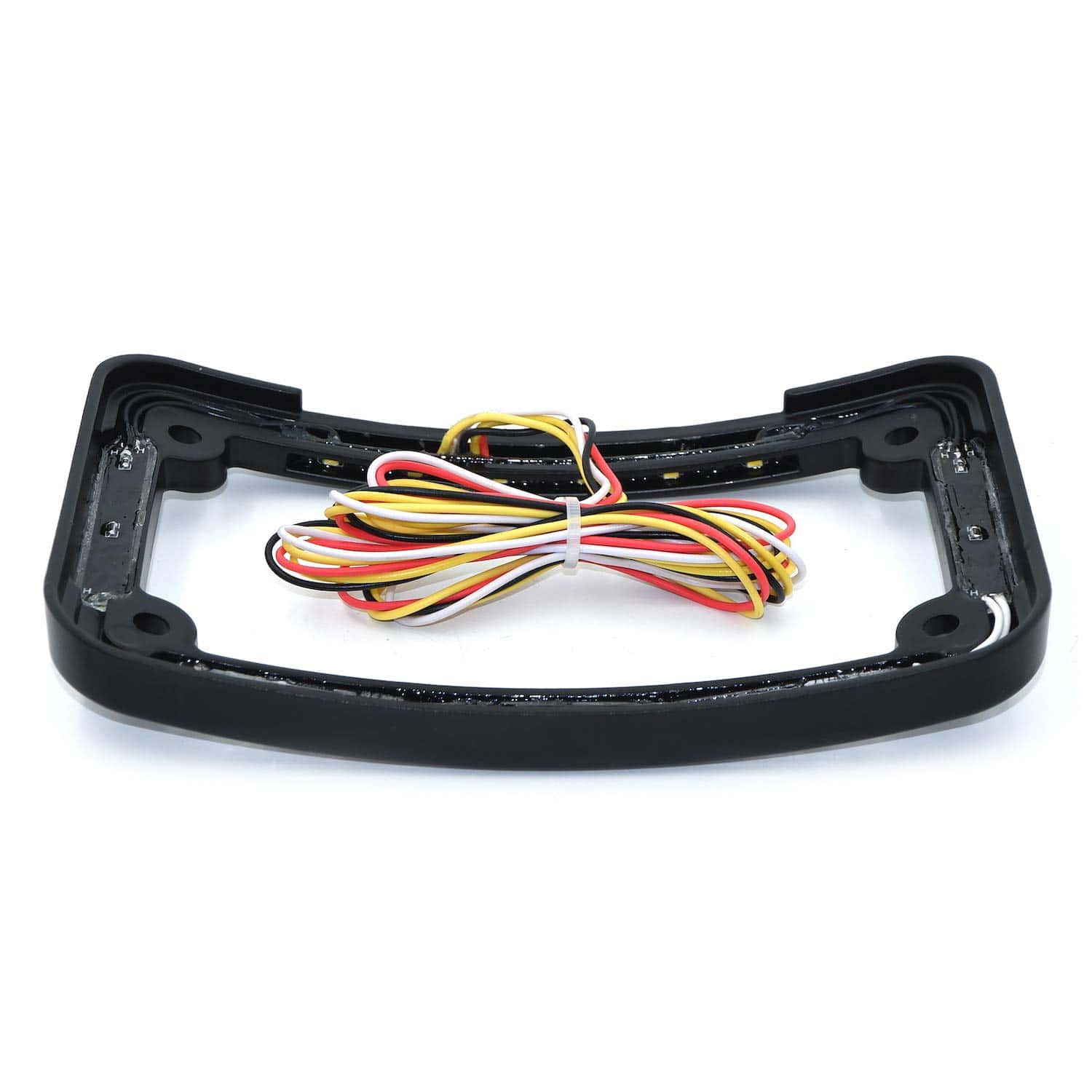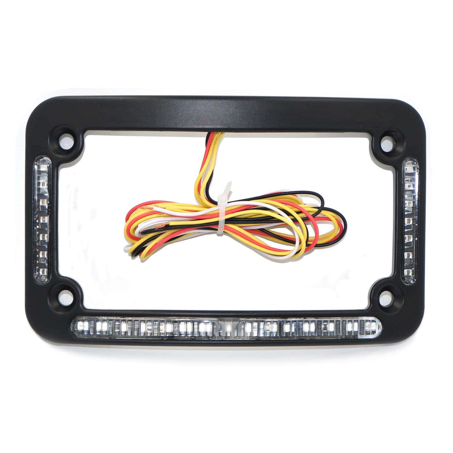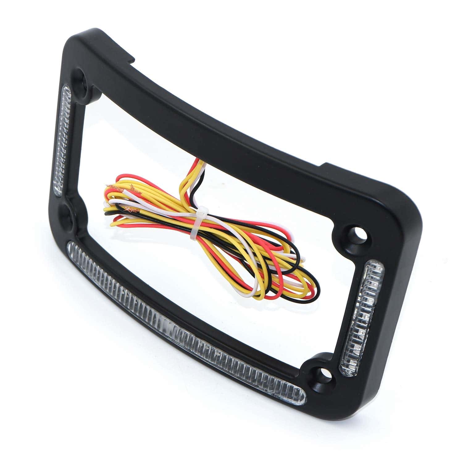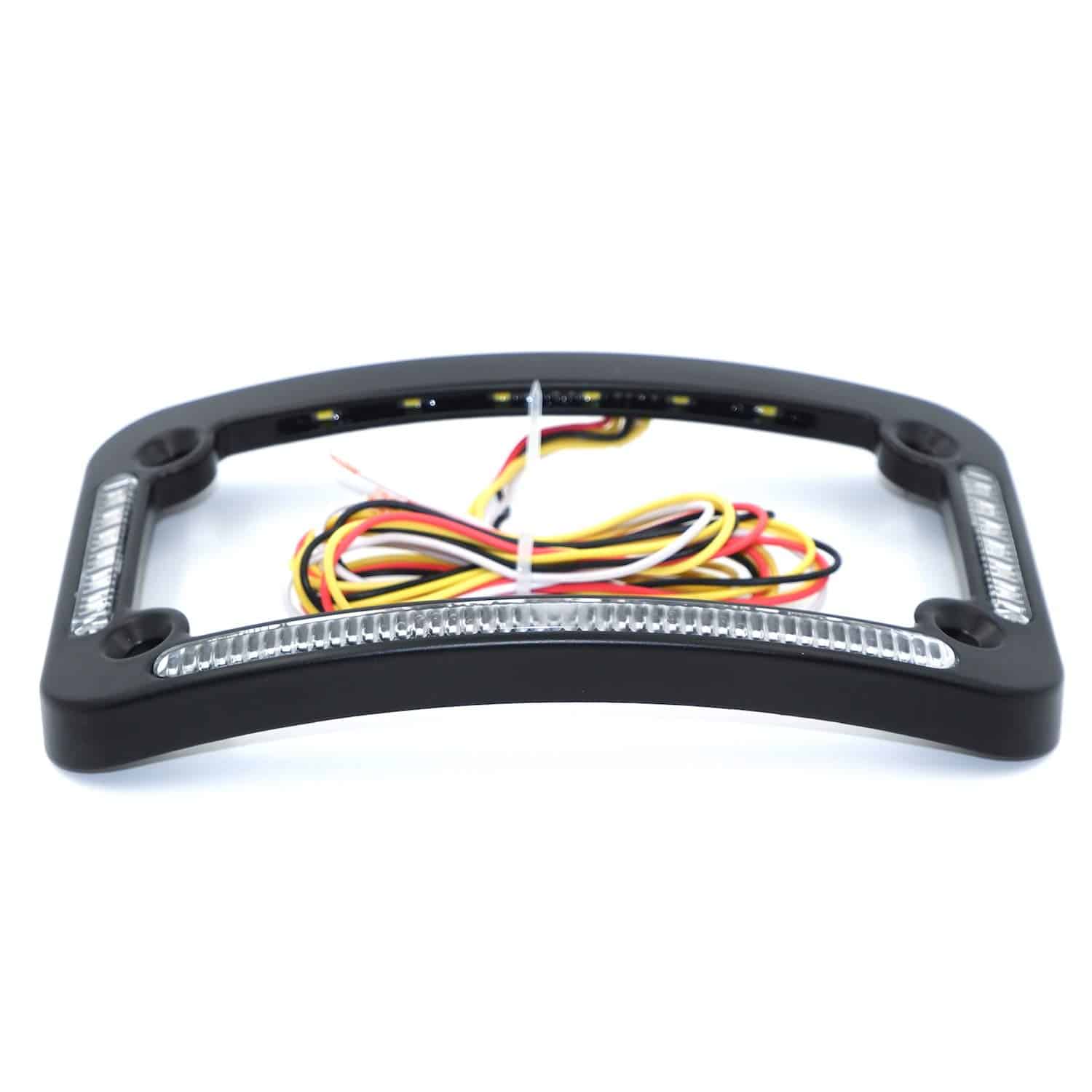 Características: Marcos de Placa de Licencia LED ‘Todo en Uno’ Curva de 12 grados para que coincida con la mayoría de los guardabarros 14 LED ámbar súper brillantes + 15 LED rojos súper brillantes para funcionar como luces de marcha, freno y giro. Incluye 6 LED blancos para iluminar la placa Requisitos de baja potencia – 12V DC, 1/4 Amperio Tamaño total del marco: 7-1/4′ x 4-1/4′ La medida de centro de agujero a centro de agujero: 5-3/4′ x 2-13/16′ Compatibilidad: Ajuste Universal: Harley/ / Kawasaki/ Suzuki/ / Springer/ Chopper/ MiniChopper/ Custom o Mini Bike