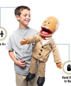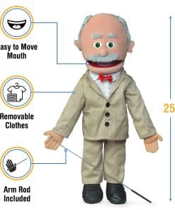 Nuestras nuevas marionetas de cuerpo completo de calidad para actuaciones en estilo ventrílocuo cuentan con una boca increíblemente fácil de mover. También vienen con una varilla de control de brazo de metal. Para aquellos que no tienen ni idea de lo que eso significa (¡no se preocupen, muchas personas preguntan!), la varilla es una «vara» de metal delgada que simplemente se sujeta a cualquier mano para el movimiento. Así es como se operan las marionetas de tipo Muppet y Sesame Street. Simplemente introduce tu mano en la ranura en la parte posterior de la marioneta para operar la boca. Al abrir y cerrar la mano, la boca de la marioneta se moverá.