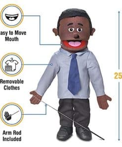 Nuestras nuevas marionetas de cuerpo completo, de calidad de rendimiento, estilo muñeco ventrílocuo cuentan con una boca increíblemente fácil de mover. También vienen con una varilla de control de brazo de metal. Para aquellos que no tienen idea de lo que significa (¡no se preocupen, mucha gente pregunta!), la varilla es una delgada «varita» de metal que simplemente se sujeta a cualquier mano para el movimiento. Así es como se operan las marionetas tipo Muppet y Sesame Street. Simplemente inserta tu mano en la ranura en la parte posterior de la marioneta para operar la boca. Al abrir y cerrar tu mano, la boca de la marioneta se moverá.