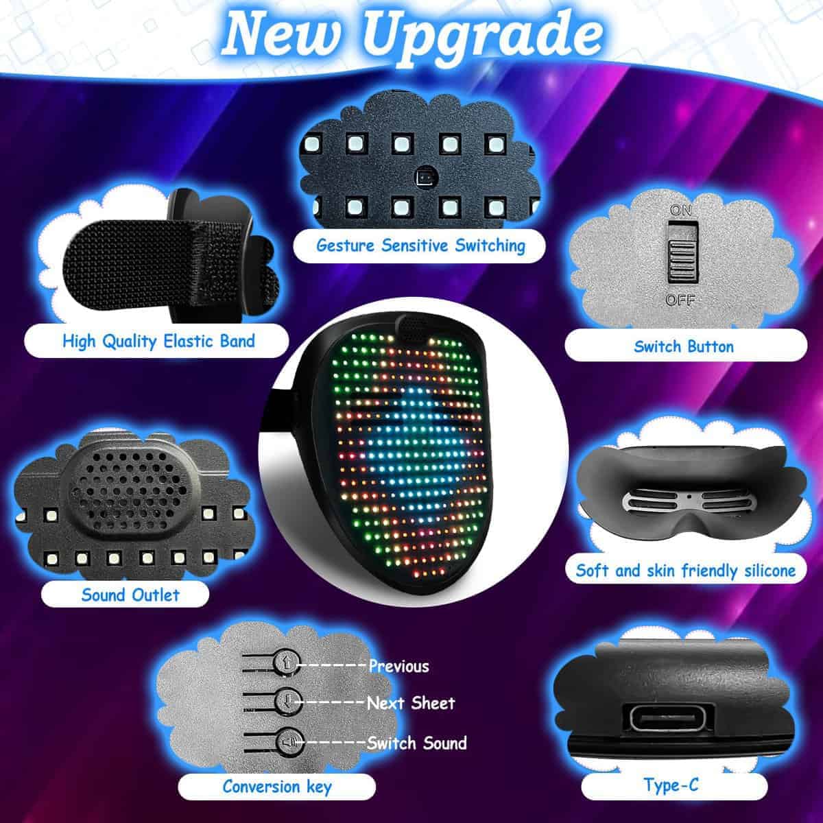 La máscara Led COOLGUARDER cuenta con 35 modos de visualización dinámica y 25 imágenes estáticas con efectos de sonido. Puede ajustarse a un solo color, flash, degradado, suave y patrones de varios colores. La máscara Led se activa por gestos para facilitar su uso, con una carga de 3-4 horas y una duración de 8-10 horas. Hecha de plástico resistente y esponja suave, es cómoda de llevar durante mucho tiempo. La máscara Led combina novedad y diversión con tecnología para hacerte destacar en todas las fiestas. Perfecta como regalo para niños, hombres y mujeres, adecuada para cosplay, mascaradas, fiestas de cumpleaños, Halloween, Navidad, Carnaval y festivales de música electrónica.