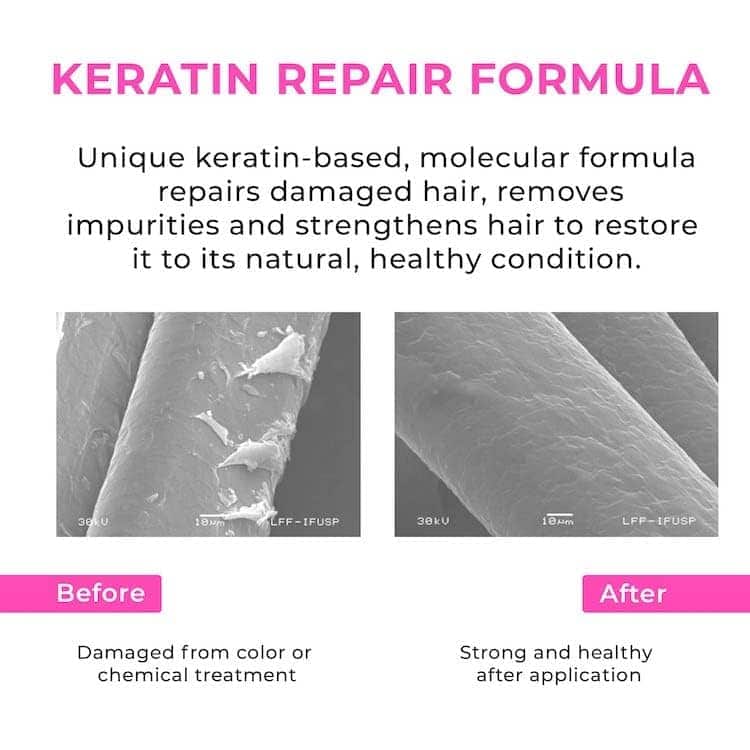 Además, esta mascarilla de keratina garantiza una hidratación profunda de larga duración, desde la raíz hasta las puntas del cabello, gracias a ingredientes como los lípidos Sensoveil y Serasil, que reorganizan las cutículas y mejoran la textura del cabello. Las nanopartículas catiónicas y el ingrediente Hidragloss reemplazan la masa proteica, protegen las cutículas dañadas y proporcionan brillo y nutrición al cabello.
