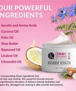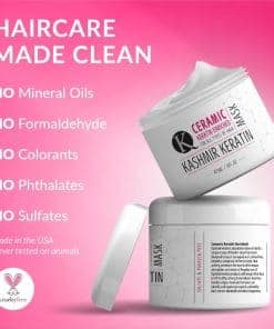 La Mascarilla Capilar de Keratina Kashmir Keratin es segura y natural de usar, libre de sulfatos, parabenos y formaldehído. Además, este producto no ha sido probado en animales, asegurando una experiencia ética y libre de crueldad. Adecuada para todo tipo de cabello, esta mascarilla ofrece numerosos beneficios, incluida la reestructuración del cabello, acondicionamiento profundo, brillo, fuerza y resistencia, además de reparar el daño capilar de manera absoluta.