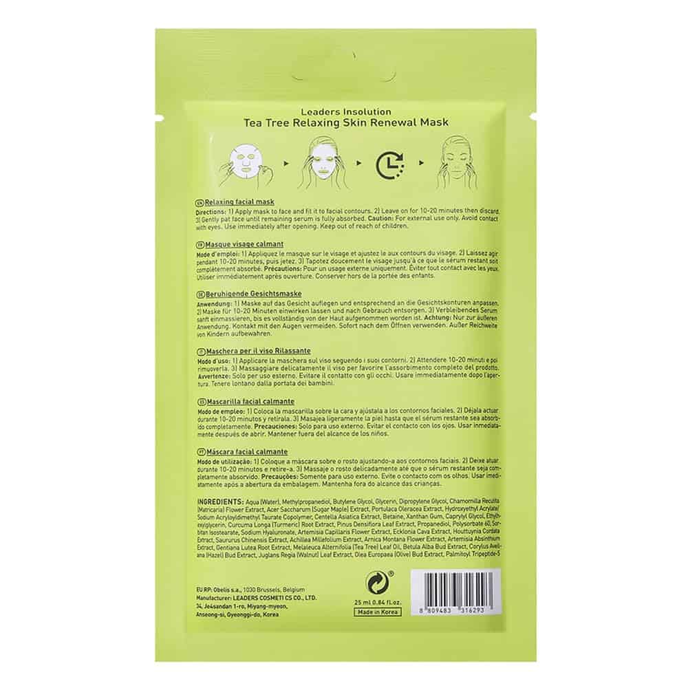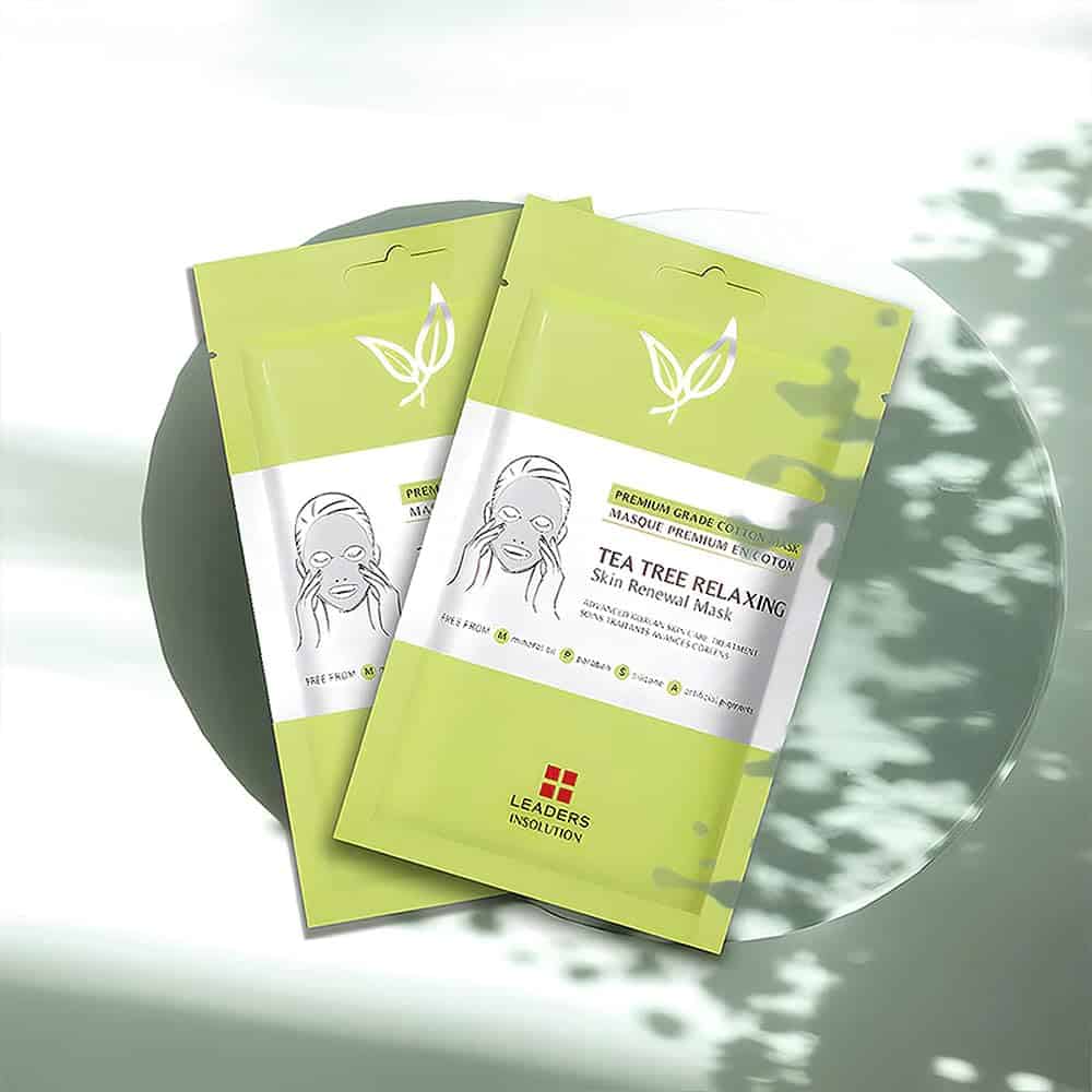 5. GARANTÍA DE CALIDAD DE LEADERS Fabricadas en Corea del Sur por Leaders, una reconocida marca de cuidado de la piel con su propio centro de I+D y instalaciones de producción, cada producto se somete a rigurosas pruebas para garantizar la más alta calidad y efectividad. Las Mascarillas de Renovación de Piel Relajante de Árbol de Té de Leaders Insolution son fáciles de usar: Limpia y prepara la piel con tónico. Retira la máscara del empaque y ajústala a los contornos faciales. Deja actuar durante 10-20 minutos para obtener resultados óptimos. Masajea suavemente el suero adicional en el rostro y el cuello hasta que se absorba por completo.