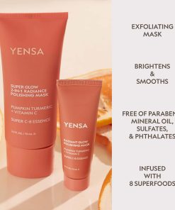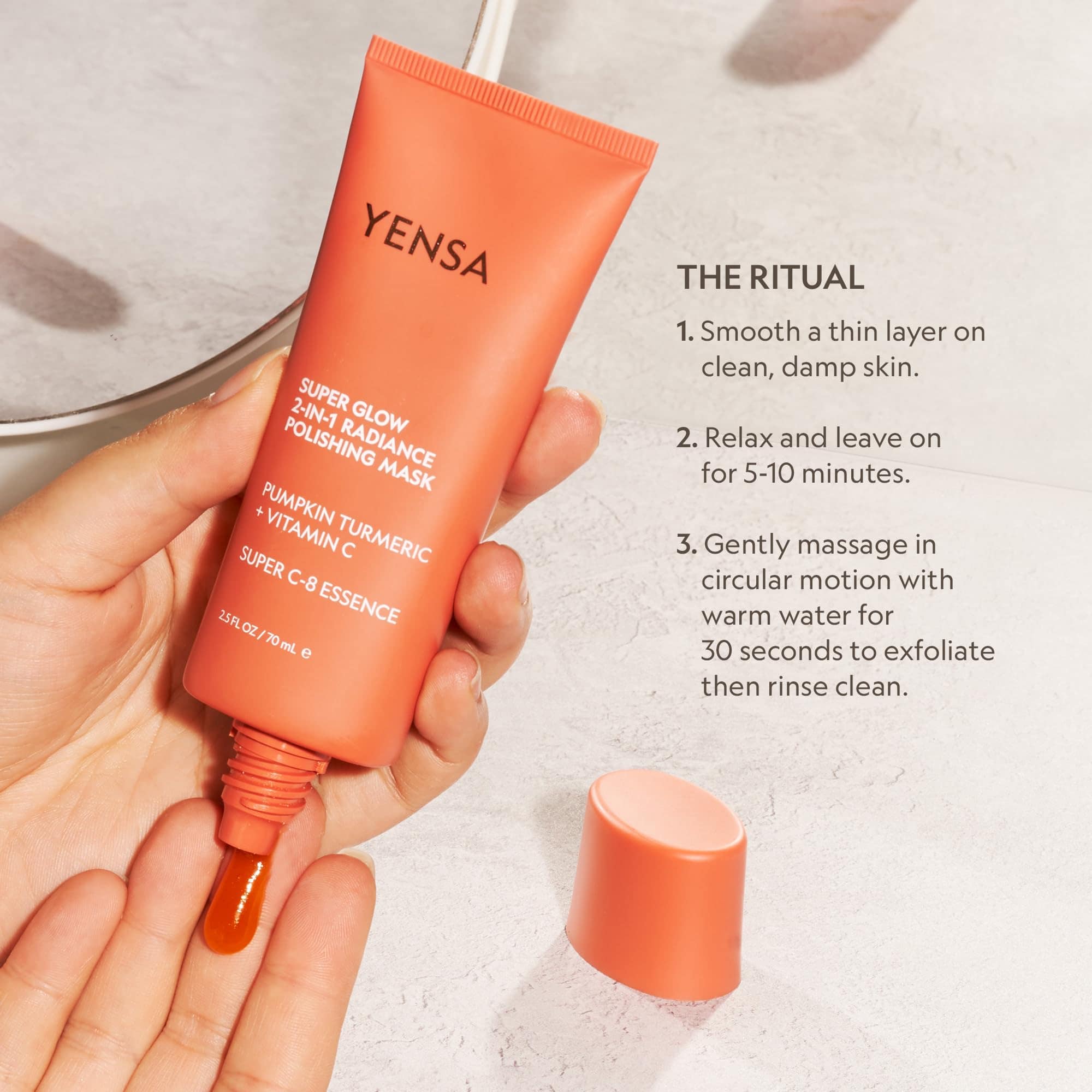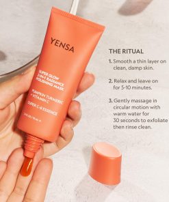 Mascarilla Exfoliante y Hidratante YENSA Super Glow: Renueva tu piel con la mascarilla exfoliante y hidratante 2 en 1 de YENSA. Esta potente fórmula dual actúa como un exfoliante facial para suavizar la textura de la piel, al mismo tiempo que funciona como una mascarilla iluminadora para revelar un resplandor radiante. La calabaza estimula la producción natural de colágeno, mientras que la papaya, el jengibre y la cúrcuma actúan como una solución exfoliante calmante para reducir visiblemente la decoloración y promover un cutis uniforme. Potenciada por 8 esencias SuperOrange, esta mascarilla facial está repleta de calabaza, cúrcuma, papaya, pomelo y jengibre para hidratar, calmar y potenciar el resplandor de la piel, mientras actúa como un suave exfoliante facial. Para usarla, aplica una capa fina sobre la piel limpia y húmeda, déjala actuar durante 5-10 minutos y masajea suavemente con movimientos circulares y agua tibia durante 30 segundos. Úsala de 3 a 4 veces por semana para obtener mejores resultados. YENSA se compromete a crear una nueva era de belleza con superalimentos al combinar la Ciencia de los Superfoods moderna con poderosos rituales asiáticos probados para nutrir y mejorar la piel con el tiempo. Cada producto YENSA, incluida esta mascarilla facial exfoliante, está infundido con 8 mezclas de superalimentos para promover un envejecimiento grácil e inspirarte a enfrentar el mundo con confianza y ¡Vive Tu Yen!