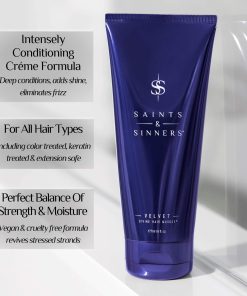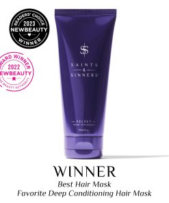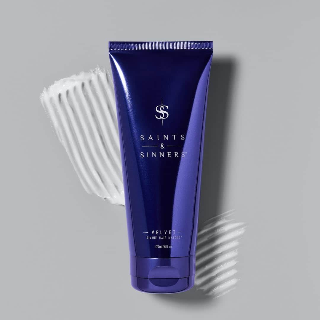 Mascarilla para el cabello Velvet Divine de Saints & Sinners, un tratamiento intensamente acondicionador que elimina el daño causado por químicos, aparatos de calor y el estrés ambiental. Ideal para cabello seco, encrespado, tratado químicamente, rizado, dañado térmicamente, rebelde, grueso y sediento de humedad. Añade un brillo brillante, humedad, peinabilidad, fuerza y manejabilidad mientras elimina el encrespamiento. Formulada sin gluten, parabenos, ftalatos, óxidos de hierro, aceites minerales, petrolato, colores sintéticos, ingredientes con nueces, aceite de palma y 100% vegana. Crueldad libre.