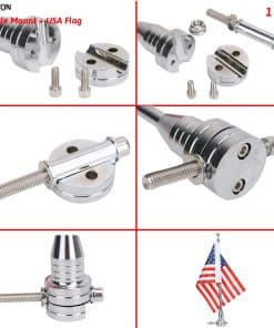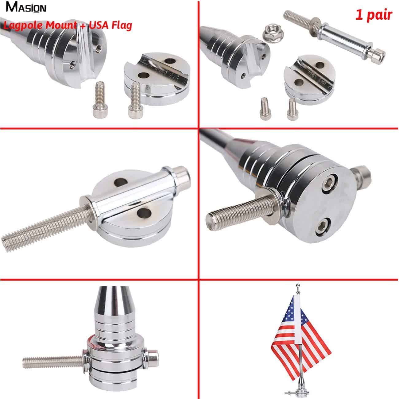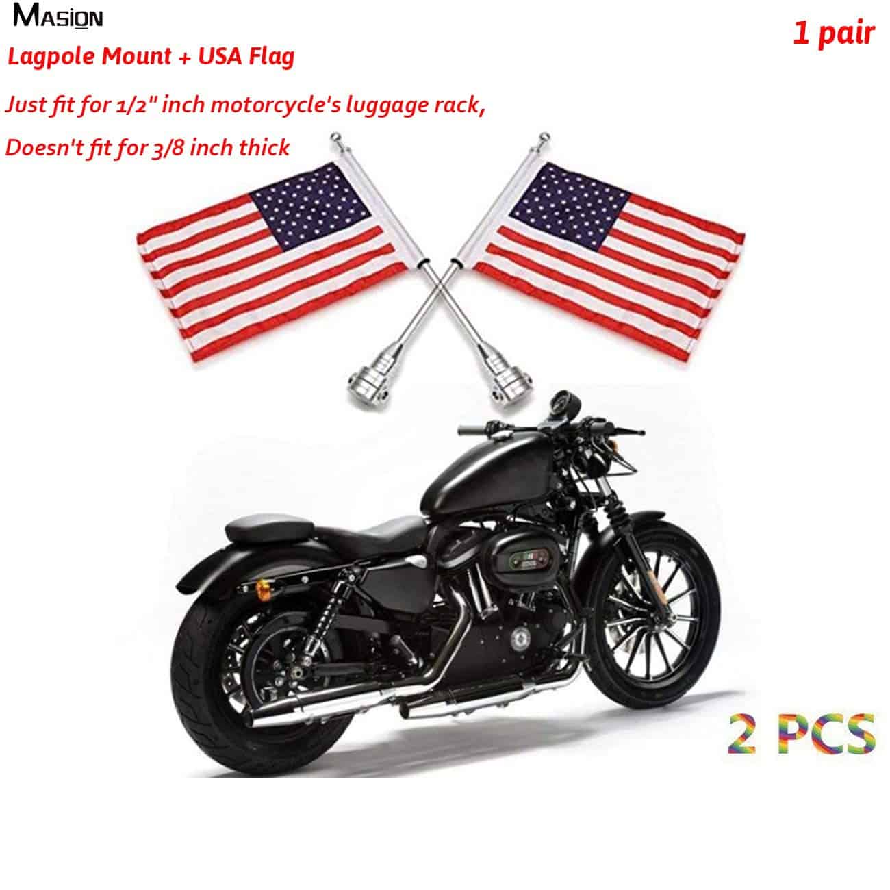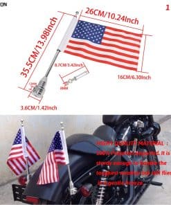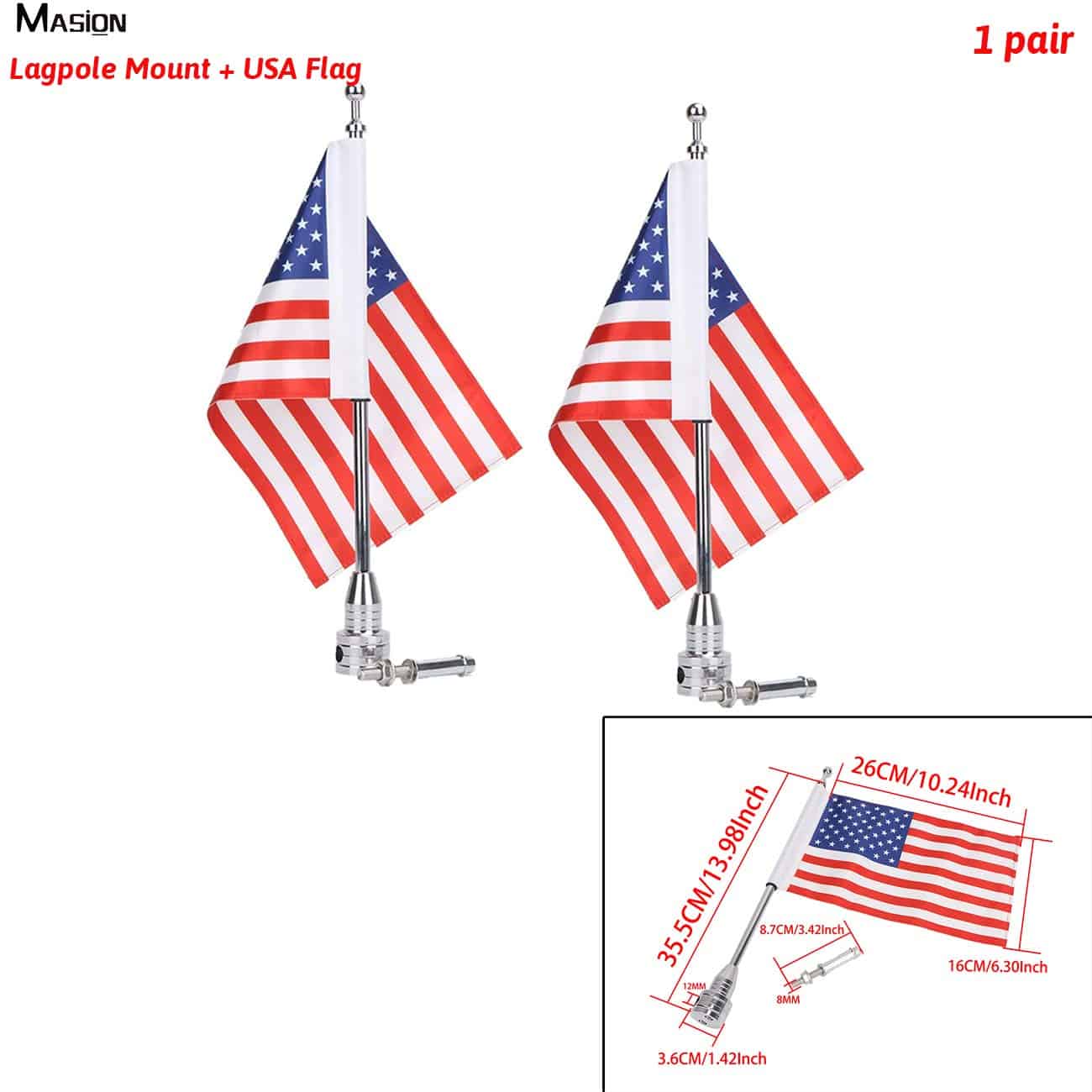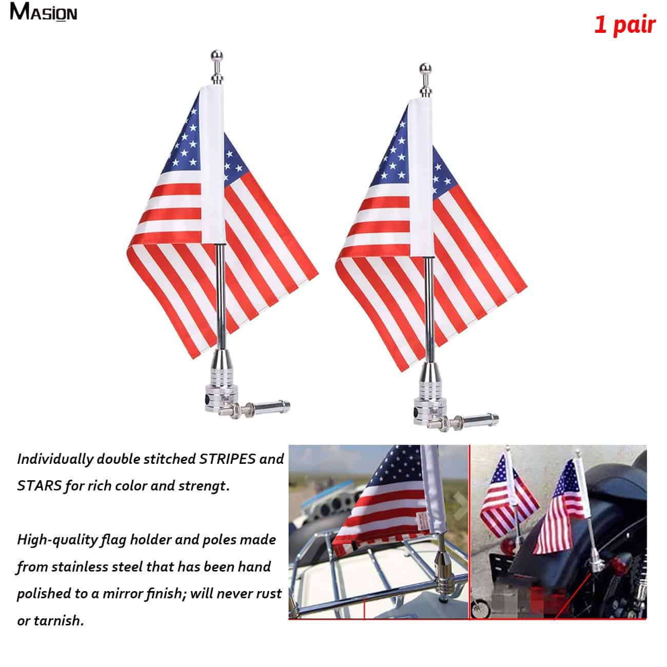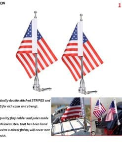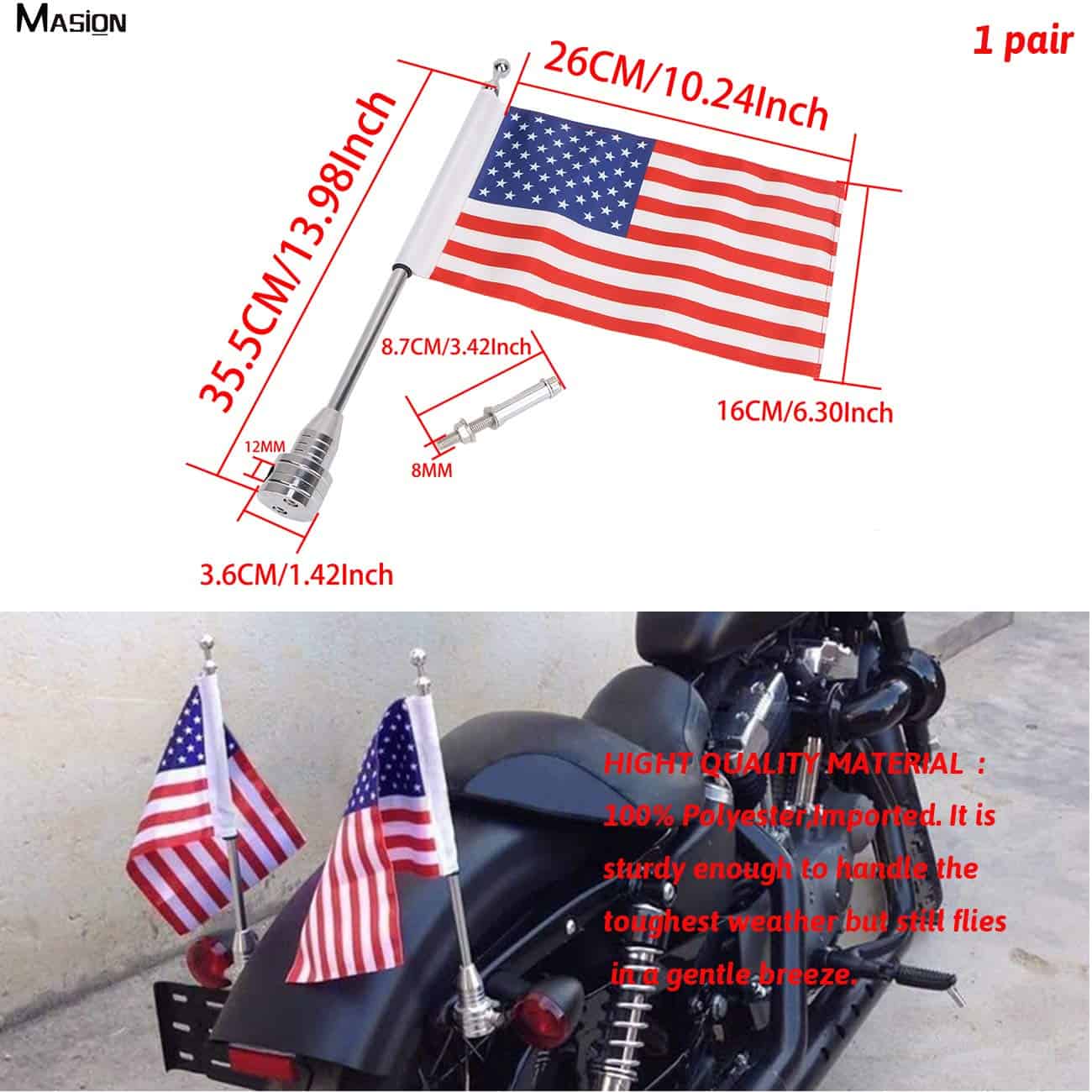 Incluye 2 banderas de alta calidad para motocicletas. Diseño de la bandera roja americana. Compatible con diversas marcas como Harley Davidson, Yamaha, Honda, Goldwing, CB, VTX, CBR. Fabricado con acero inoxidable cromado resistente.