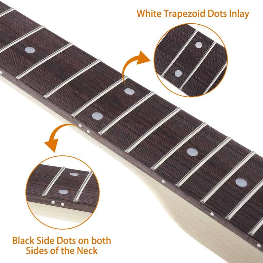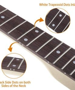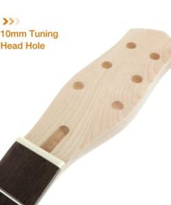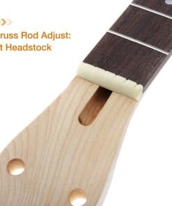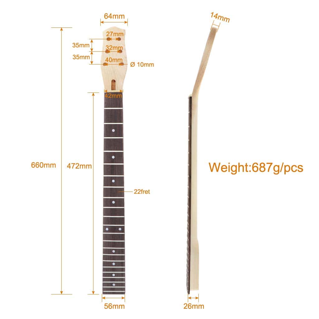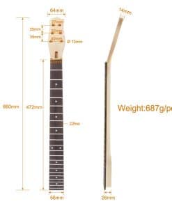 Especificaciones: Madera del mástil: Arce Marcadores de posición: blancos Ancho en la cejuela: Aprox. 4.2cm Ancho del talón: 5.06cm Profundidad del talón: Aprox. 2cm (0.8in); con diapasón 2.6cm (1in) Trastes: 22 trastes Diámetro de los agujeros de las clavijas: 10mm Longitud total del mástil de la guitarra: Aprox. 67cm Incluye: 1 x Mástil de Guitarra