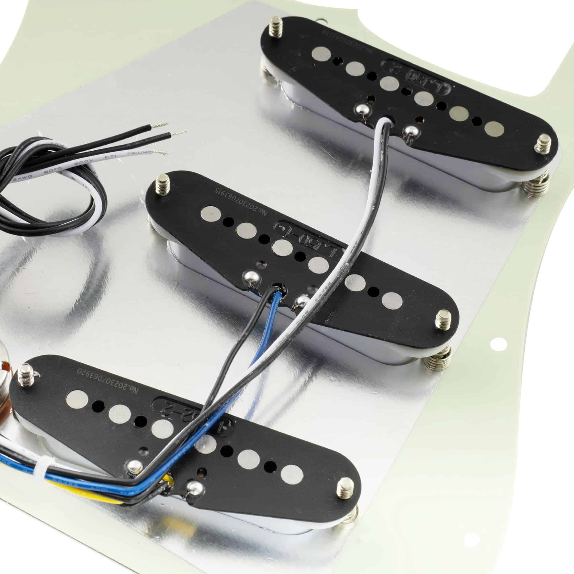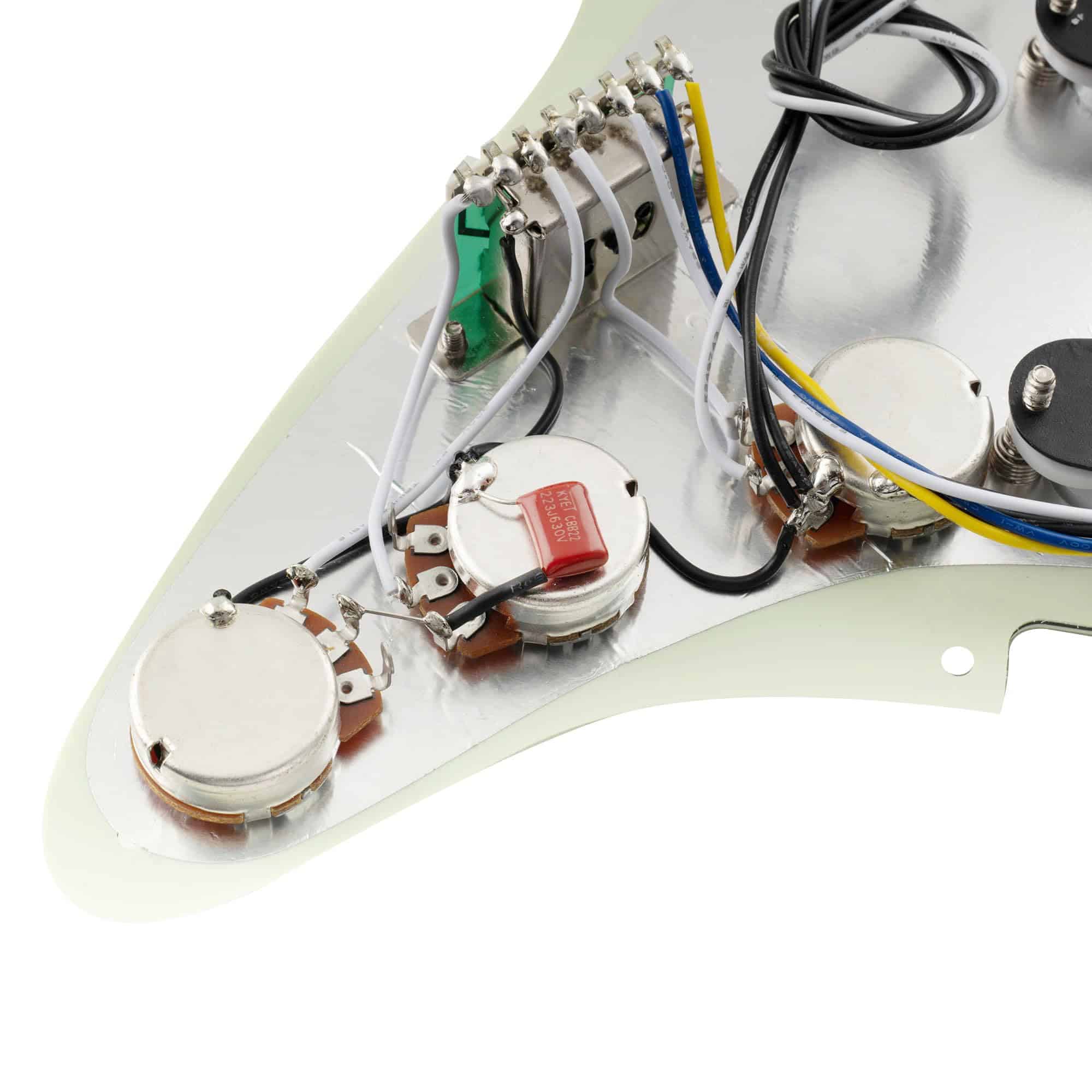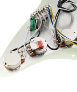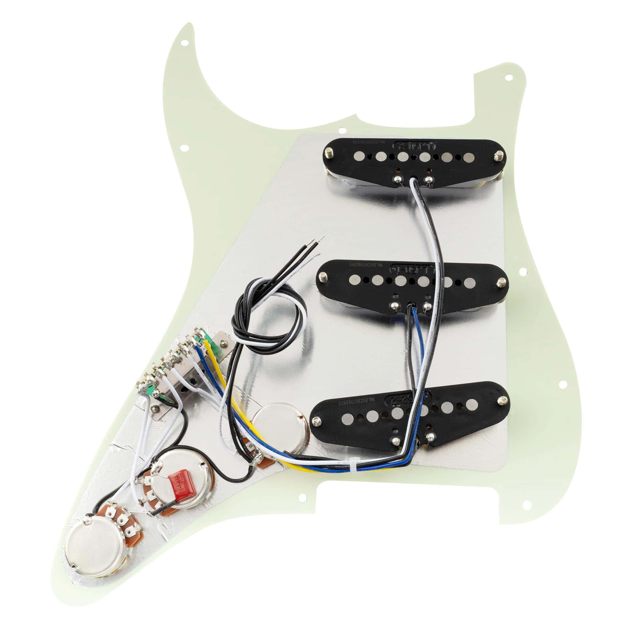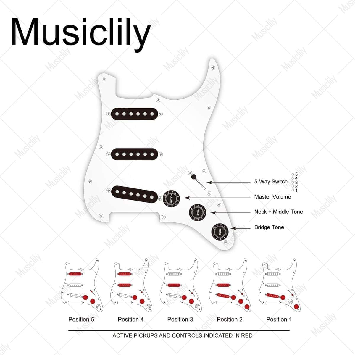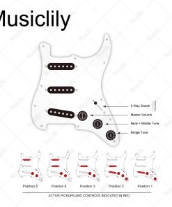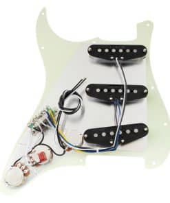 Bueno para mejorar Squier Strat SSS u otra guitarra de importación de estilo similar, también es compatible con la mayoría de las guitarras eléctricas de estilo Strat SSS modernas de estándar americano/mexicano, lleva tu tono al siguiente nivel. Cuenta con pastillas de bobina simples con imanes de Alnico 5 escalonados (5.8K/5.8K/7.2K), tonos de estilo vintage, similares a las pastillas F Custom 69 Strat, piezas de polo escalonadas para una salida equilibrada, pastilla media con devanado y polaridad inversa (RWRP) para cancelación de ruido, produciendo agudos claros, transparentes y graves intensos, funciona especialmente bien con pedales permitiendo que los graves resuenen y los agudos se eleven. Construido a mano en casa con piezas seleccionadas, atención a cada detalle durante el cableado, pruebas adecuadas realizadas por técnicos experimentados. Viene con la guía del usuario que incluye un diagrama de cableado profesional para resolver tu problema de cableado. El paquete incluye: 1 pickguard pre-cableado. Pastillas (Mástil/Media/Puente): Resistencia es de 5.8K/5.8K/7.2K, Imán: Alnico 5, Espaciado de polo: 50mm/50mm/52mm; Potes: A250K(T) x 2 + B250K(V); Interruptor de 5 posiciones de estilo de importación; Capacitor .022 F; Cables de PVC