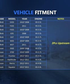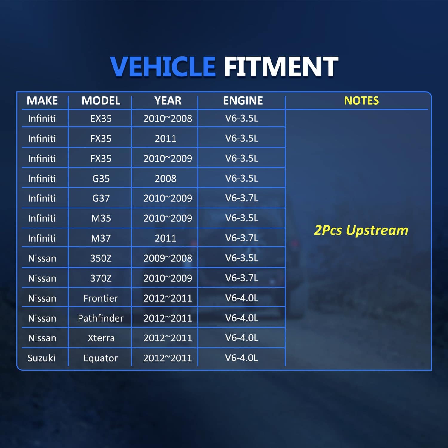 MAXFAVOR 2Pcs Sensor de Oxígeno de Repuesto para 2011 2012 Nissan Frontier Pathfinder Xterra Suzuki Equator 4.0L, para 2009 2010 Infiniti EX35 FX35 G37 M35 Nissan 350Z 370Z 3.5L 3.7L 234-9036 X2. Este sensor de oxígeno es ideal para una variedad de modelos de Nissan e Infiniti. Asegúrese de verificar la compatibilidad con su vehículo antes de comprarlo. La instalación es sencilla, siga los pasos detallados en las instrucciones. Cuenta con una garantía de 1 año y millas ilimitadas para su tranquilidad. Si tiene alguna pregunta, nuestro equipo de atención al cliente estará encantado de ayudarle.